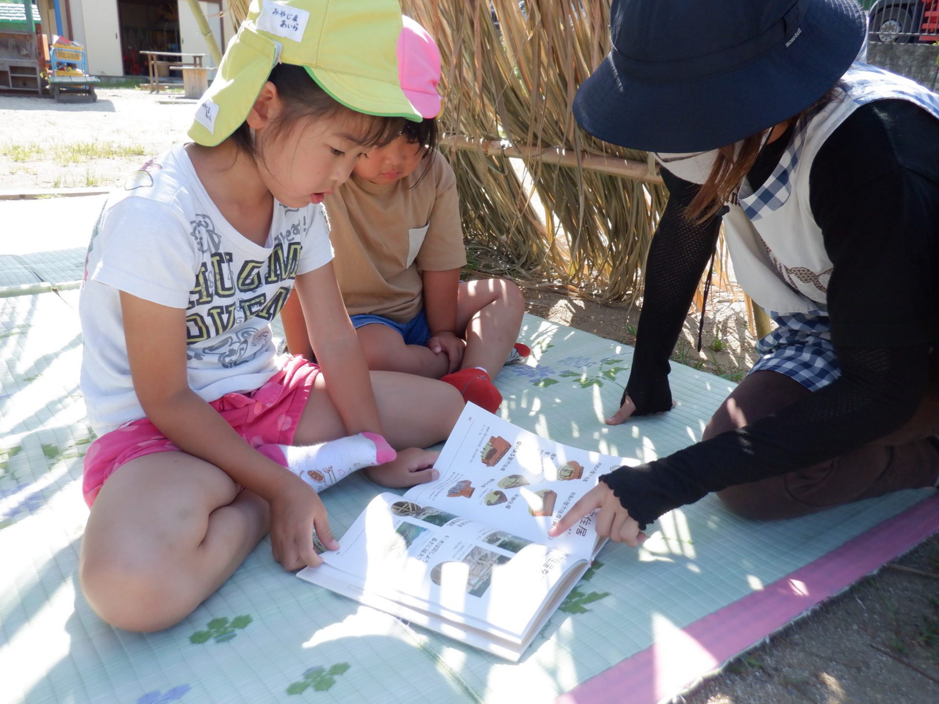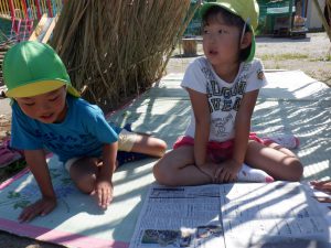 縄文時代に興味を持った子どもたち。おじいちゃん先生が作った「住居」で縄文の絵本を広げます。