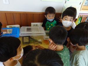 「げんきがないね」「ごはんたくさんたべてね」「おおきくなるんだよ」など生き物に対しても思いやりの心をより持てるようになりました。今後も友達や生き物に思いやりの気持ちを忘れずに過ごしていってほしいなと思います。