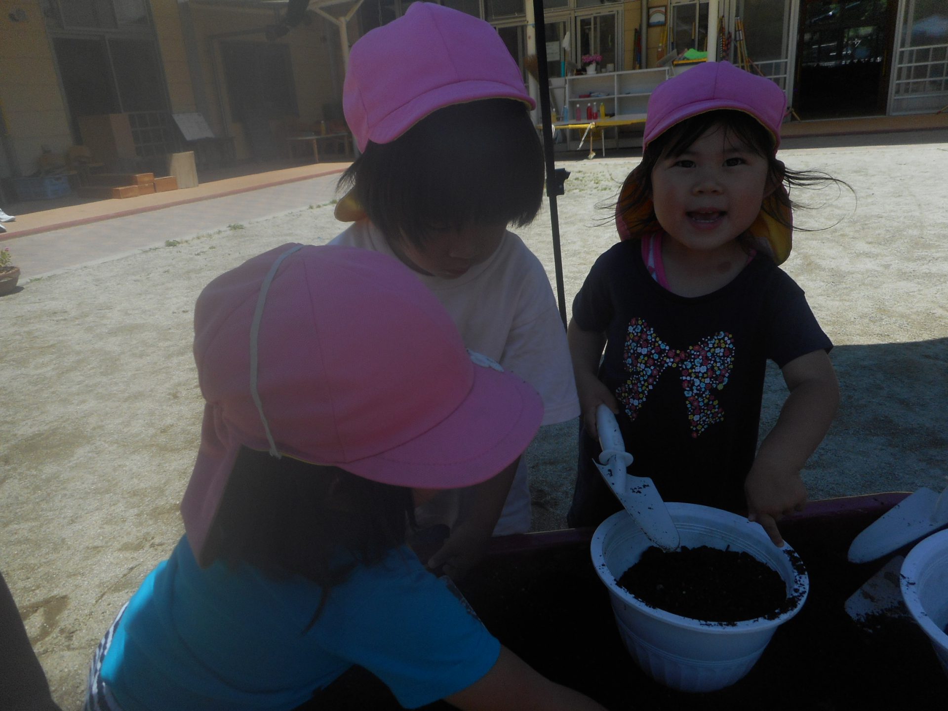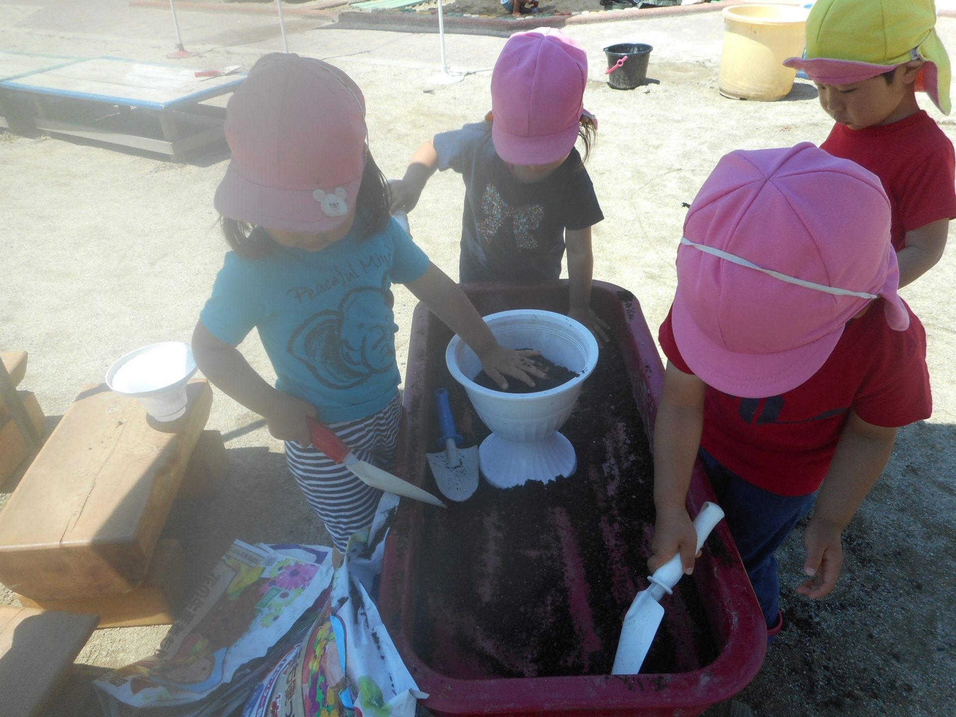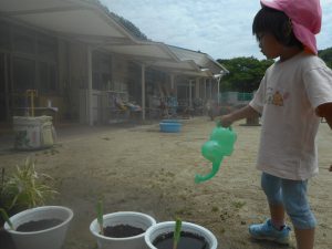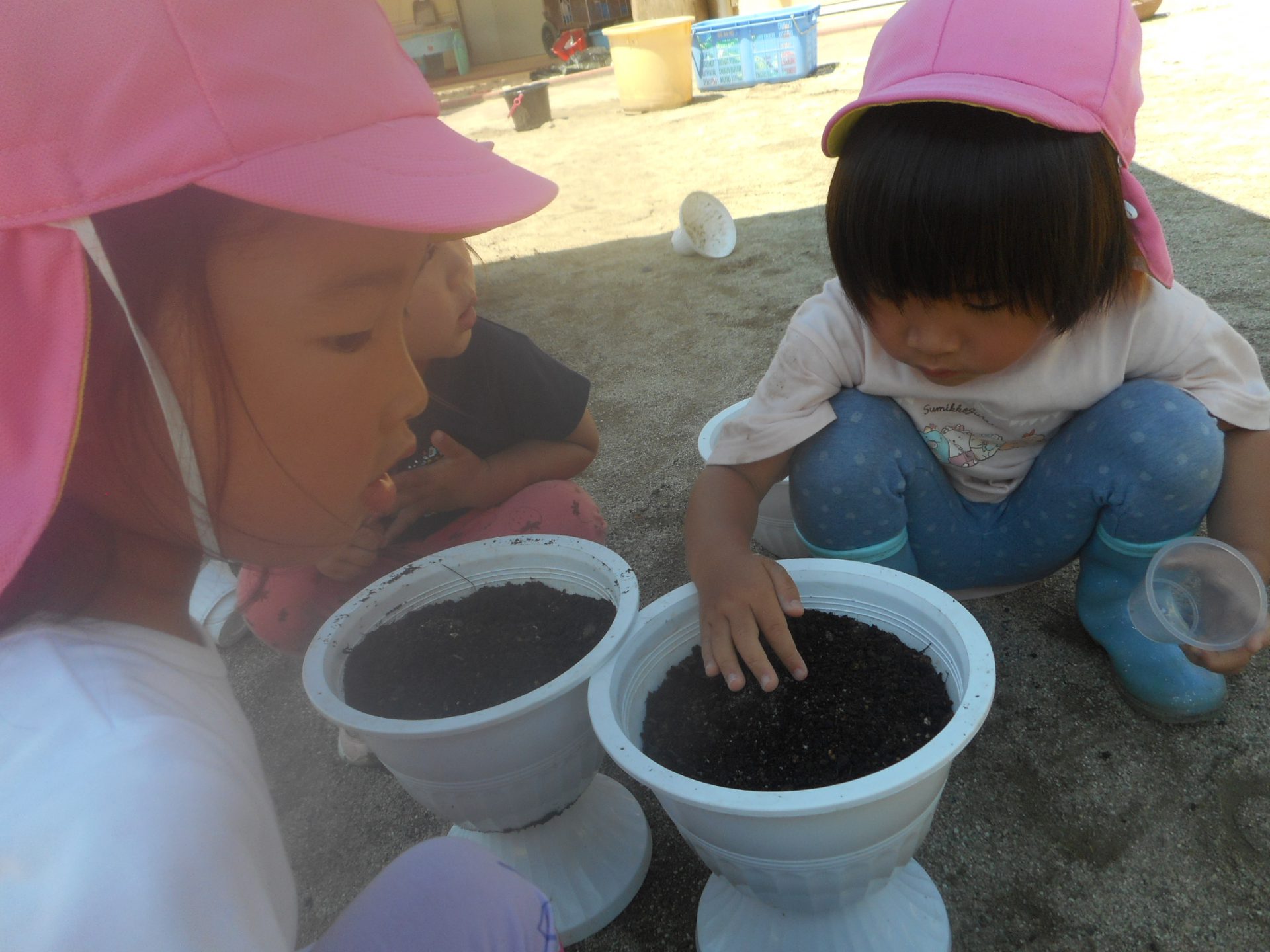 早速、プランターにいっぱいの砂を入れ、種をうめて「できた!」と満足感いっぱいの表情を浮かべる姿や、種に直接水をかけてみたものの「あれ?なんか違うかな・・・?」とプランターから流れた種を見つめる姿など、子どもたちが今までしてきた経験から精いっぱいの、子どもたちなりの考えが溢れていた種まき・・・。