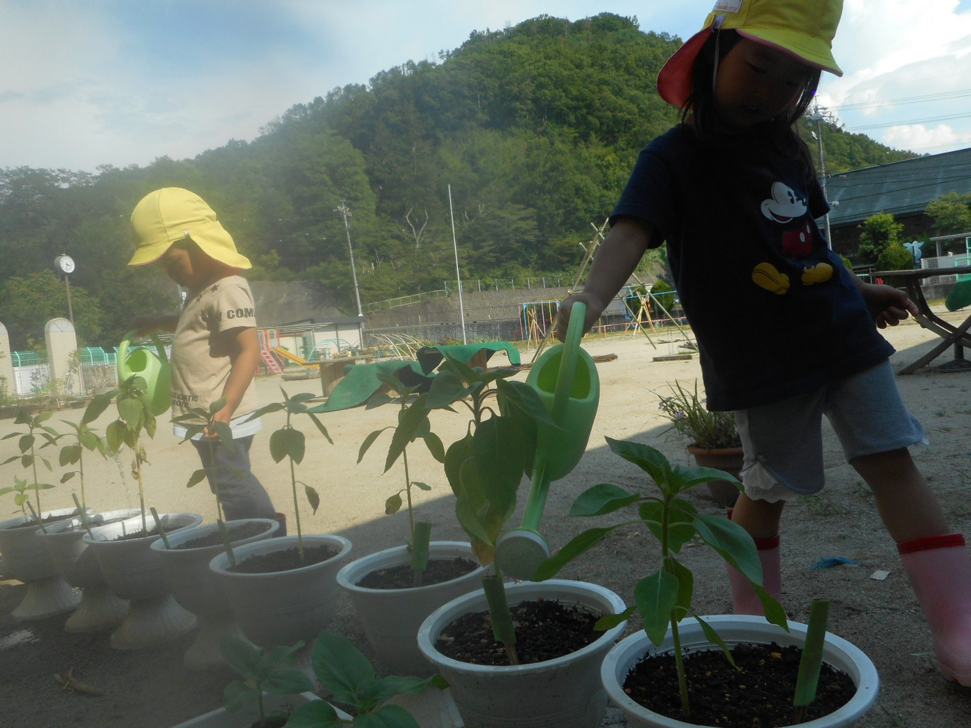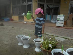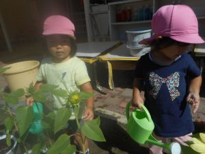 暑い日の戸外遊びでは、「ひまわりもおみずのみたいね!」と子どもたち自ら水やりをしたり、「いつさくのかな~まだかな?」と、楽しみにしている姿もありました。