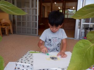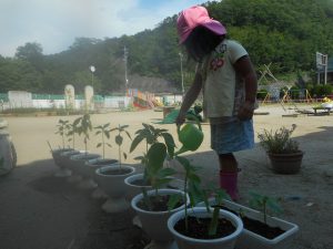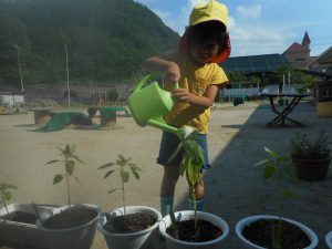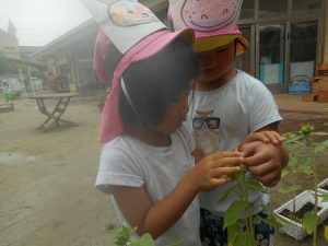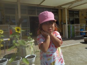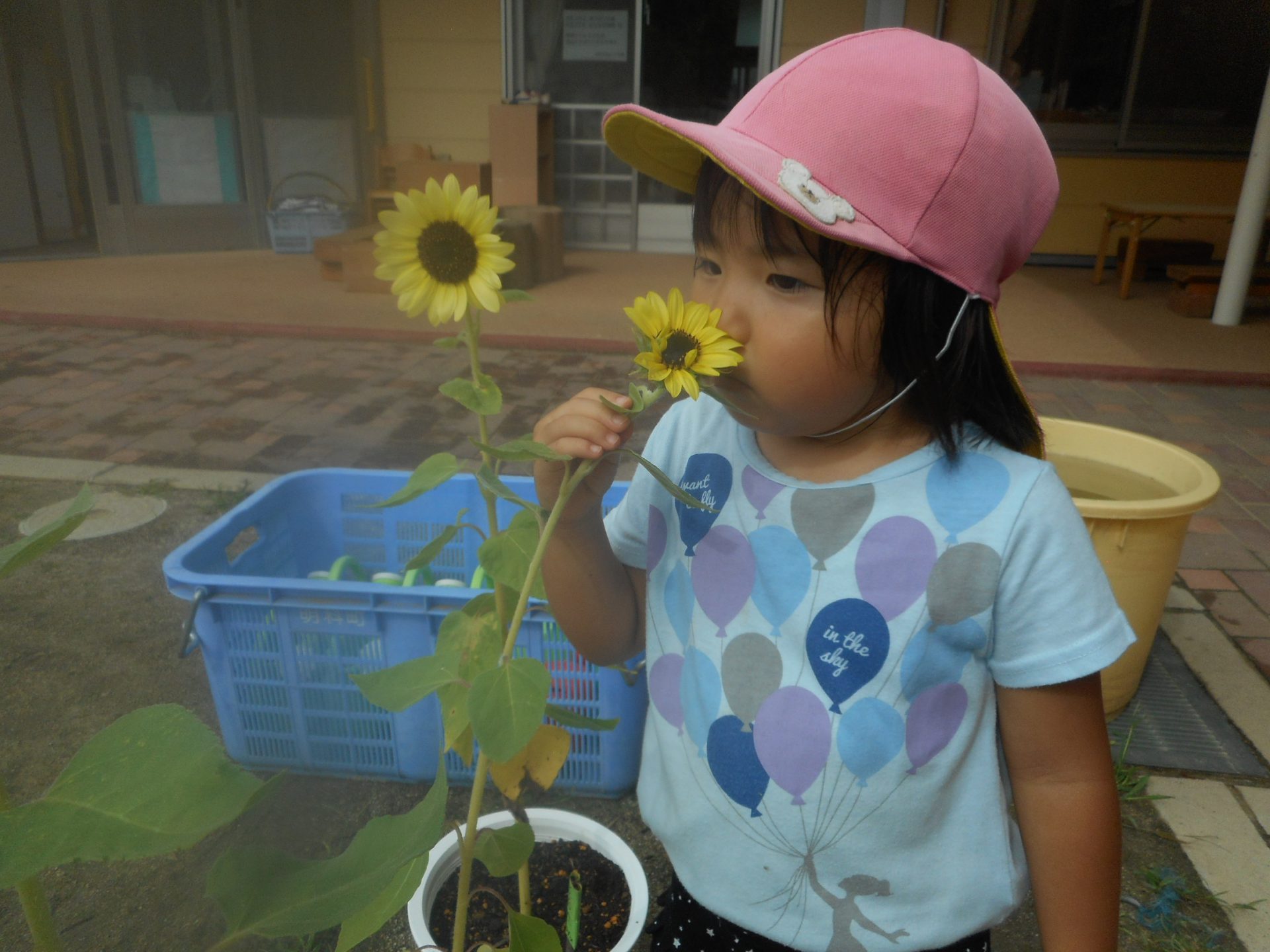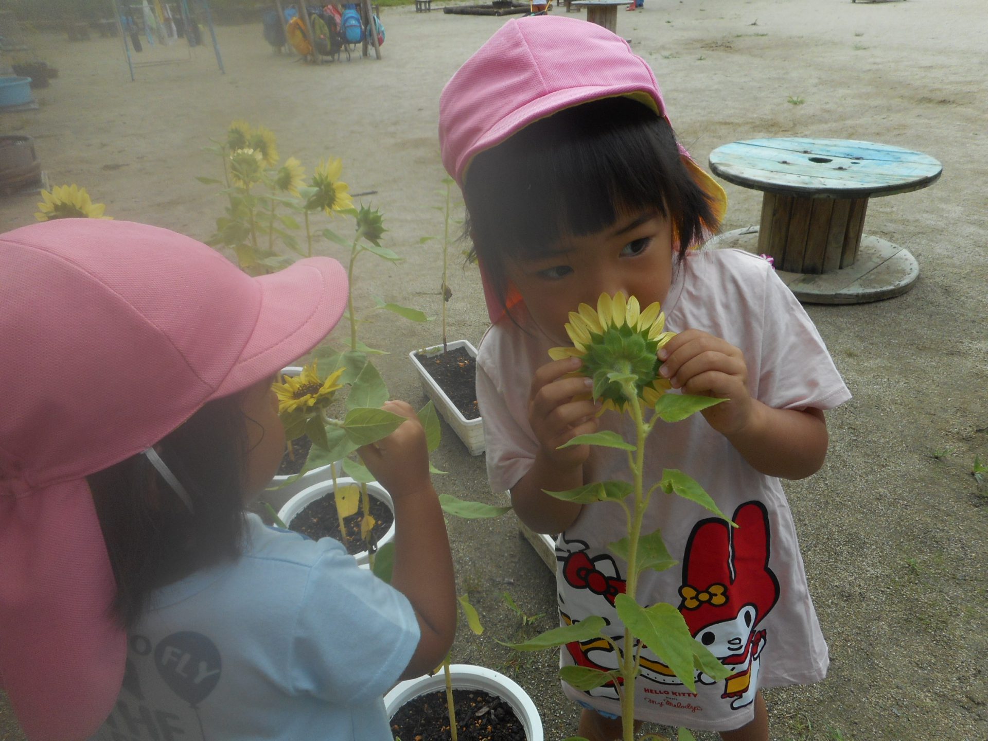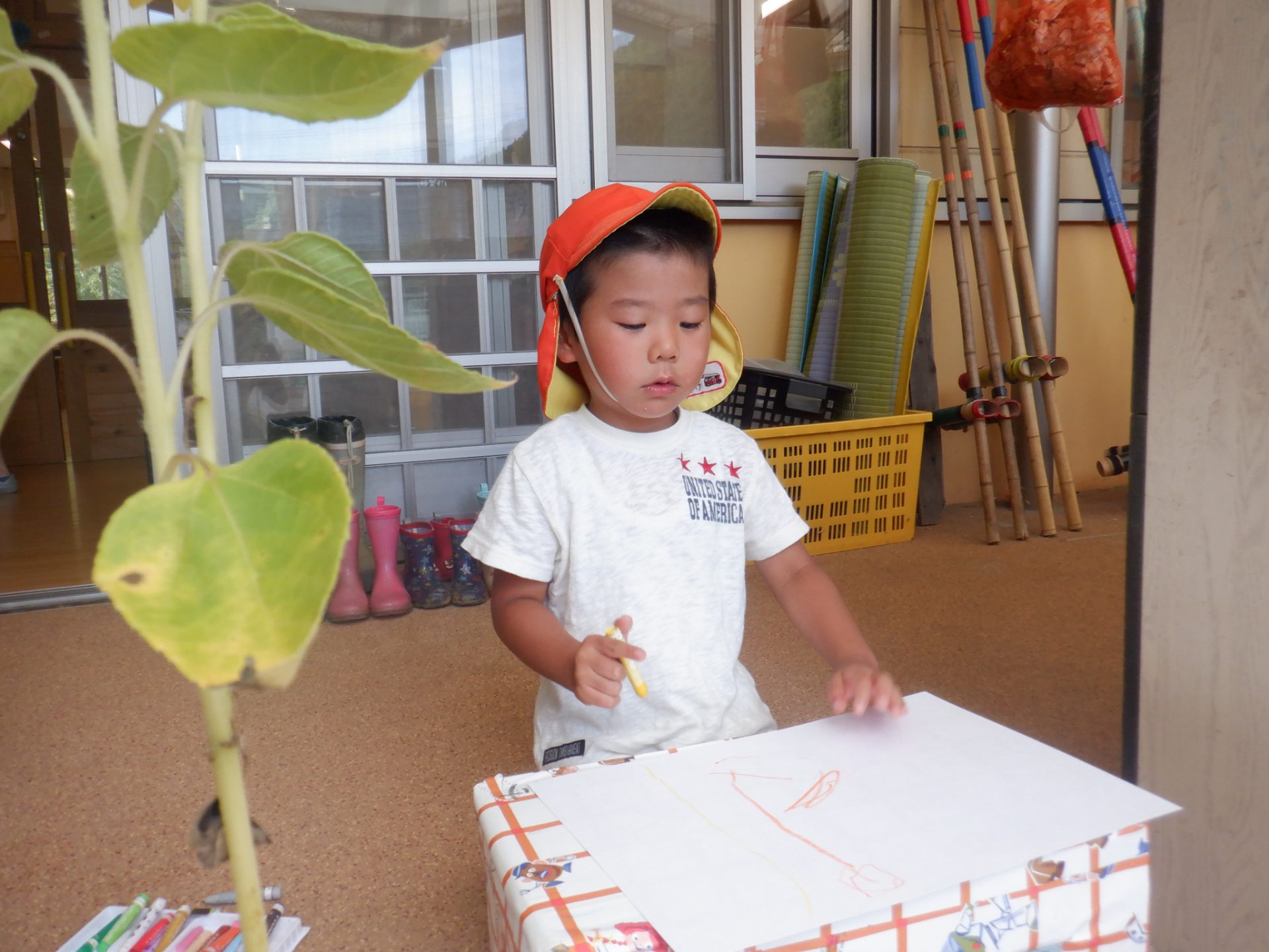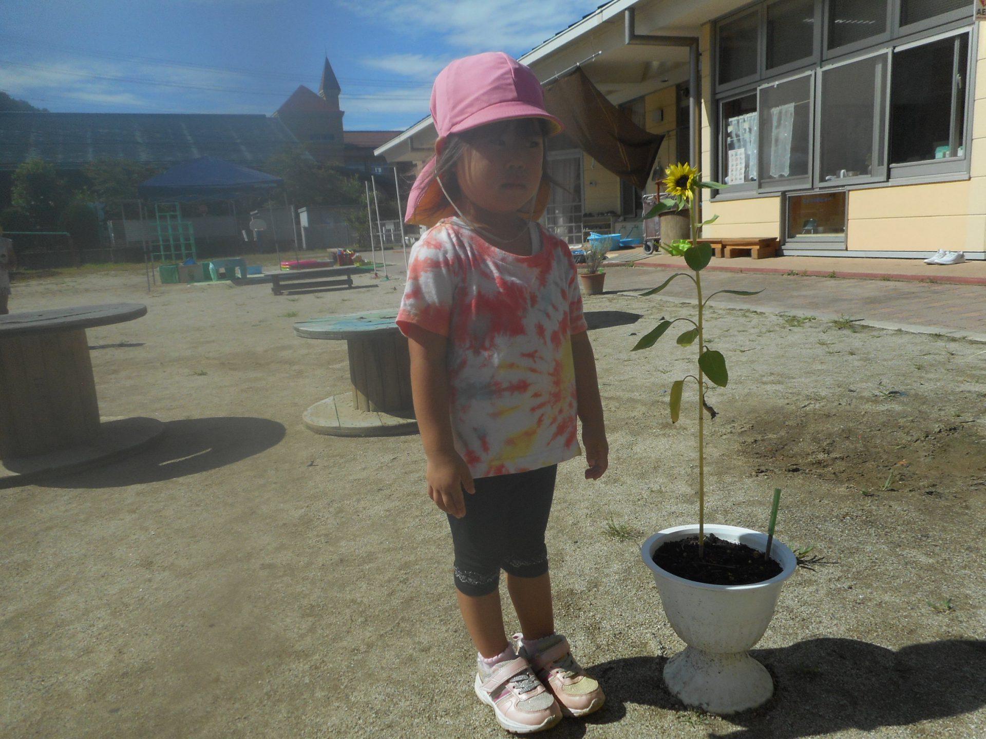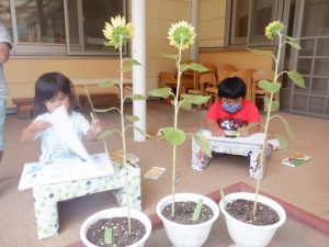 毎朝登園してきては、自分で種まきをしたプランターを観察し、「あ!はっぱがでてる!」、「これだれの?おおきくなってる!」と、日々生長していく“ひまわり”の変化に気づいたり、親しみを持ってこの夏を一緒に過ごしてきました。