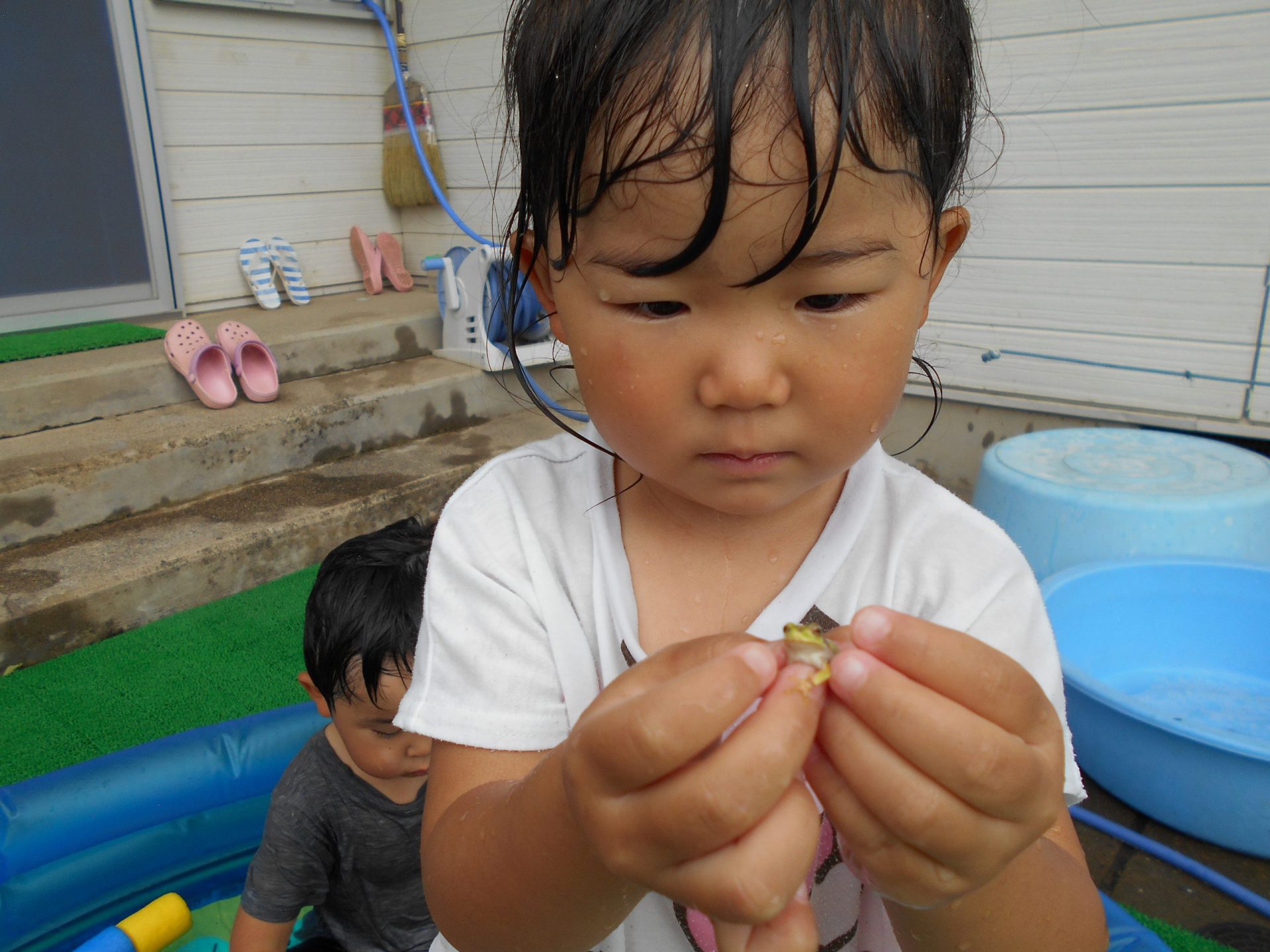 梅雨の時期からカエルが好きでした。水遊びのタライによく隠れてるカエルをゲット!