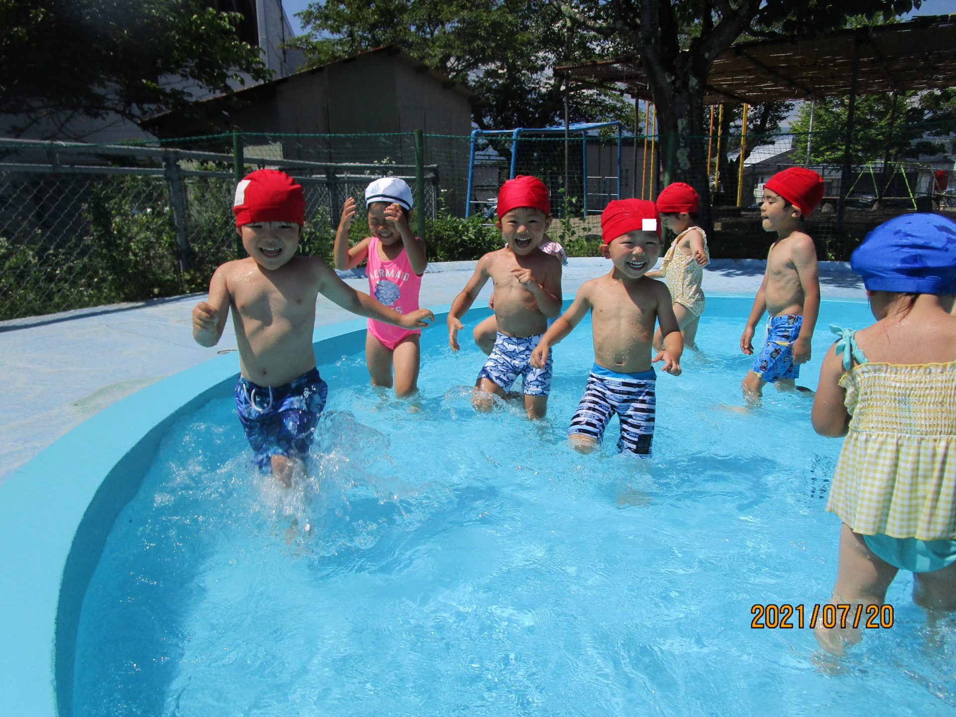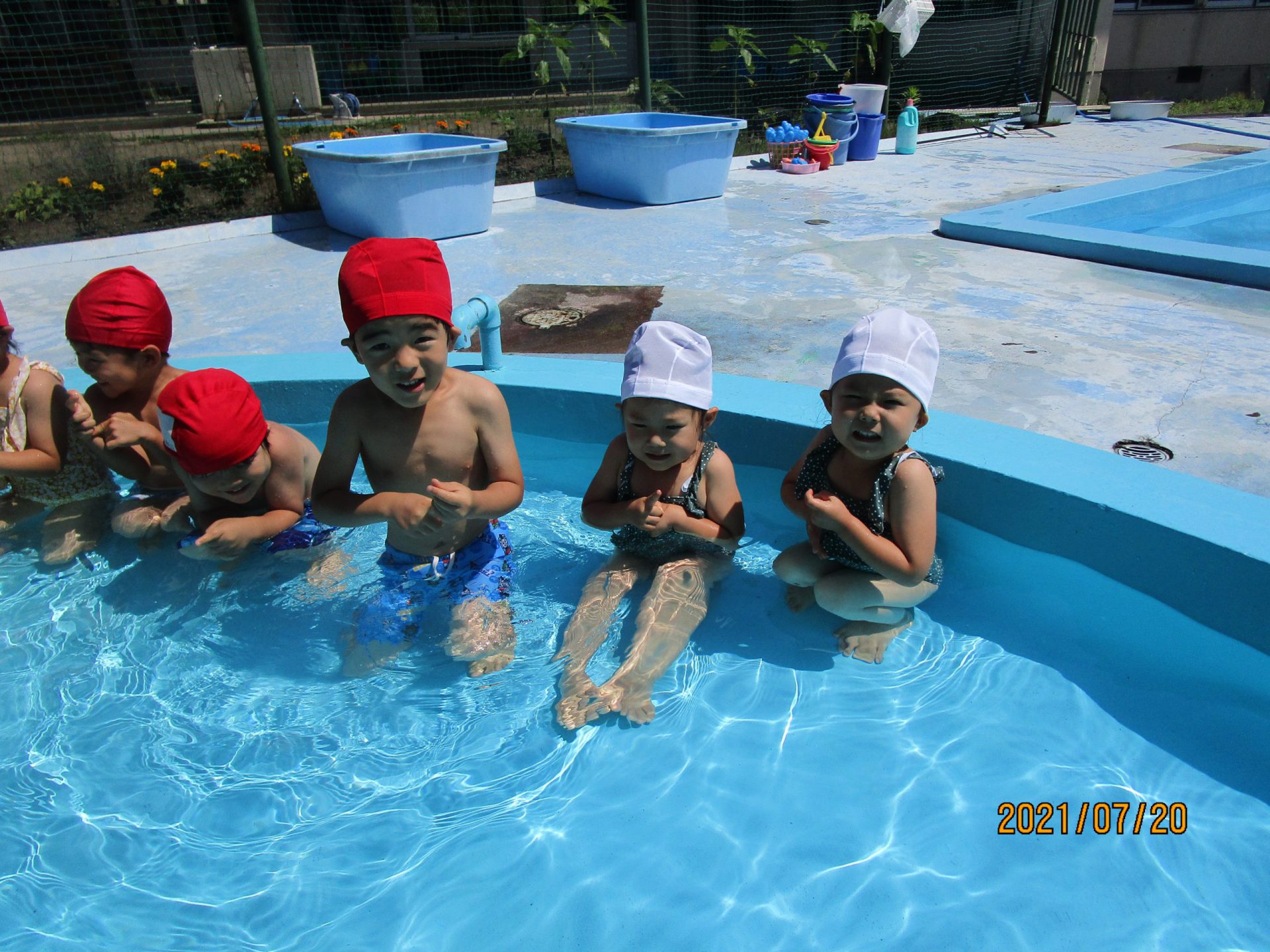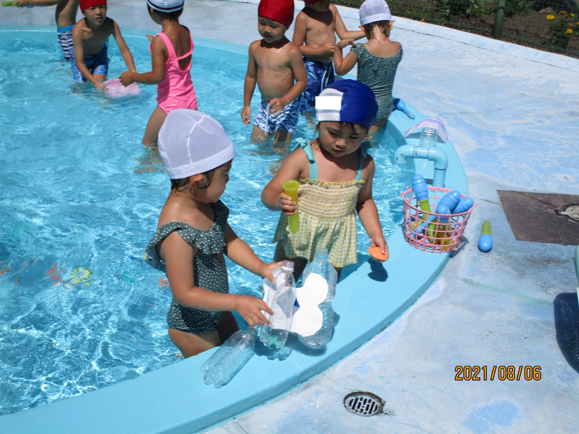 暑い夏の日にはプールにたくさん入りました。今年からお兄さん・お姉さんになり以上児クラスになったため、大きいプールに入れるようになり子ども達は大喜び!!!最初は顔に水が掛かるのを嫌がっていた子も、少しずつ慣れていきダイナミックに遊ぶ姿が増えました。忍者に変身したり、ワニ・カエル・カニなどの動物に変身したり、水鉄砲で的を狙うことを楽しんだりと、プールあそびを存分に楽しみました。