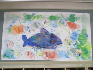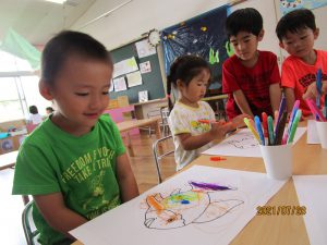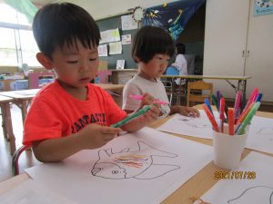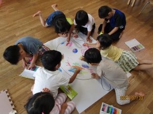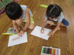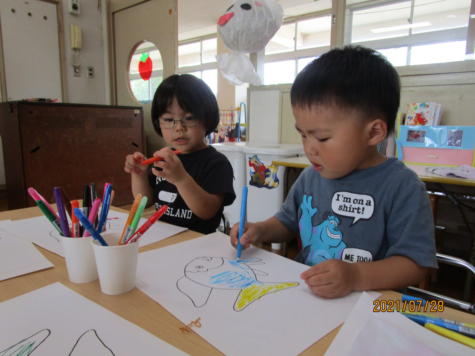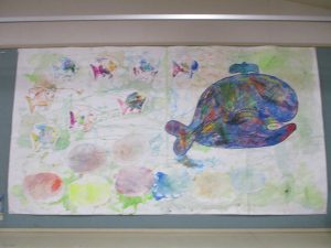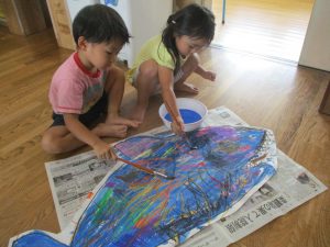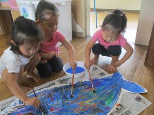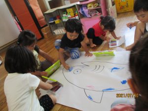 また「おおきいさかなもおよがせたい!」と言う子がいたので、みんなで作ることに。いちごぐみは”くじら”りんごぐみは”さめ”です。今回は”はじき絵”です。まずクレヨンで色をつけました。「かっこよくくろがいいよね」「カラフルにしたいからいろんな色つかおう」と話しながら描いていました。