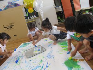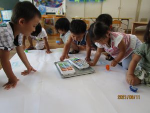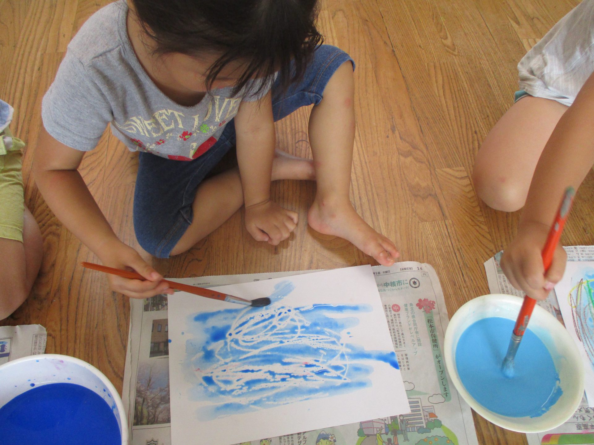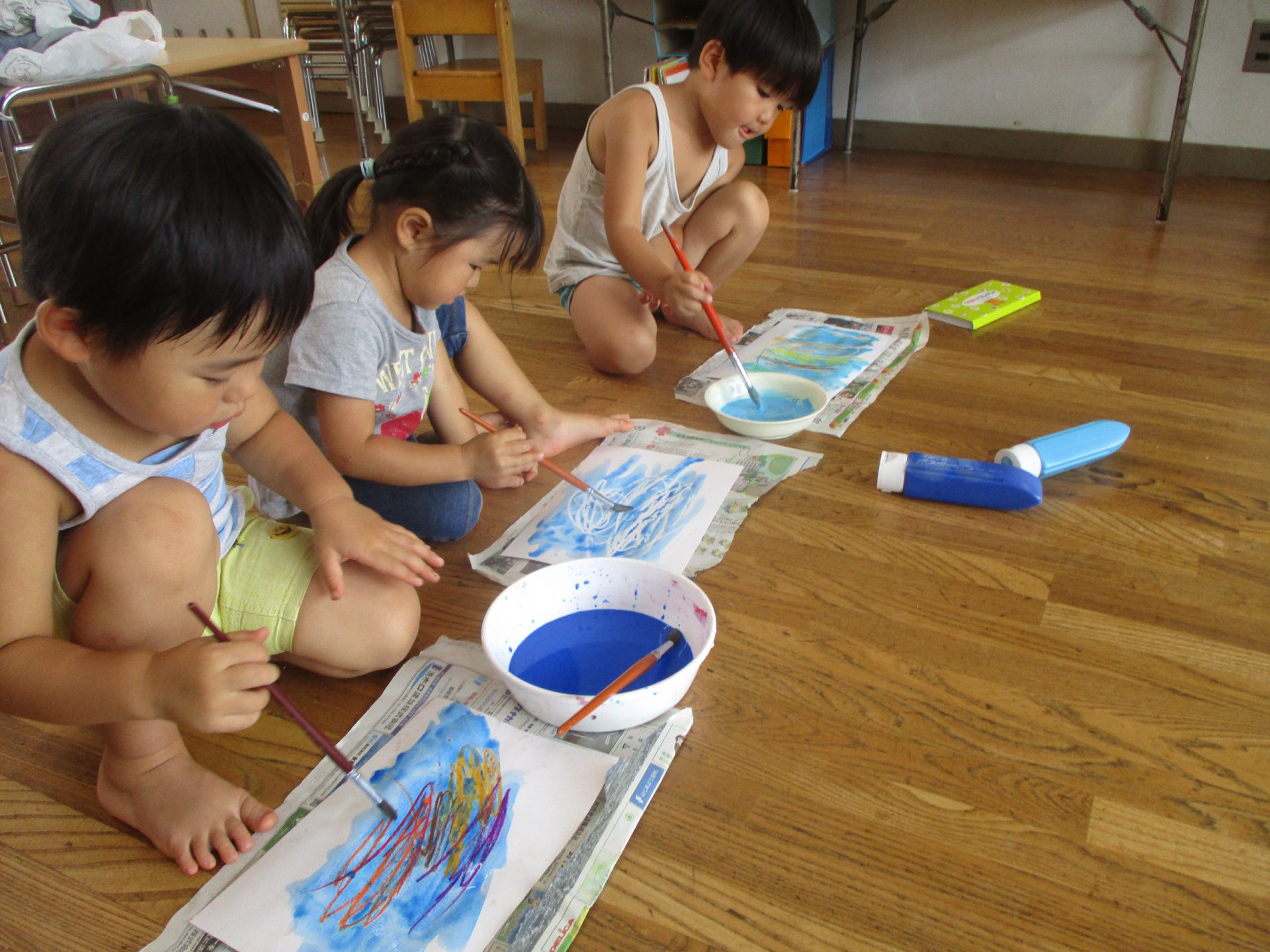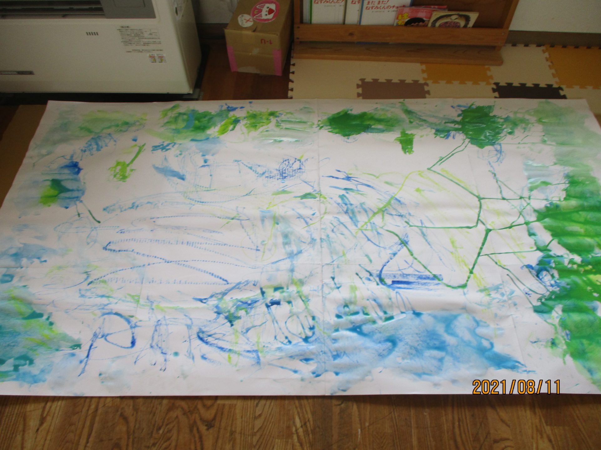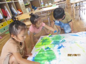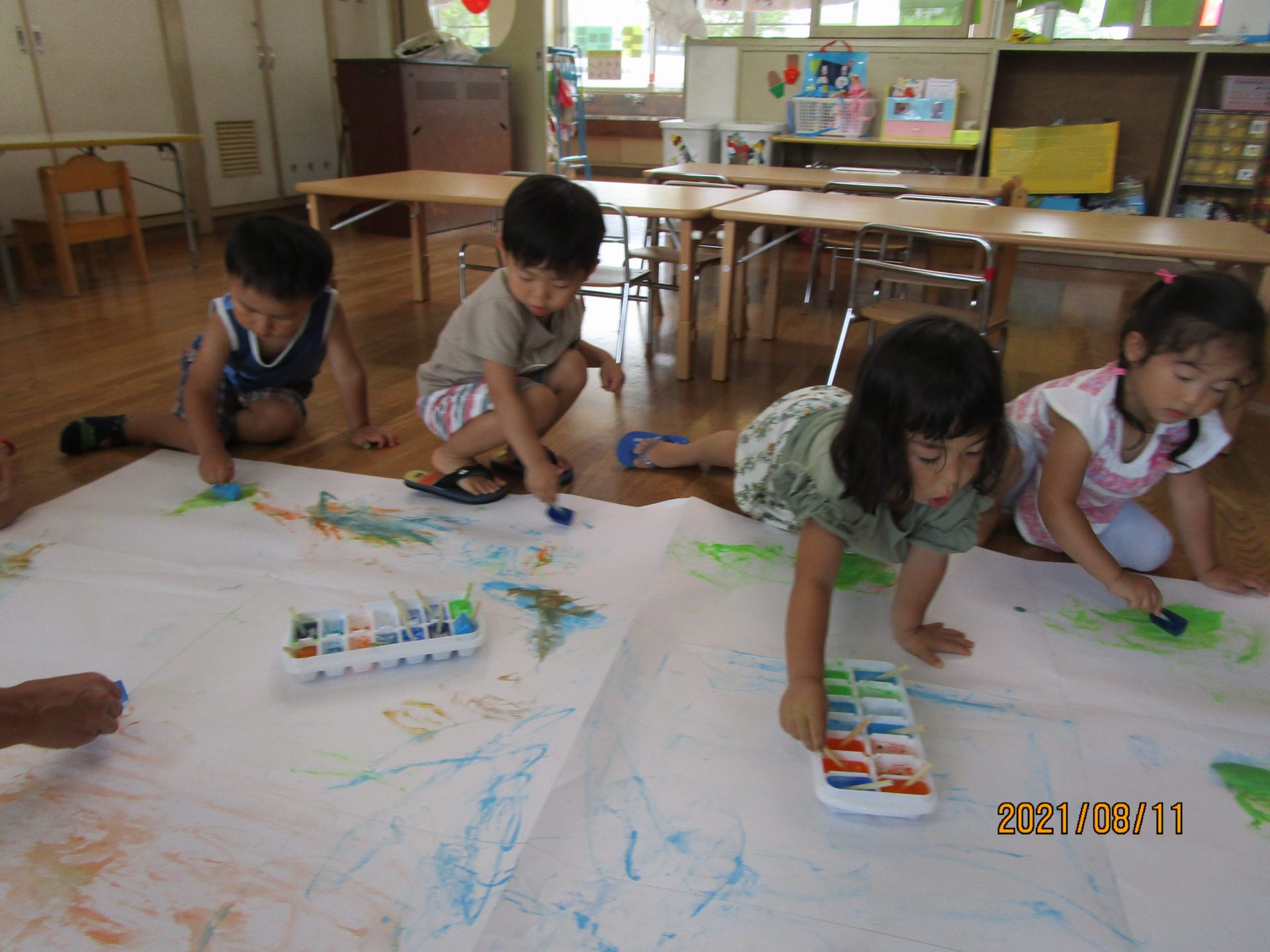 お魚が完成したら、お魚さんが泳げる海もなくちゃいけないということになり、次は海を作ることに。海は7月に氷が溶けて色水になっていくのに興味を示している姿があったので、氷で大きい紙にお絵描きをしてみました。溶けてきた色水が混ざっていく様子を楽しみながら、全員で大きい紙に色をつけながらきれいな海が出来上がりました。