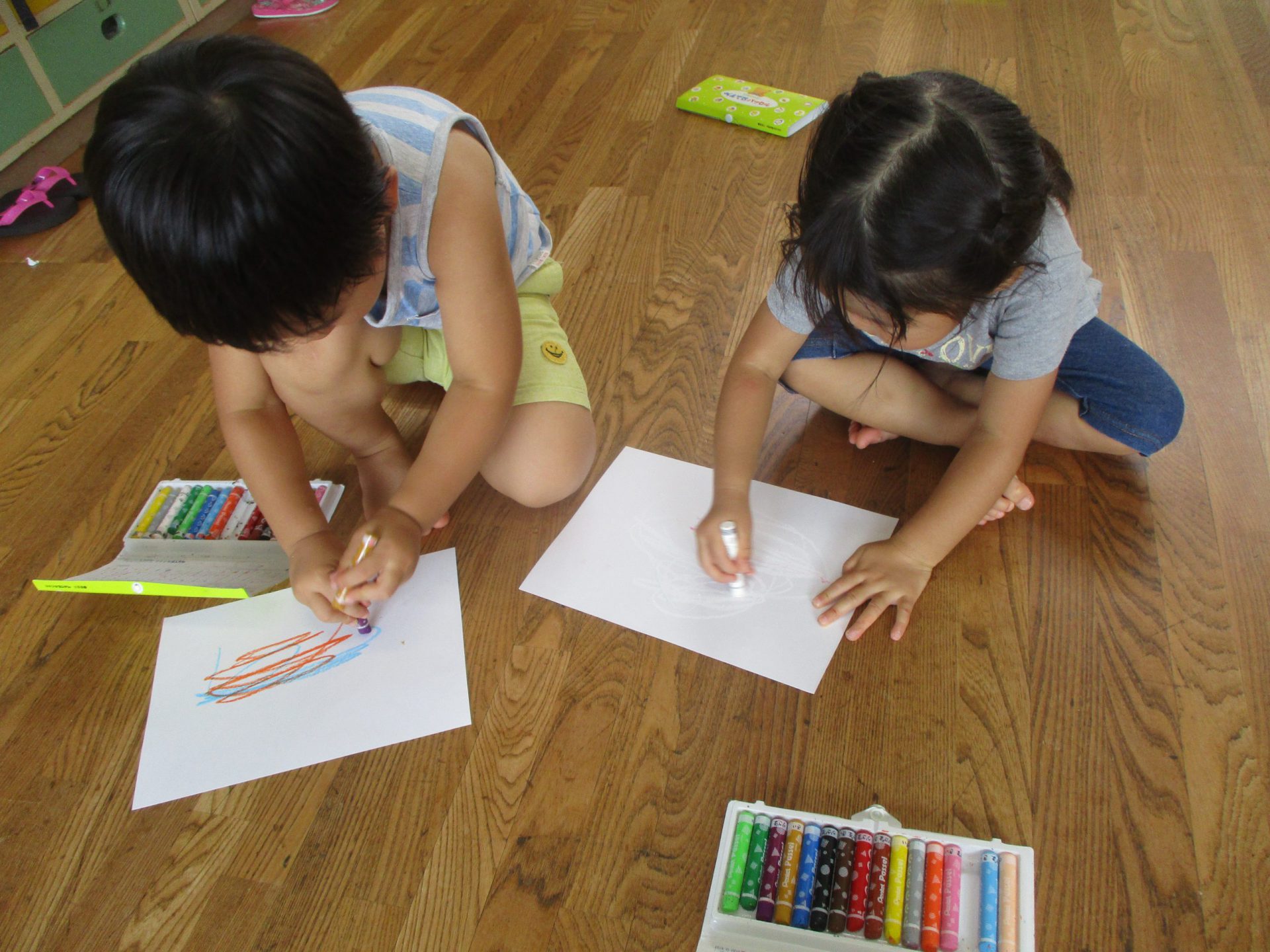 クレヨンで描き終えたあと「この上から絵の具で塗ったらどうなるかな?」と子どもたちに聞くと「クレヨンで描いたのが消えちゃうよ…」と。実際に塗ってみると「クレヨン消えないじゃん」「すごいね!」とはじき絵にびっくりしていました。