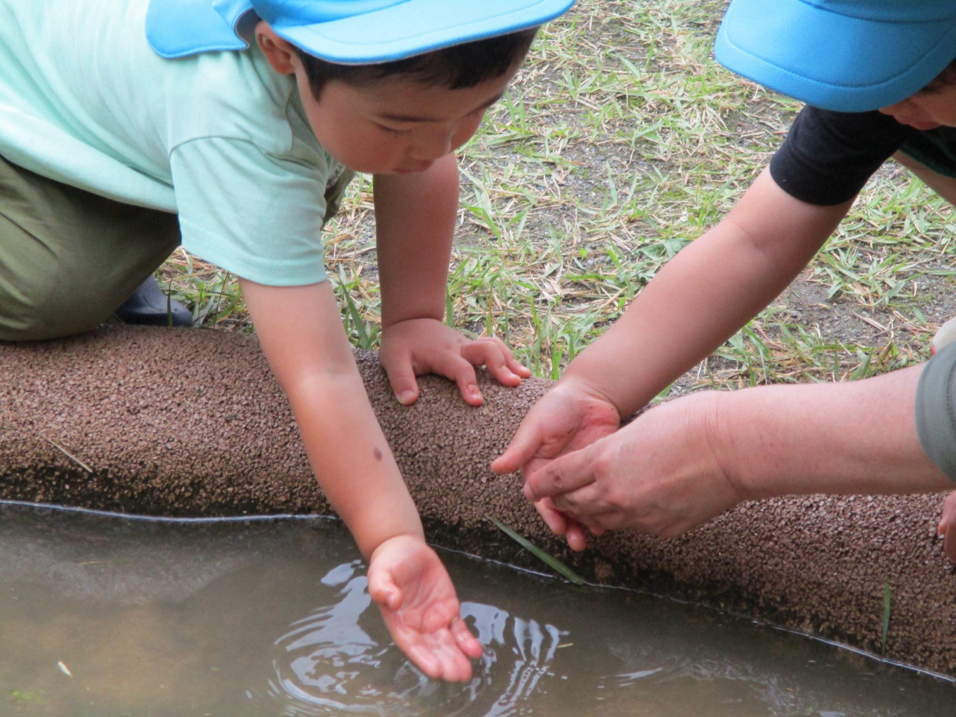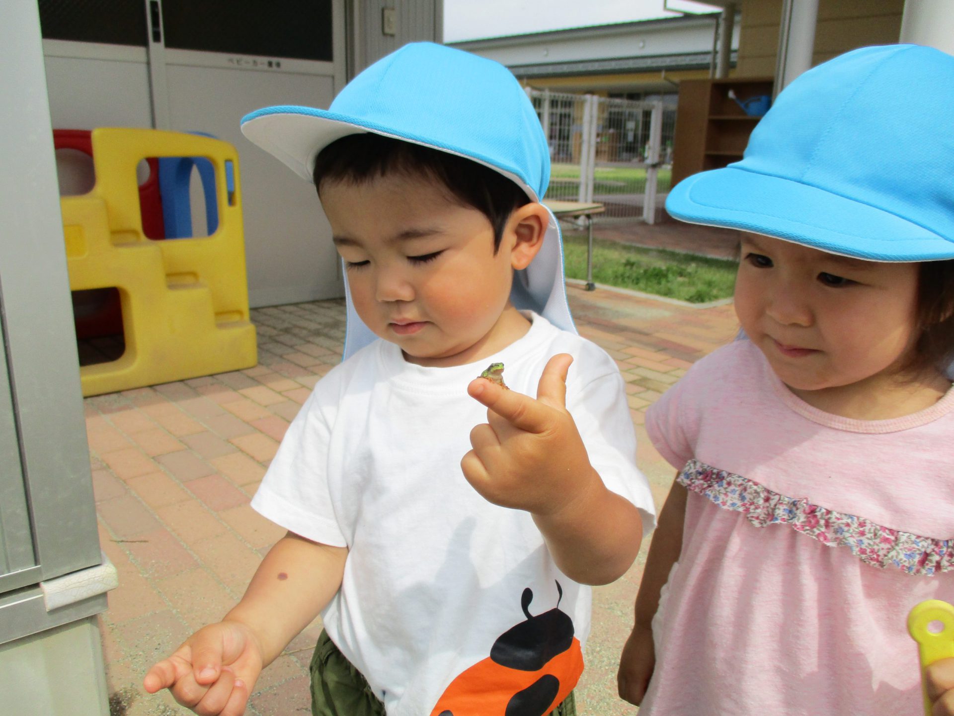 「ぼく、つかまえられたよー」とつかまえたカエルをお友だちにも見せてあげていました。