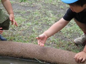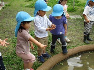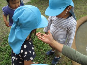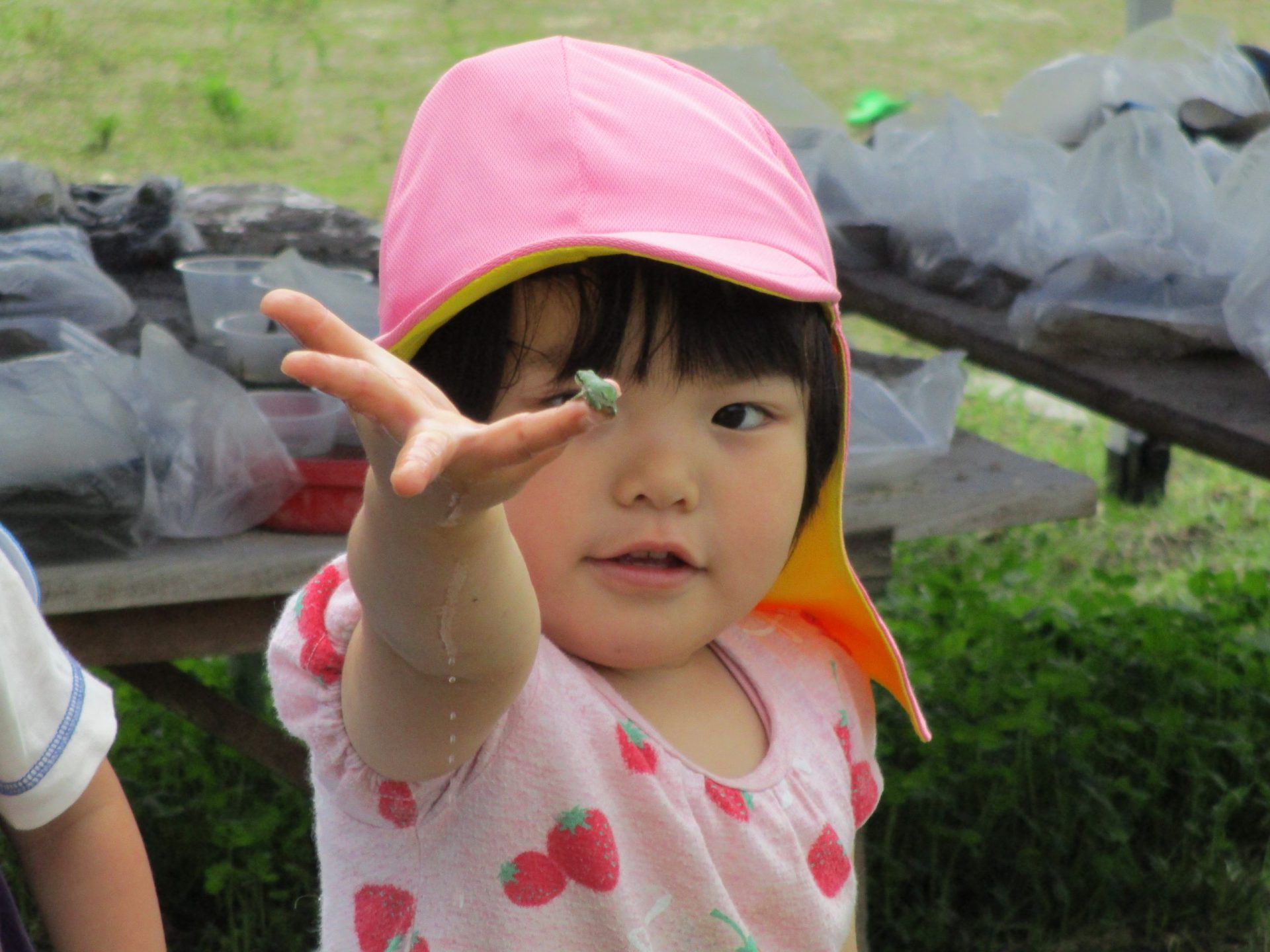 中にはカエルがこわいと思う子もいましたが、自分で触ってみたり保育士やお友達が触っている様子を見てカエルはこわくないと感じたようです。