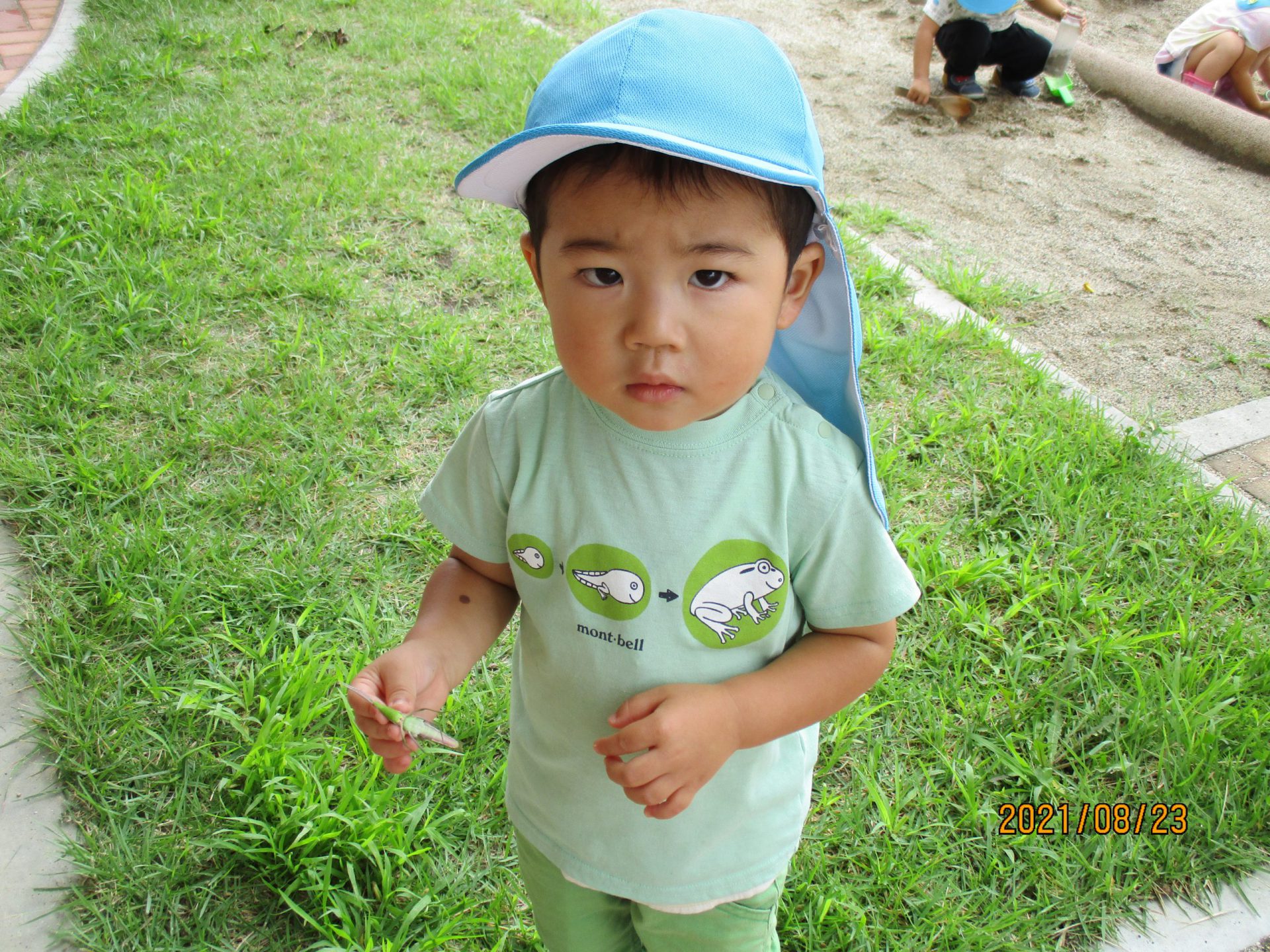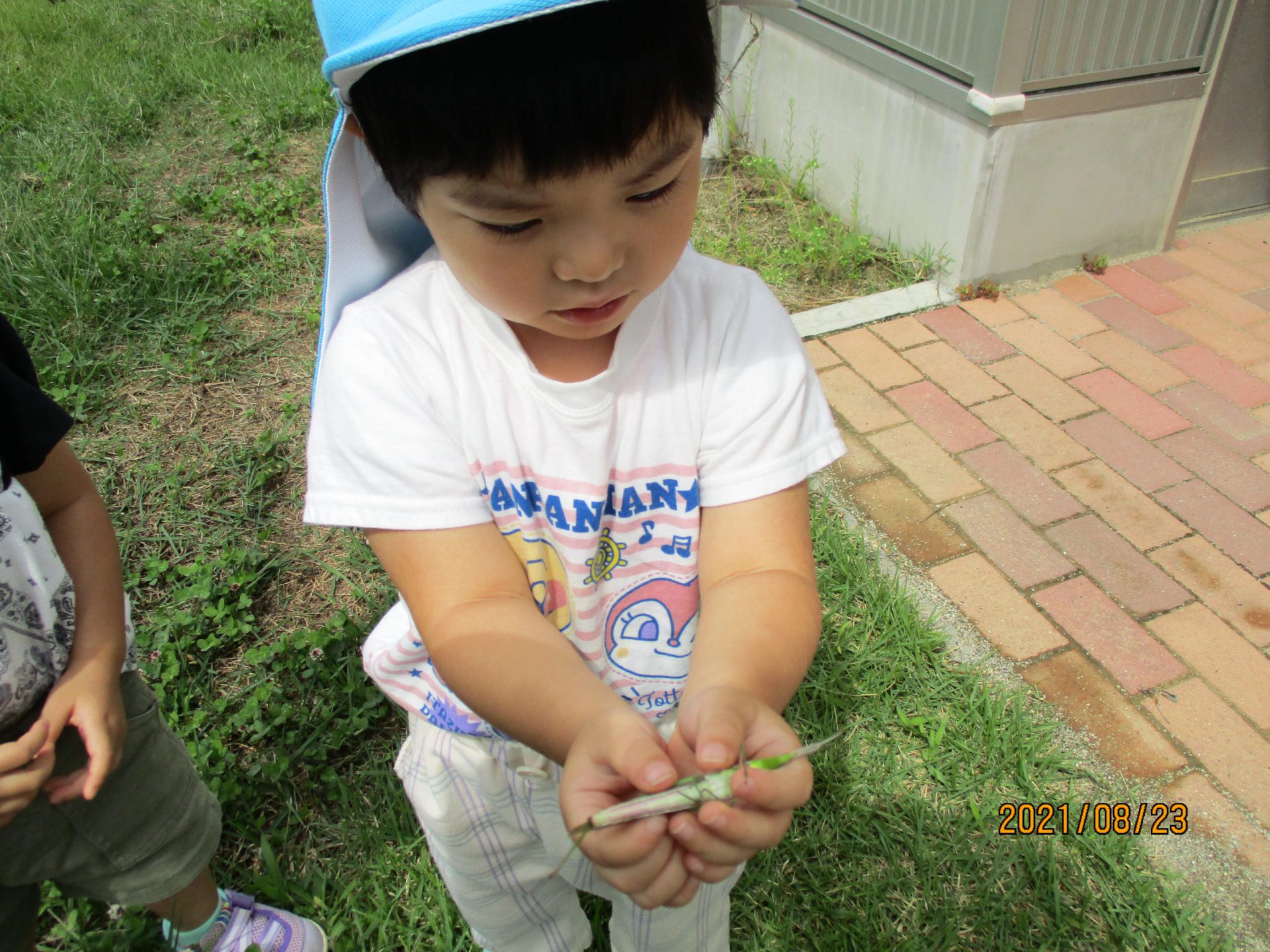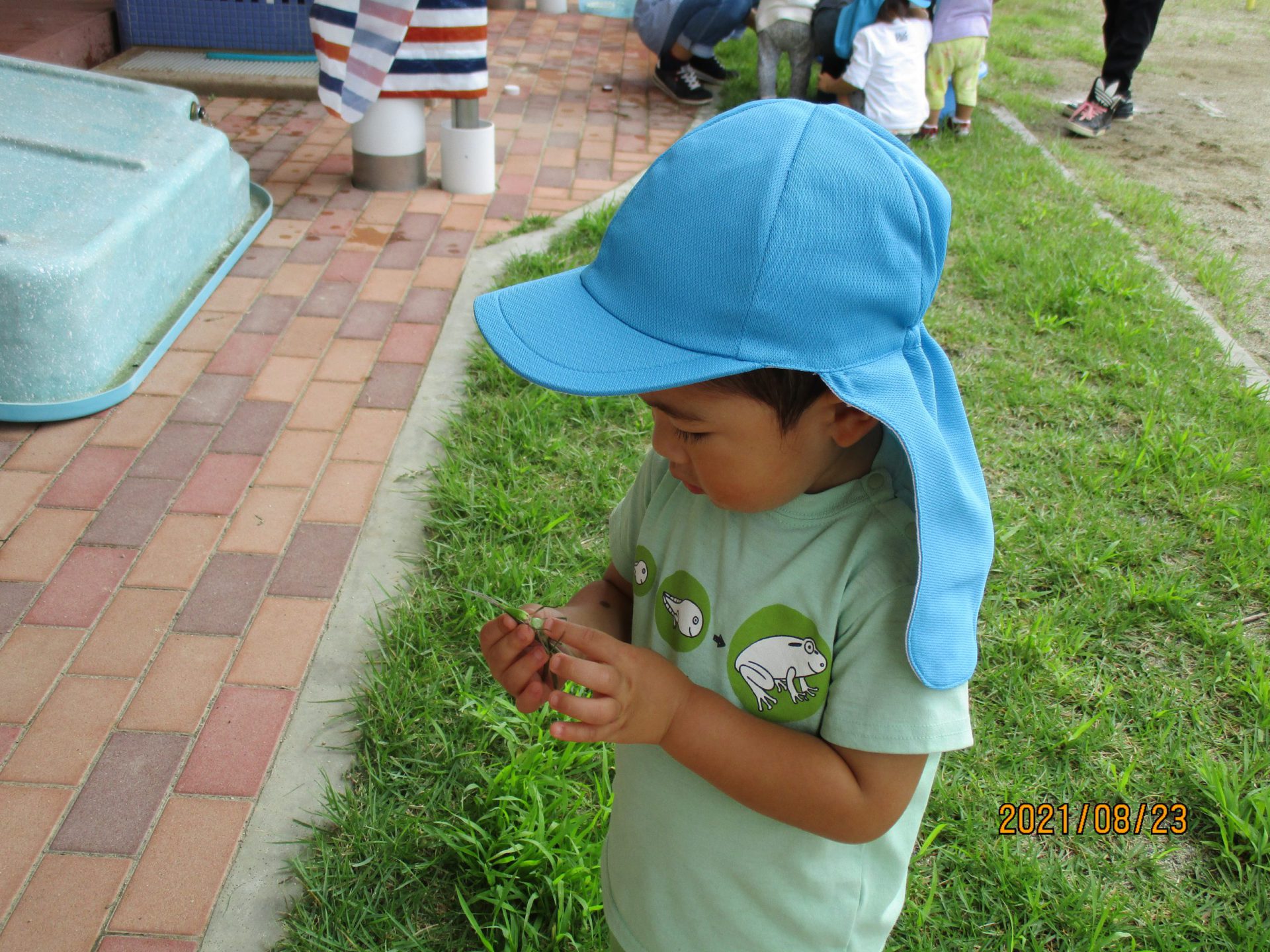 お盆を過ぎてから、カエルの他にも園庭にやってくる生き物を見つけるようになりました。