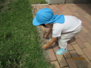 戸外あそびをしている時、何か動くものに気付いた子どもたち。