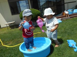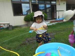 水の冷たさやお日様の力で、あたたまった水の感触やホースから流れ出す、水の威力や水に触れた時の、開放感を十分に味わい、満足するまで楽しめる、そんな保育にしたいと考え、子どもたちと一緒に夏の遊びを楽しみました。