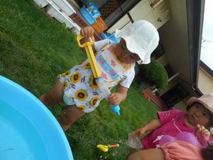 お水が大好きな子どもたちは、外に飛び出すとすぐに気になった玩具を手に取り、水の入ったたらいやプールへと向かいます。