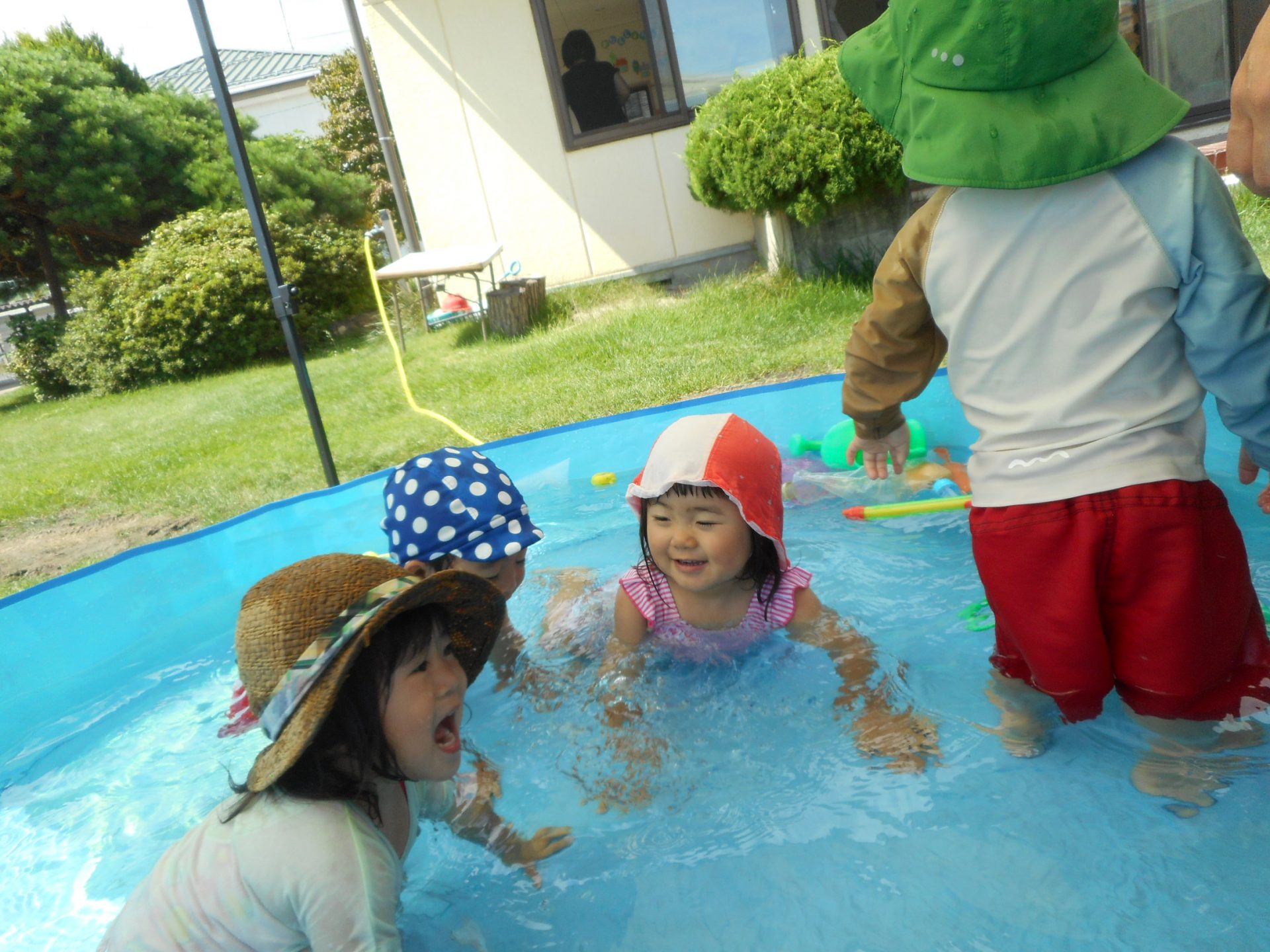 保育士がビニール袋にお水を入れて、水風船を作ると勢いよくプールに投げ入れて「きゃあ~っ」