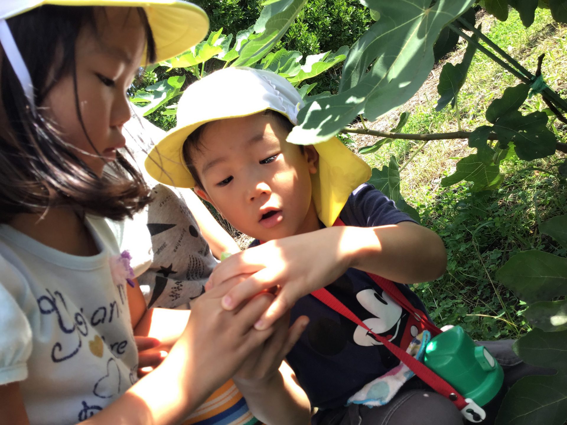 果物に触れる楽しさ、収穫の喜びを友だちと共有する姿がありました。おいしそうないちじくが採れたね!