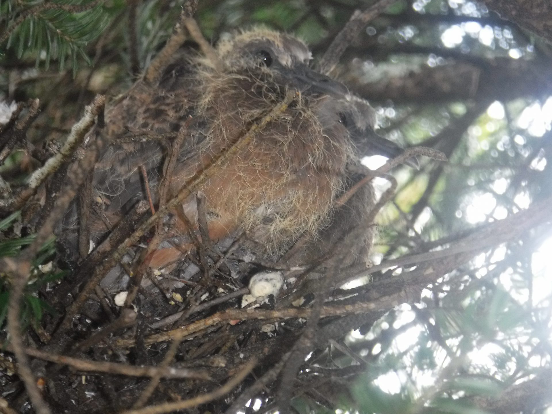 お盆明け、いつものようにカナヘビに食べさせるミミズを探してモミの木の下を掘っていると割れた卵の殻を発見し、上を見上げるとハトが巣の中に座っていました。
