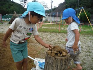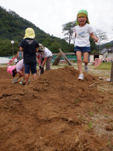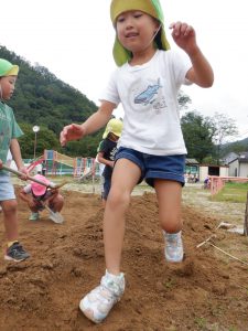 みんなが掘った土を固めるひよちゃん。