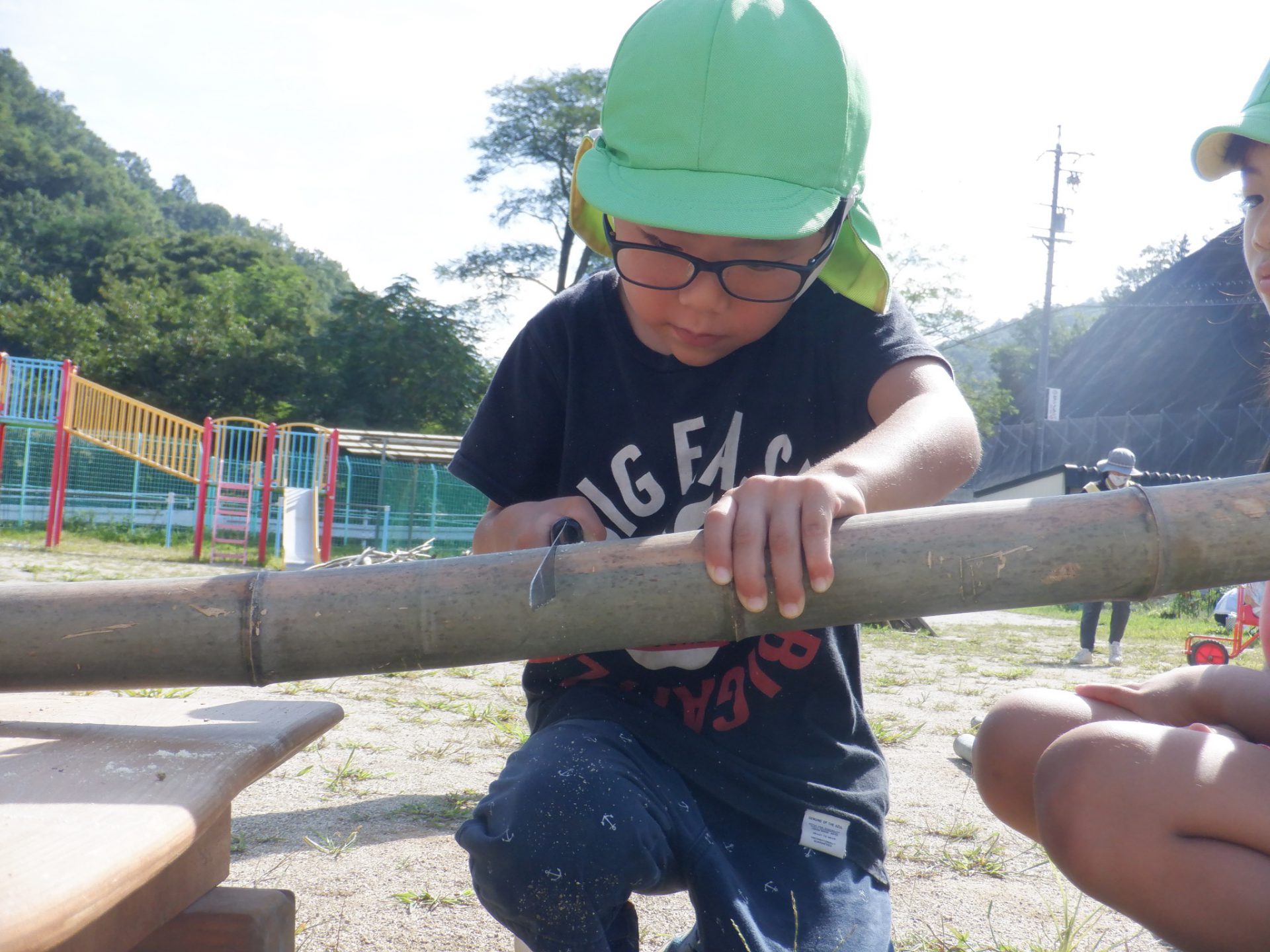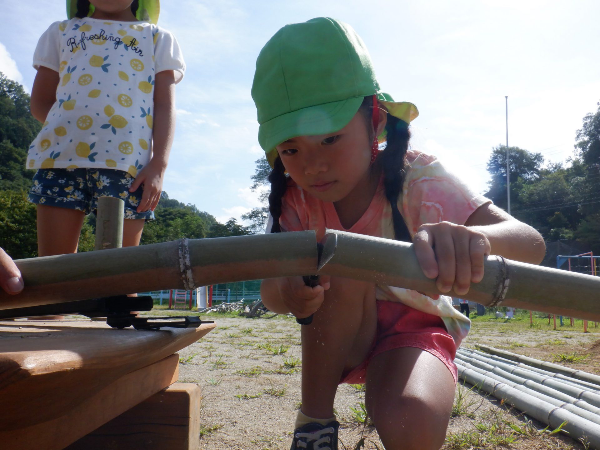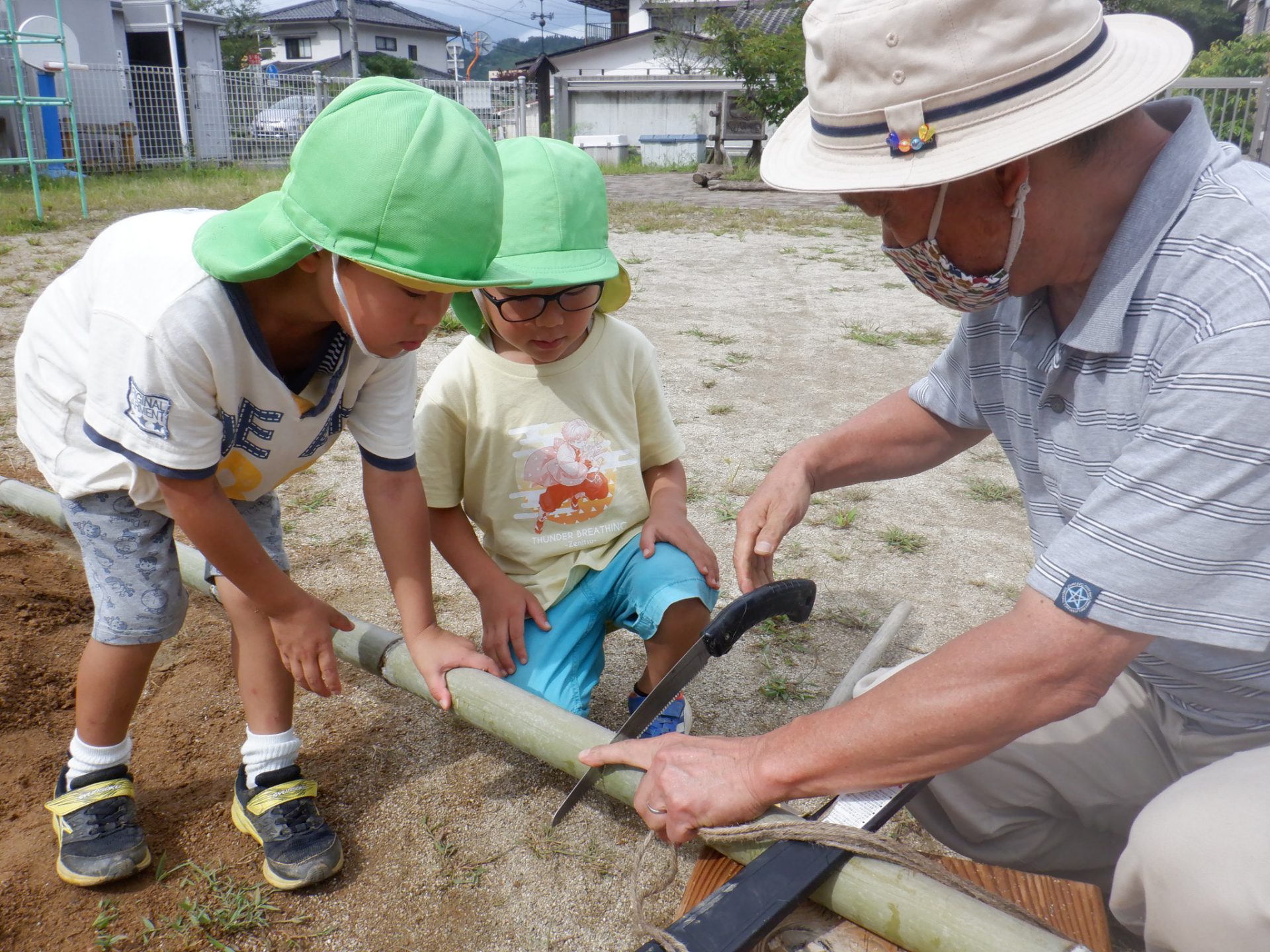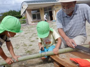 おじいちゃん先生にのこぎりの使い方を教わりながら竹を切ります。