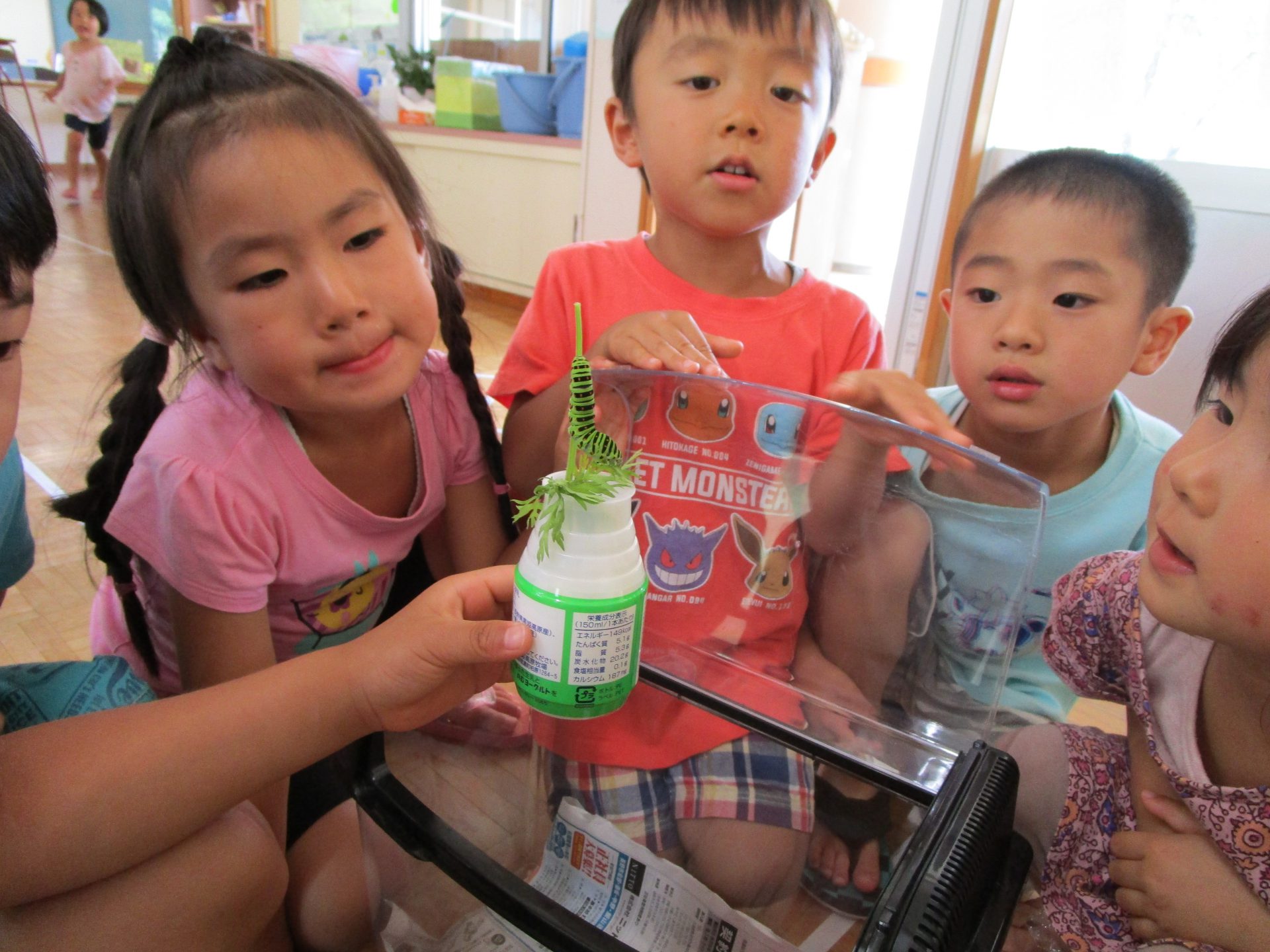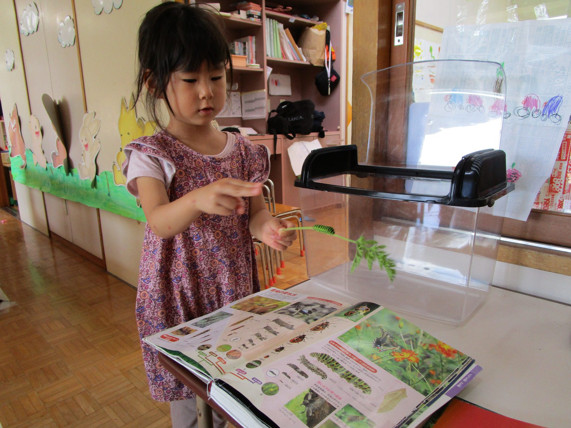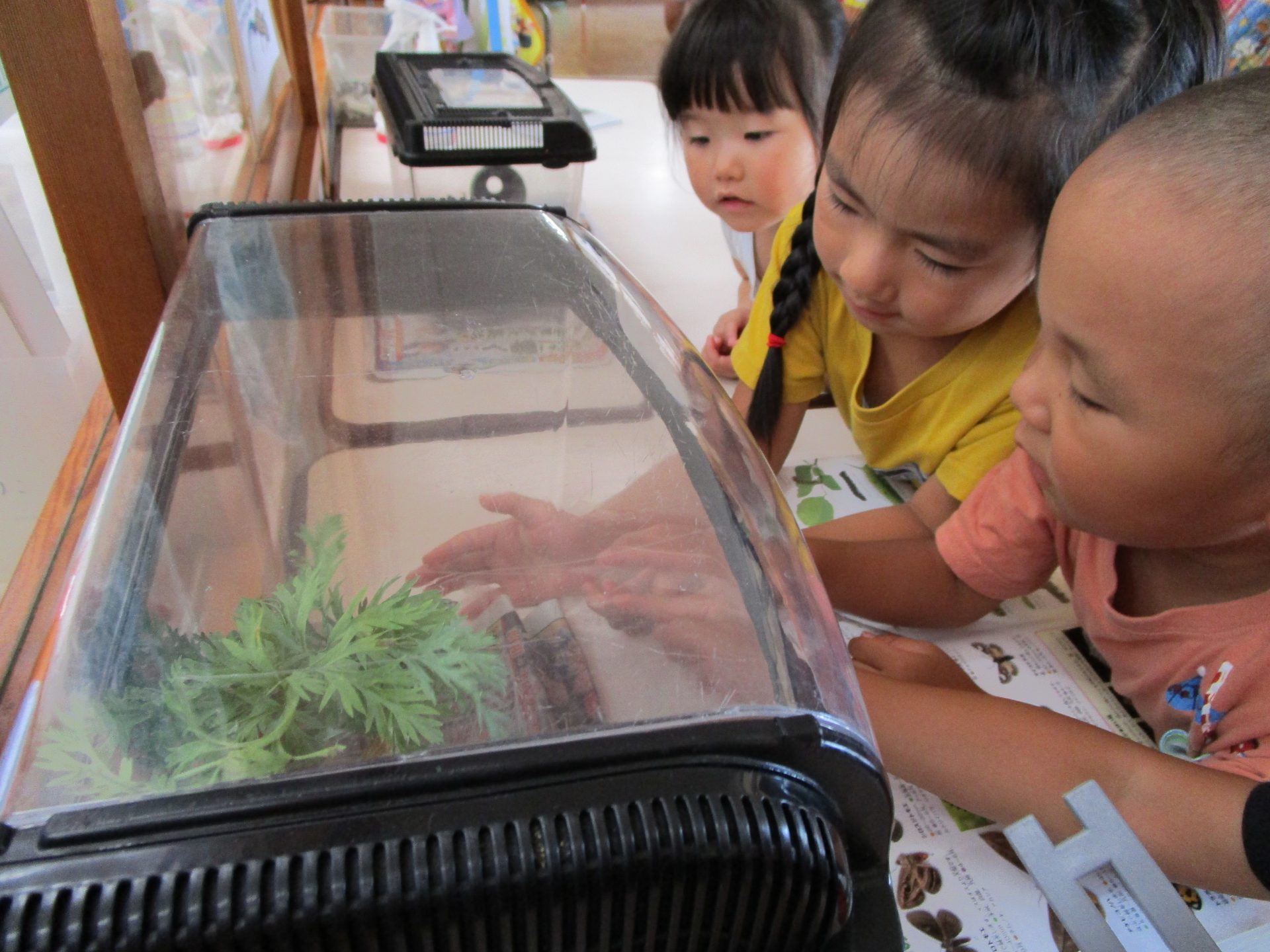 年長さんが育てていたにんじんの葉に何かの幼虫がついているのを発見した年中さん。