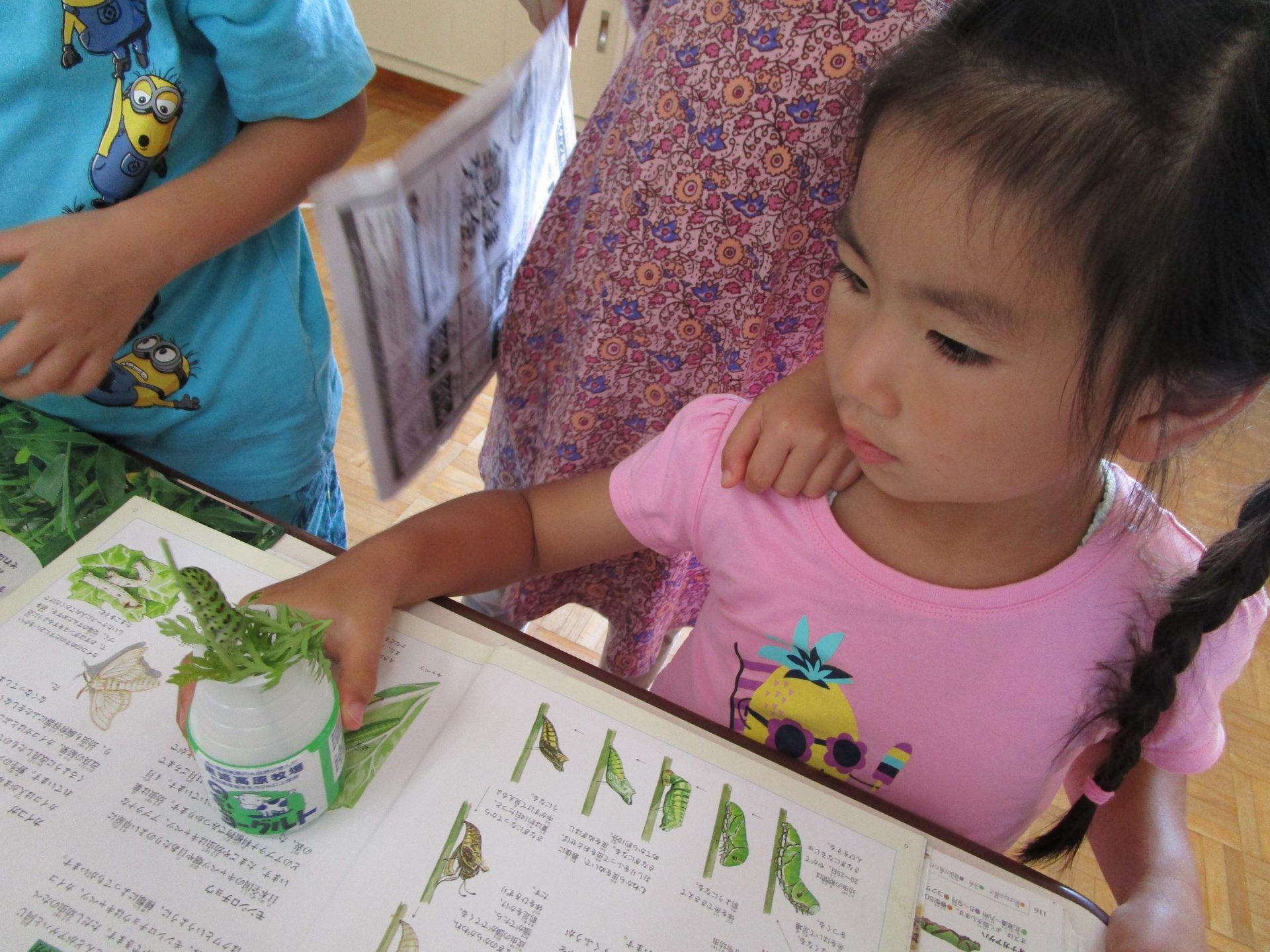 「蛾の幼虫じゃない?」「ちょうちょかもよ?」