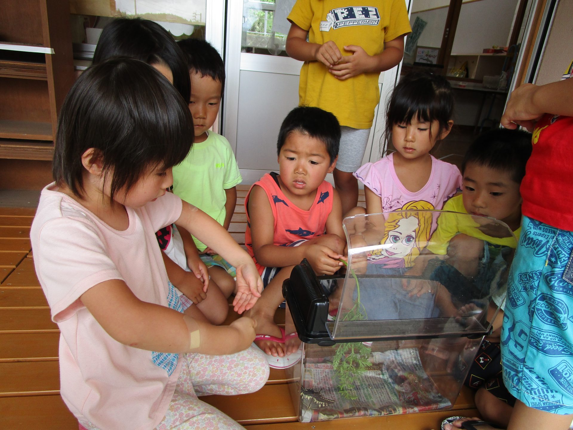 キアゲハの幼虫から成虫になるまでを無事に見届けることができました。その中で餌をあげたりうんちの片付けをしてあげたりする体験をすることもできました。子どもたちにとって、生き物への温かな感情が芽生える貴重な体験だったと思います。また、この体験を通して生き物への興味が広がり、ダンゴムシやザリガニのお世話をする姿も見られるようになってきました。ですが、まだ「死んじゃったら次の飼おう」という声が聞こえることもあります。命の大切さを伝える難しさを感じています。生き物と触れ合う機会を通して繰り返し伝えたり時には子どもたちと考えたりしながら命の尊さを感じていければと思います。
