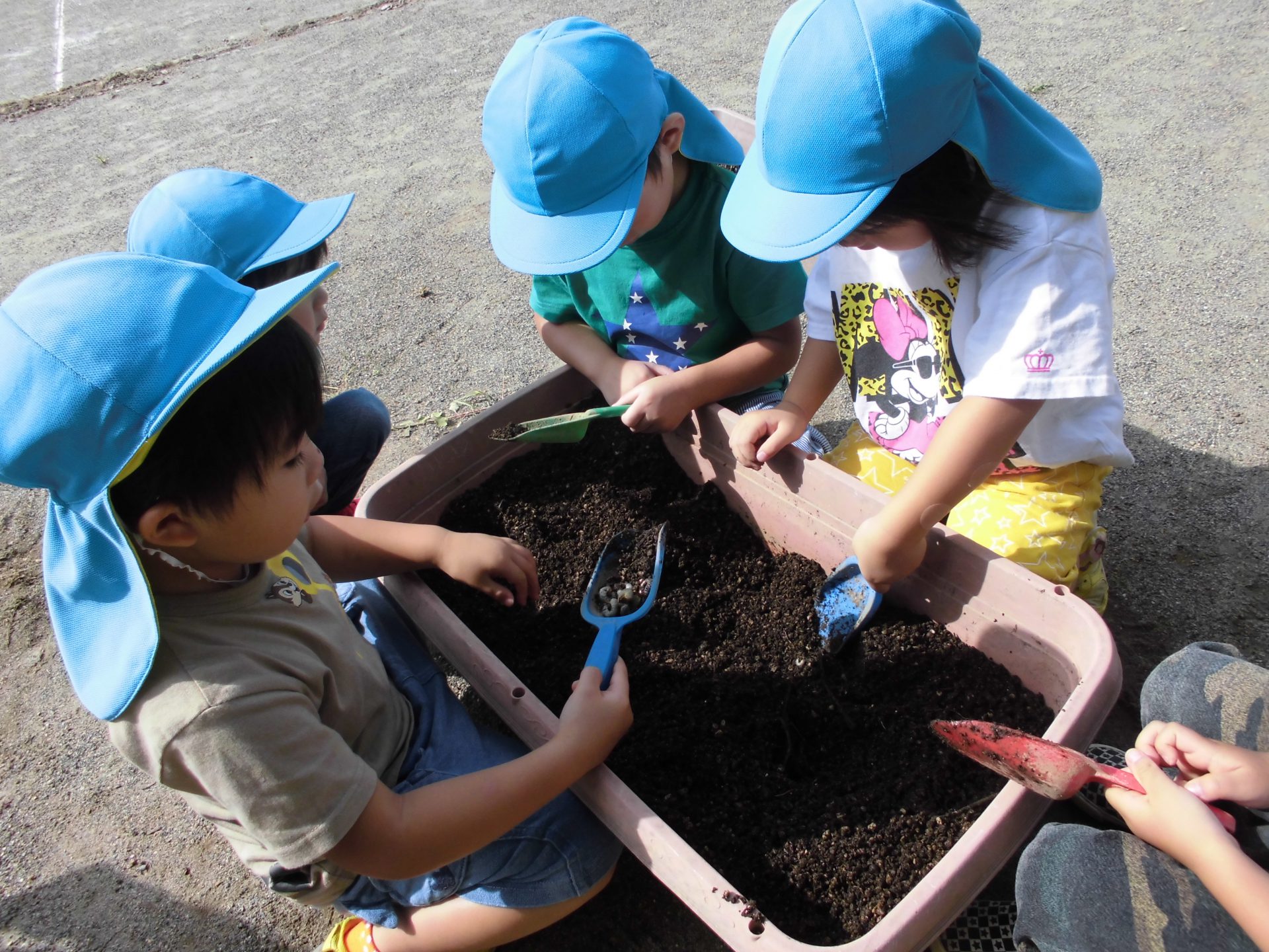 翌日、「きのうのようちゅうまだいるかな」と友達を誘ってプランターに行き、土を掘り起こしてみると…