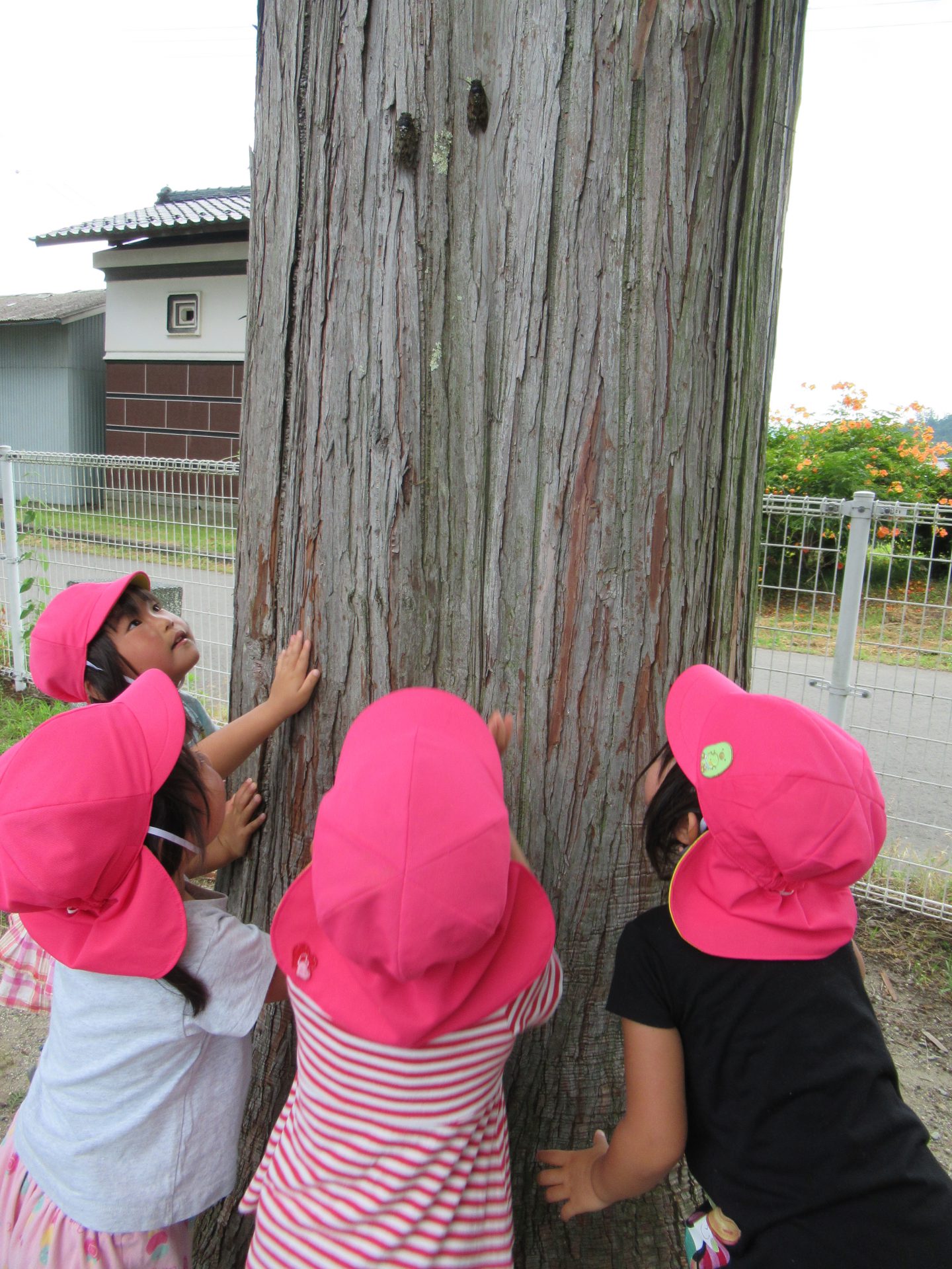 みんなで虫とり網をもってセミ探しに夢中になっています。
