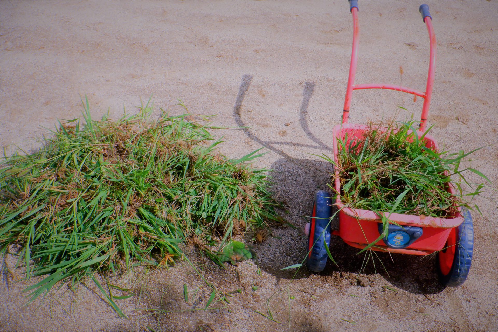 草取りがほぼ終わり、とった草が山盛りとなると、今度はおもちゃの車を使って運びます。そのうちには年中さんや年少さんまで、「草取りの輪」が広がりました。