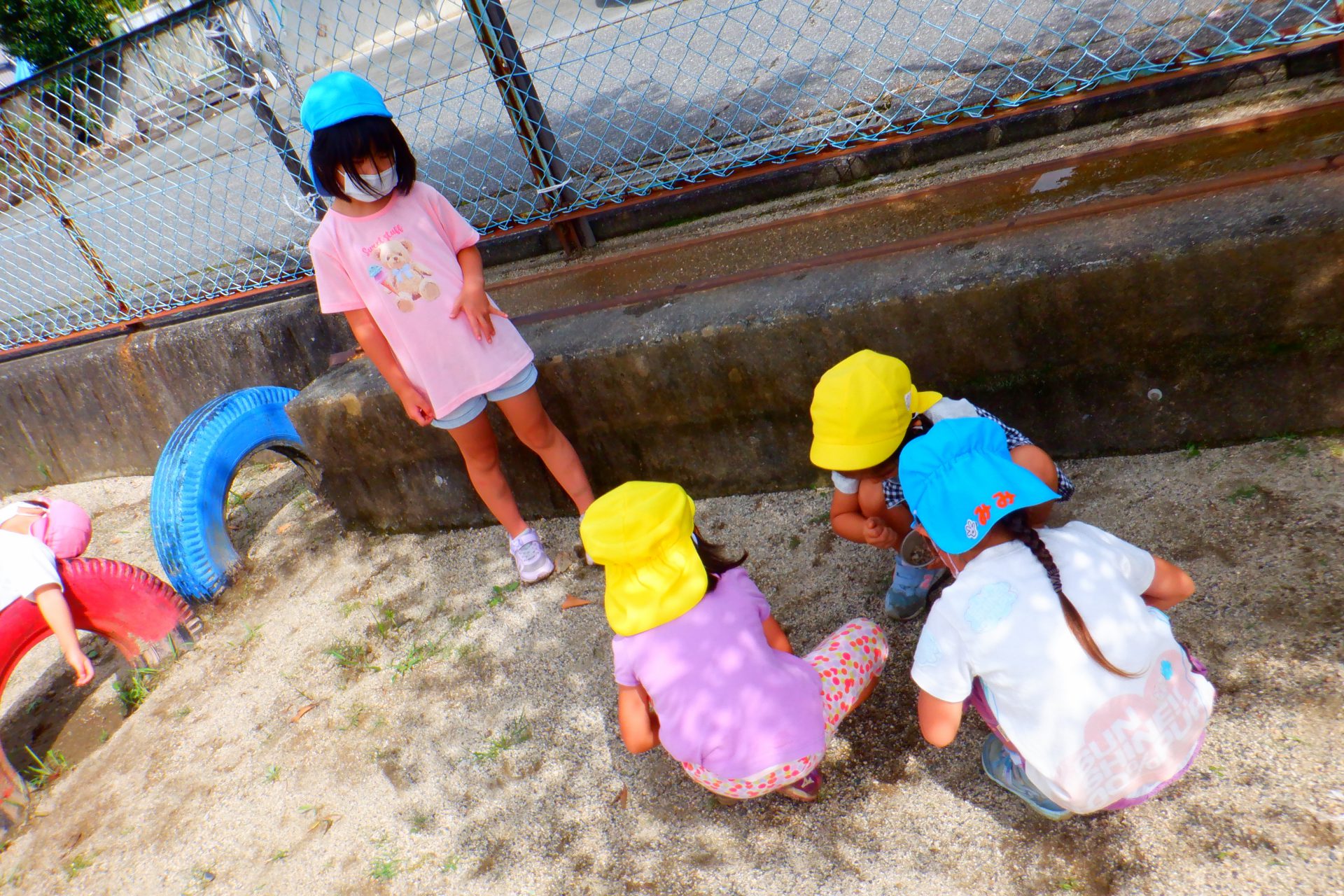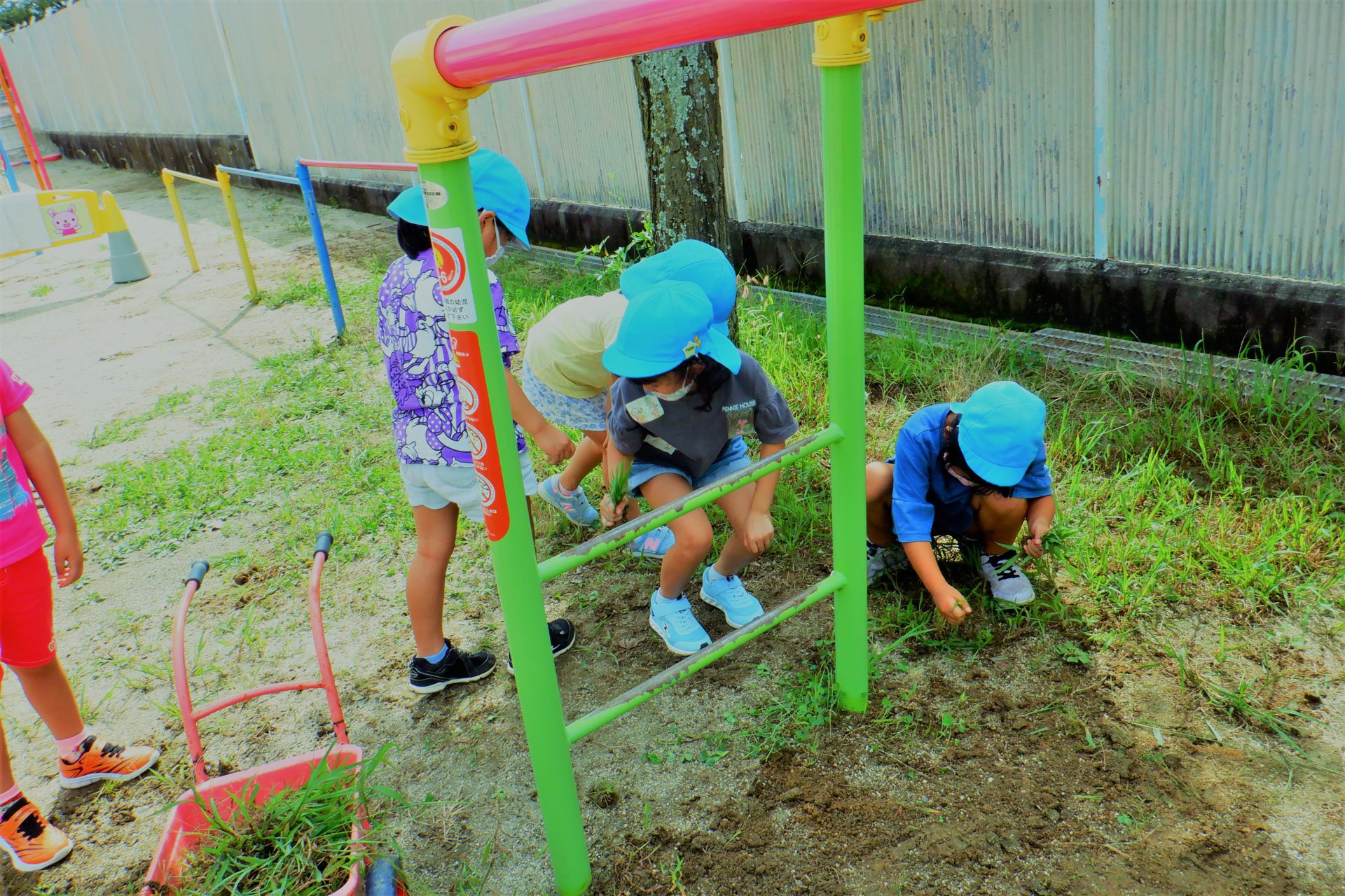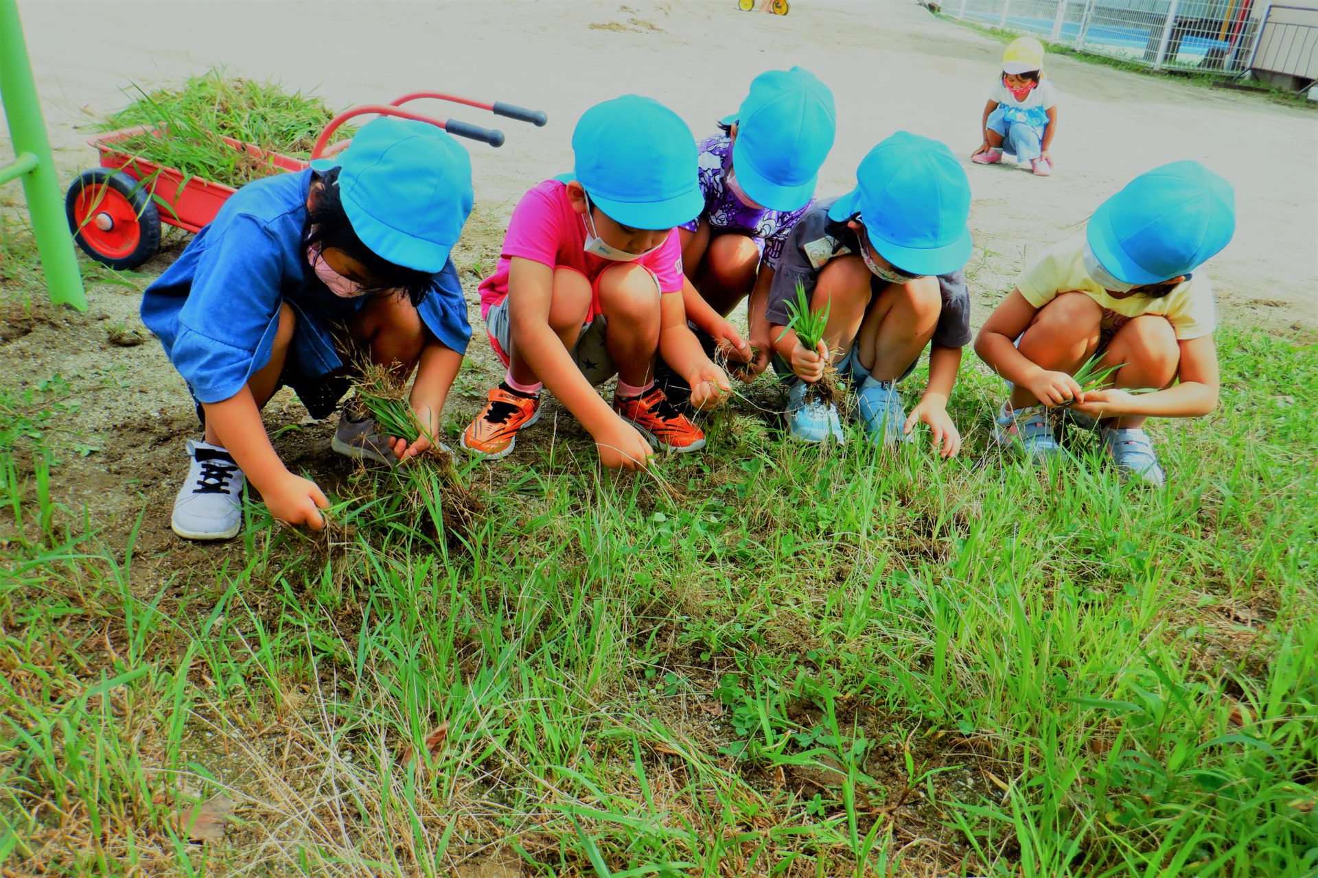 9月のはじめに、子どもたちにもその話をしてから、保育士が園庭で「草取り」を始めると、それを見ていた年長さんたちが「てつだおうか?」と集まってきて、一緒に草を取り出してくれたのです。