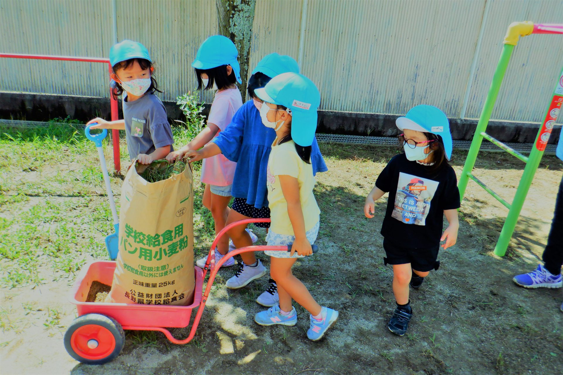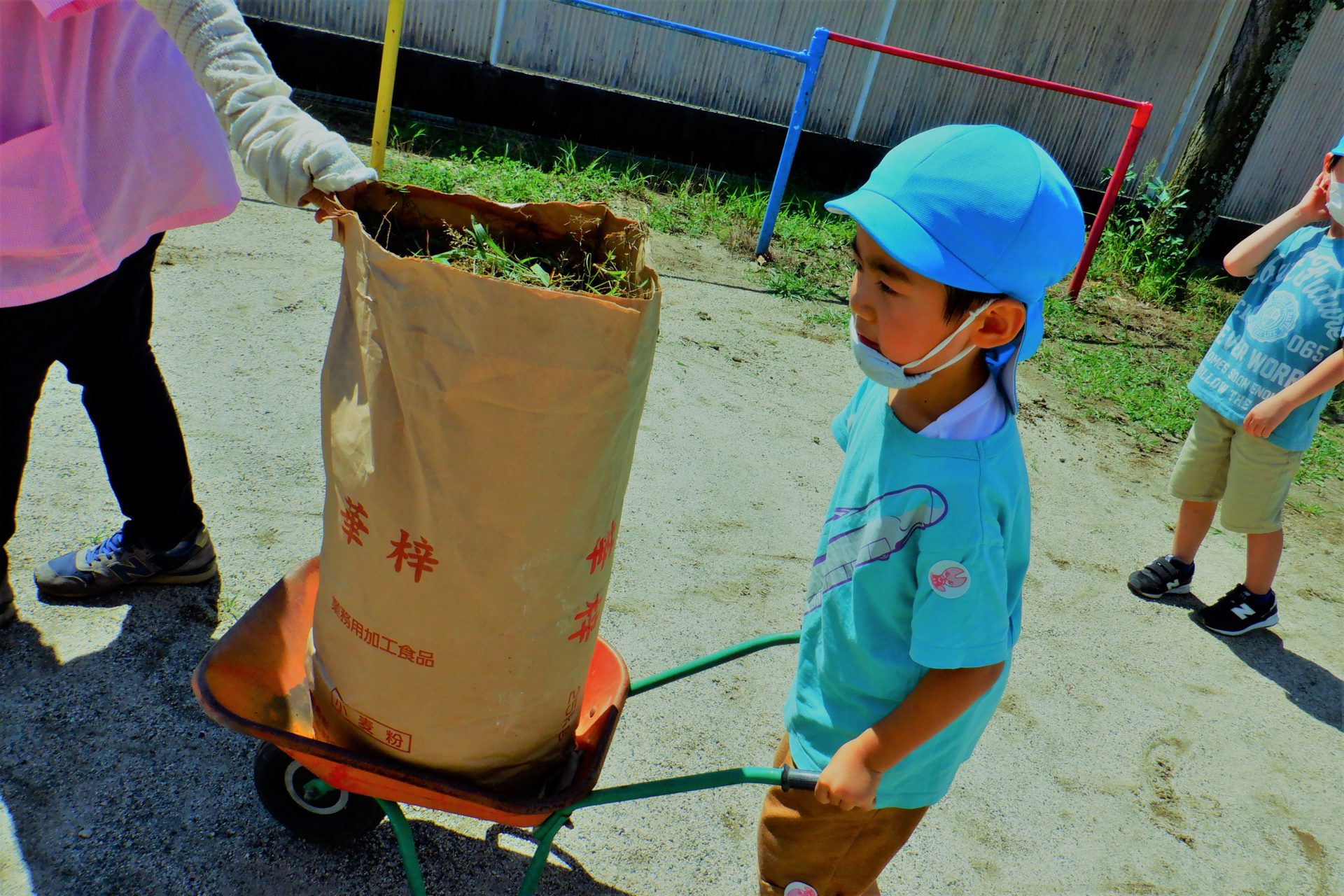 草取りがほぼ終わり、とった草が山盛りとなると、今度はおもちゃの車を使って運びます。そのうちには年中さんや年少さんまで、「草取りの輪」が広がりました。