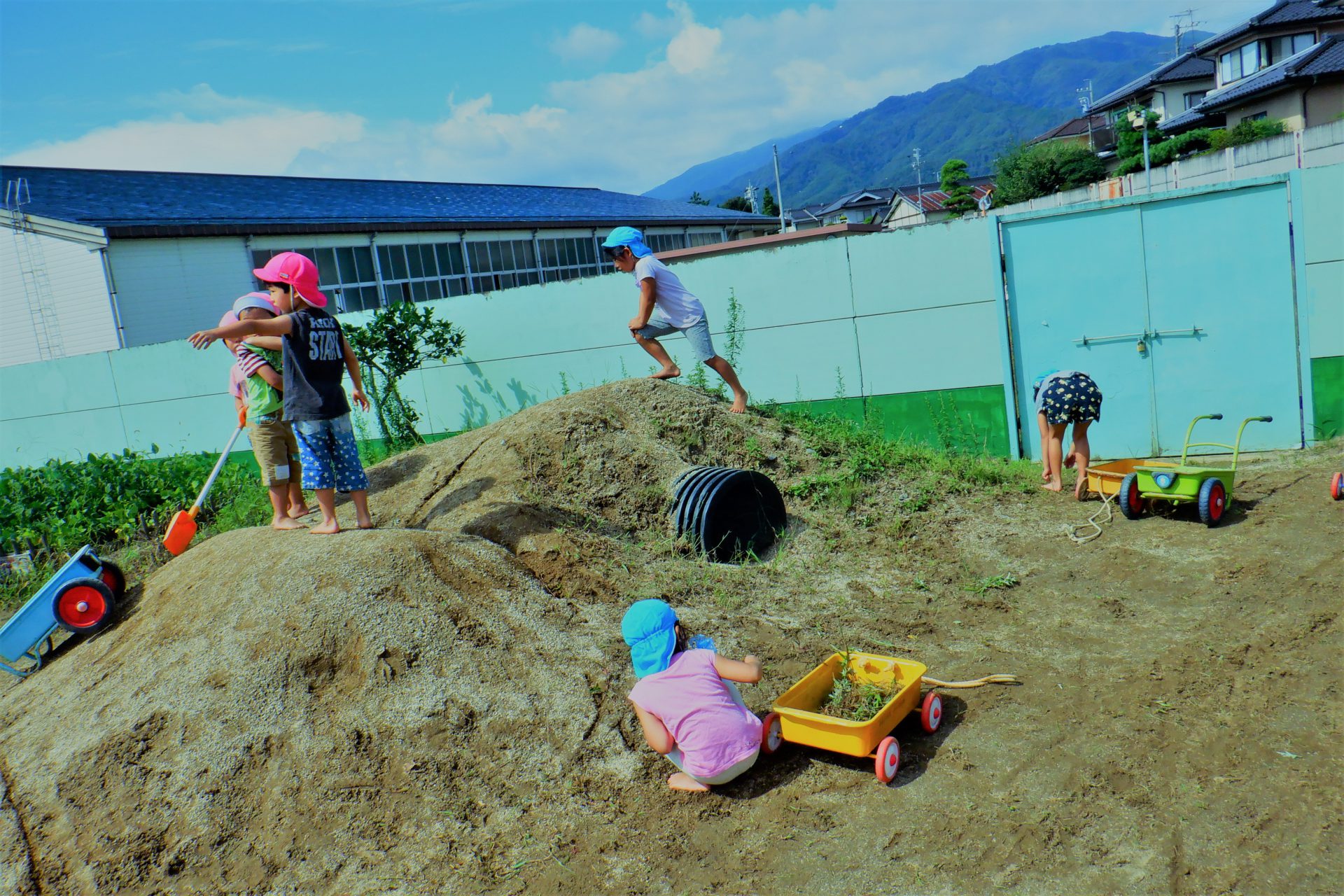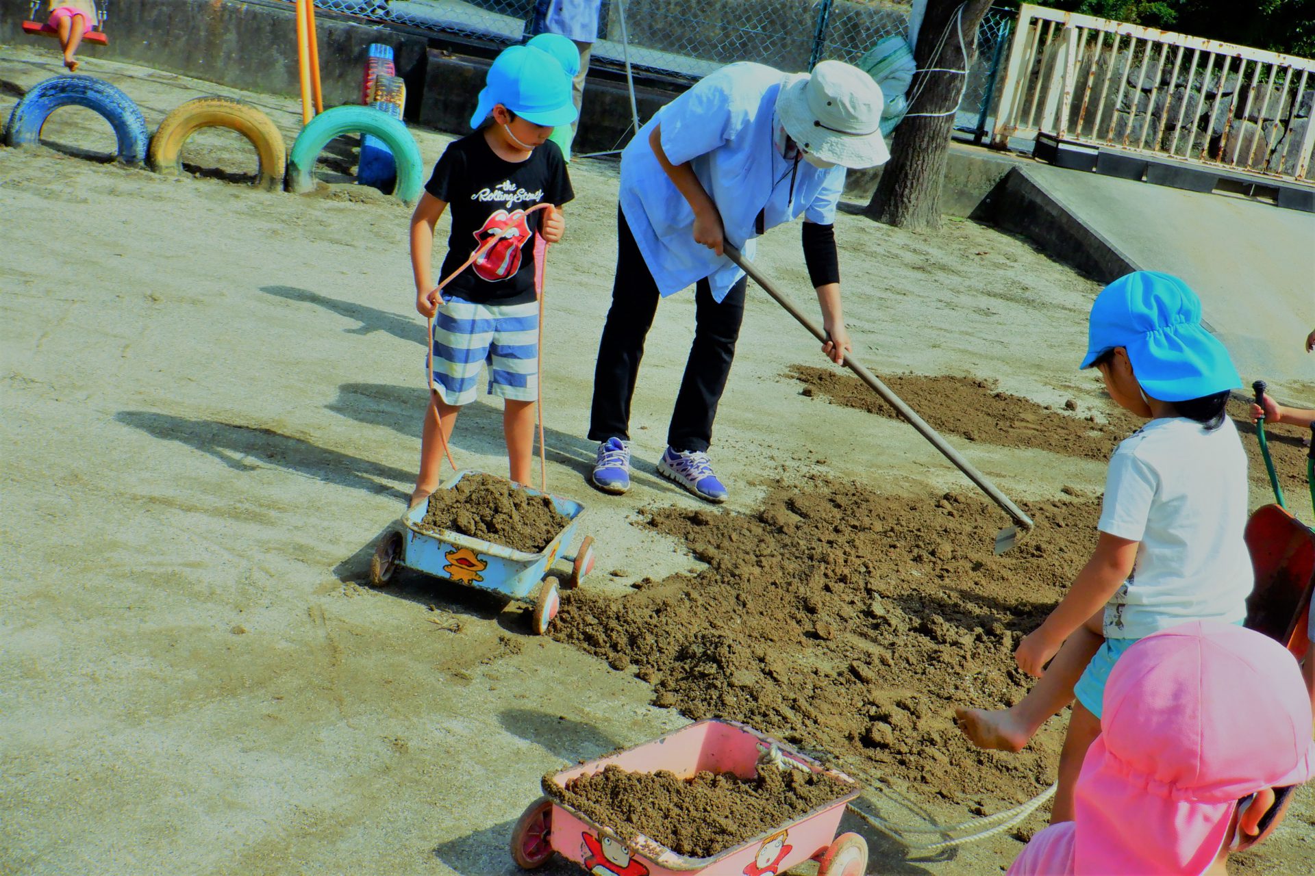 保育士が土を掘って運び始めると「工事するんだー」と年長と年中の男の子たちが近づいてきて、「手伝うー」と一輪車とシャベルをもってきてくれました。