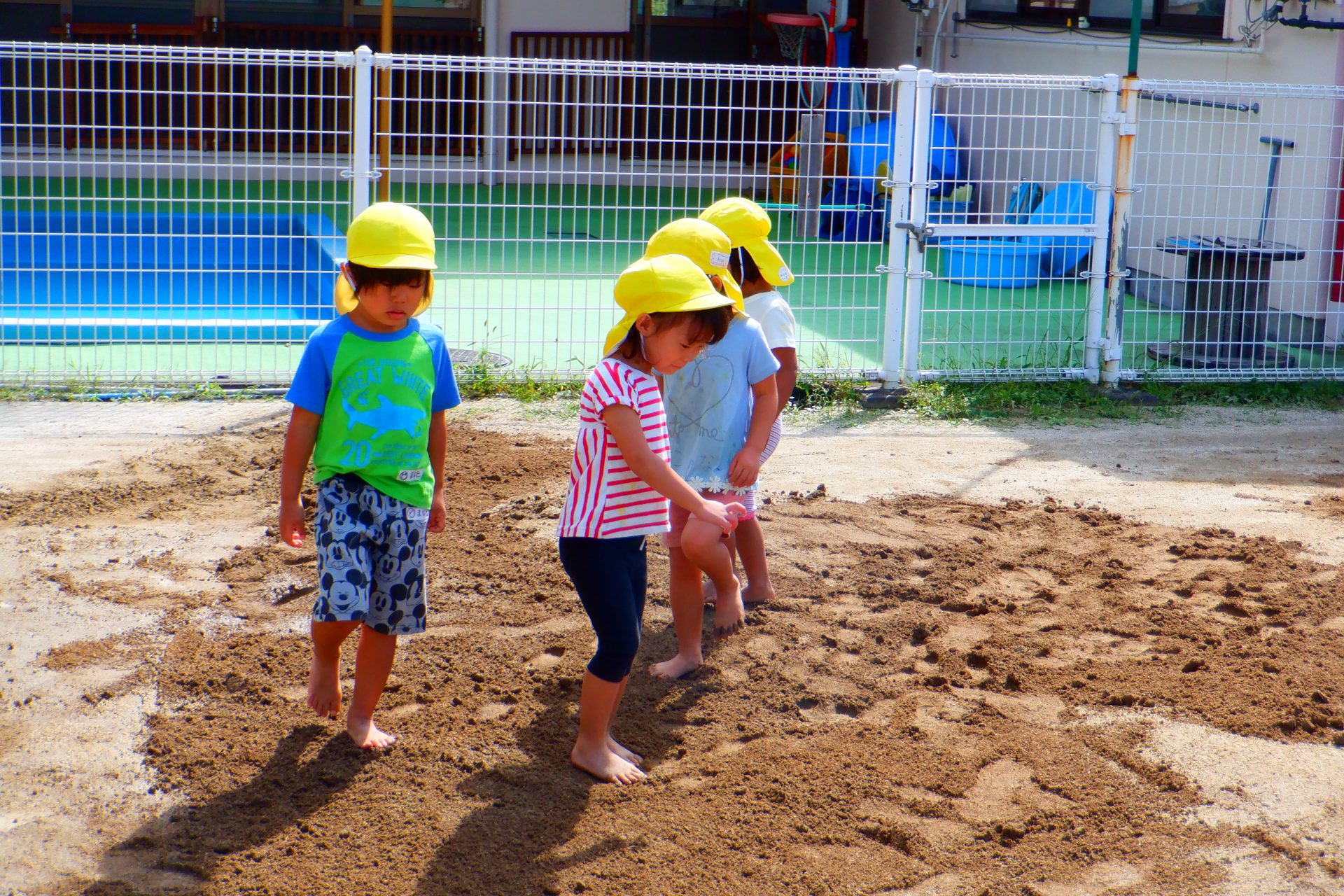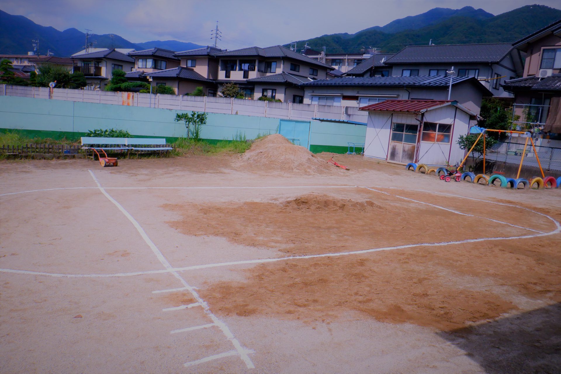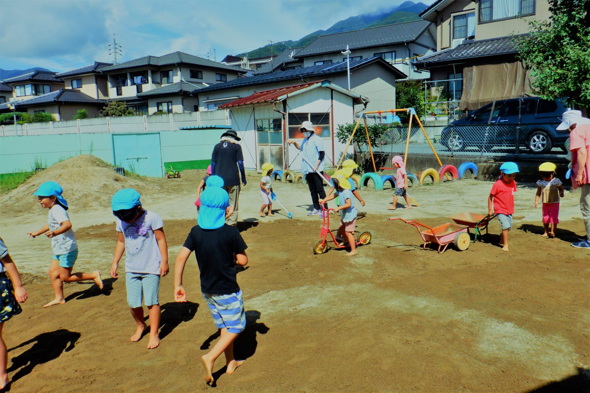 いつもはでこぼことした園庭が子どもたちと共に整備する中、たった2日でこんなにきれいに生まれ変わりました。保育士が働く姿を見て、自ら考え草取りや園庭整備を始めた子どもたち。感謝の思いと共に成長した姿をうれしく感じています。
