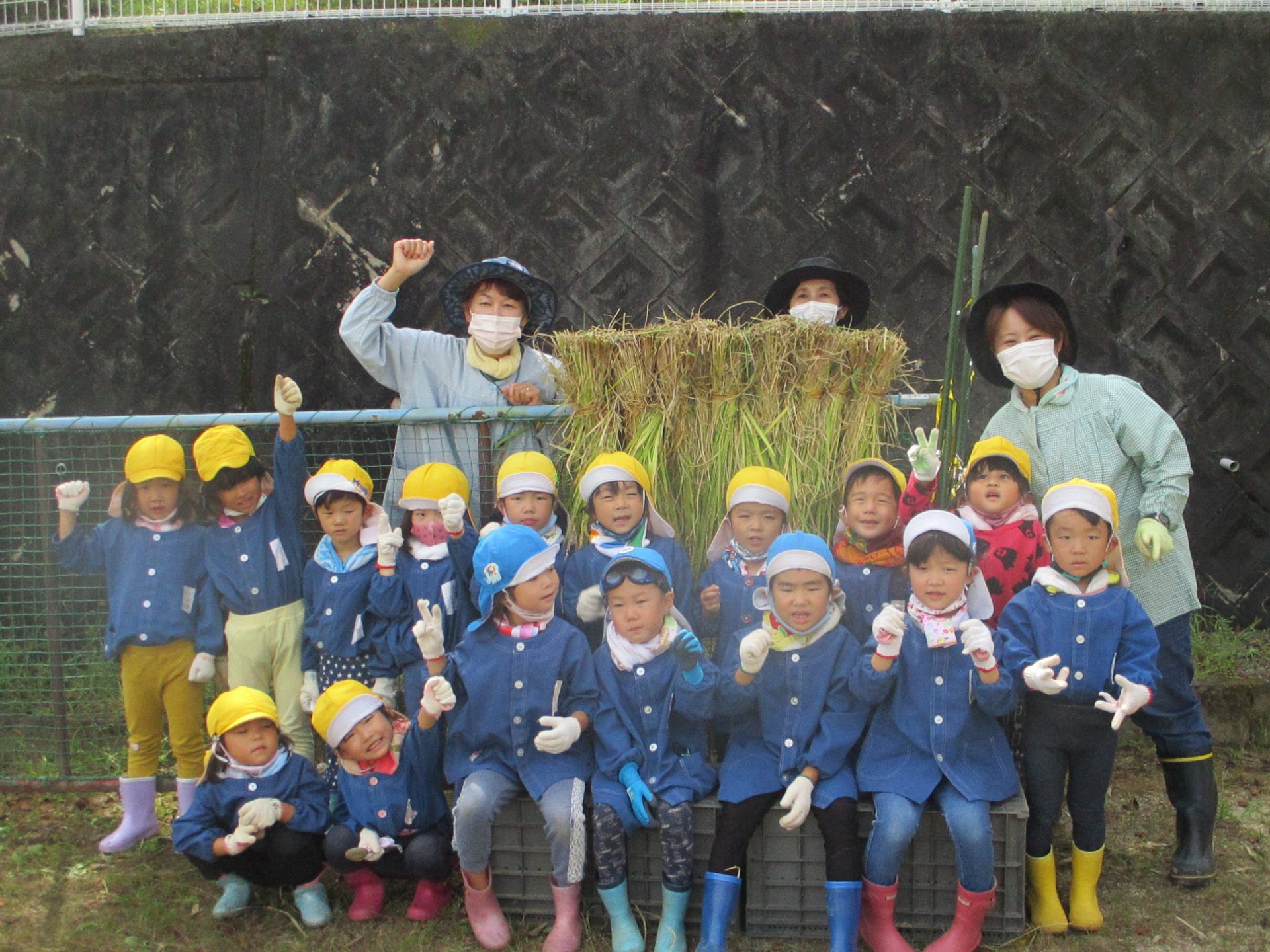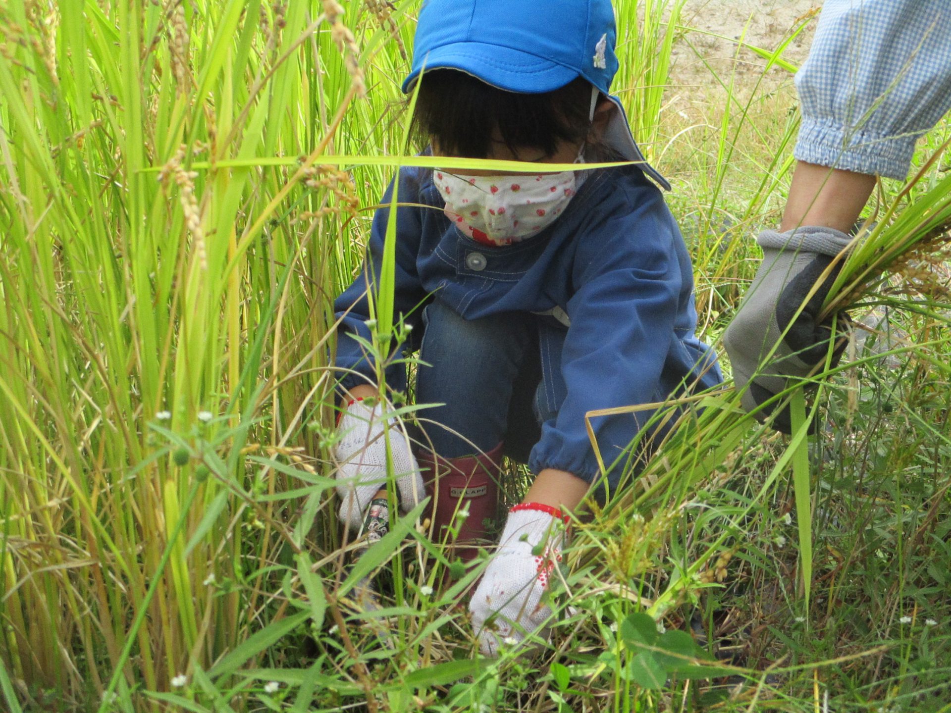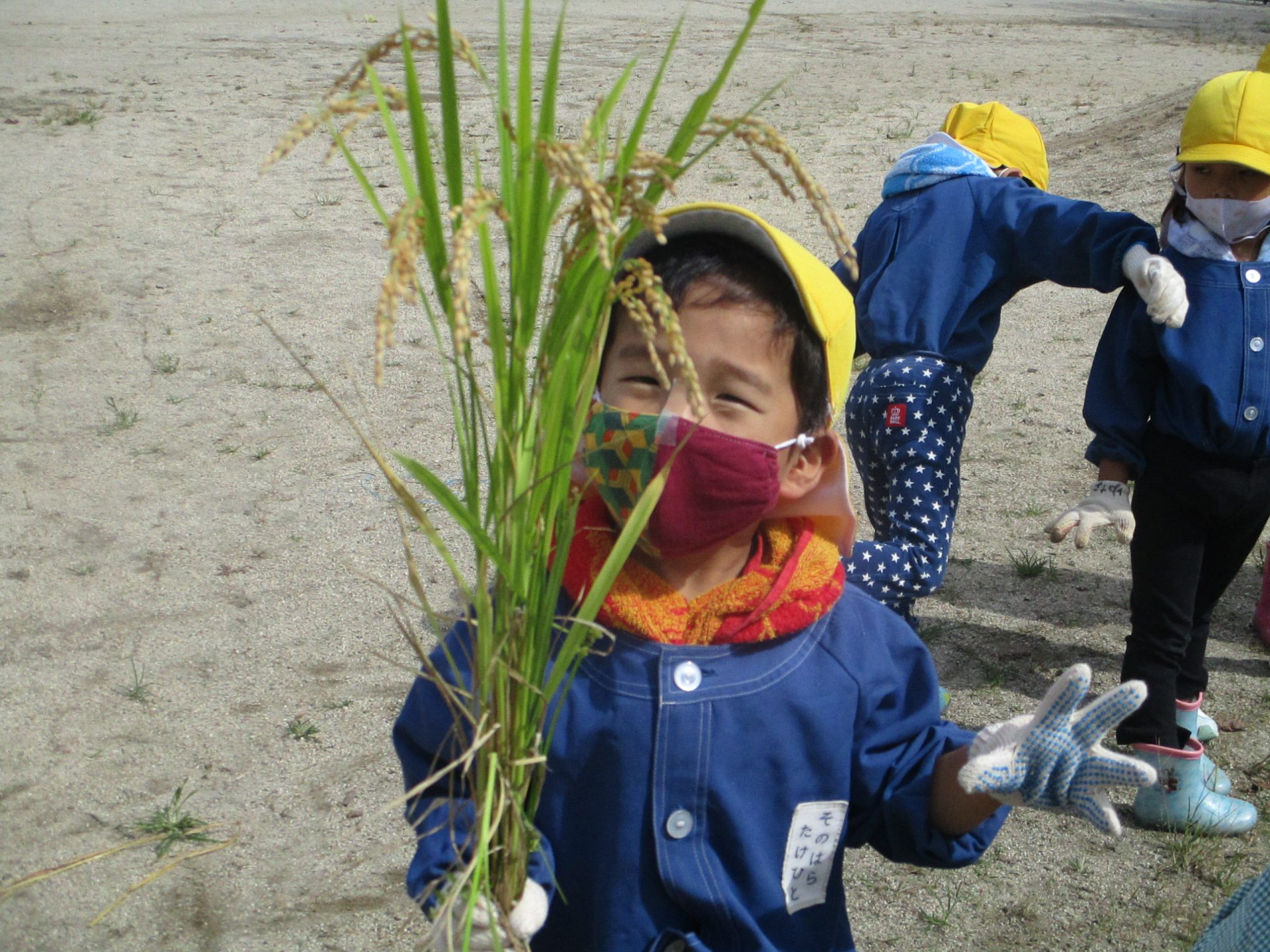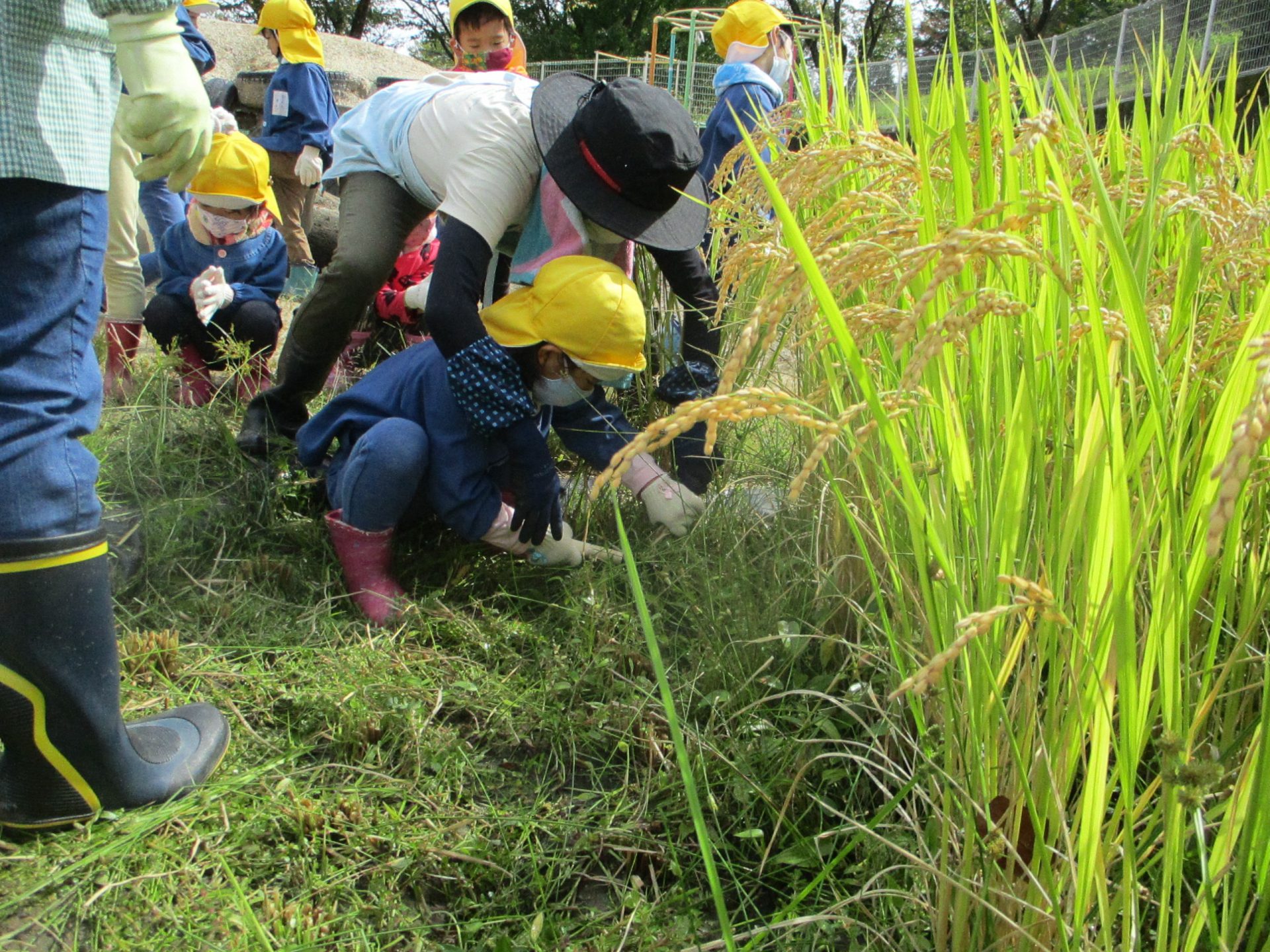 ・園庭の田んぼで田植えをしてから、稲の生長する姿を見守ってきた子どもたちだったので、稲刈りを楽しみにしてきました。年長児は昨年様子を見ていたこともあってか、久保田さんの説明をよく聞いていてすぐに覚え、上手に刈ることができました。体の使い方も上手になってきたことを感じました。