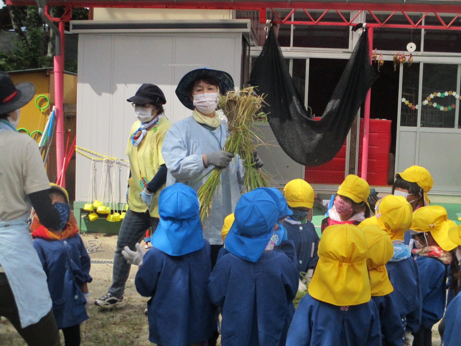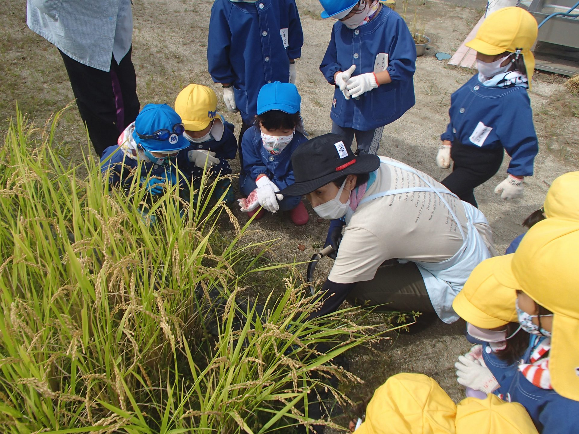 お田植えのときにもお世話になった地域の久保田さんに教えていただきながら年中さん・年長さんが一株ずつ丁寧に鎌で稲刈りをしました。