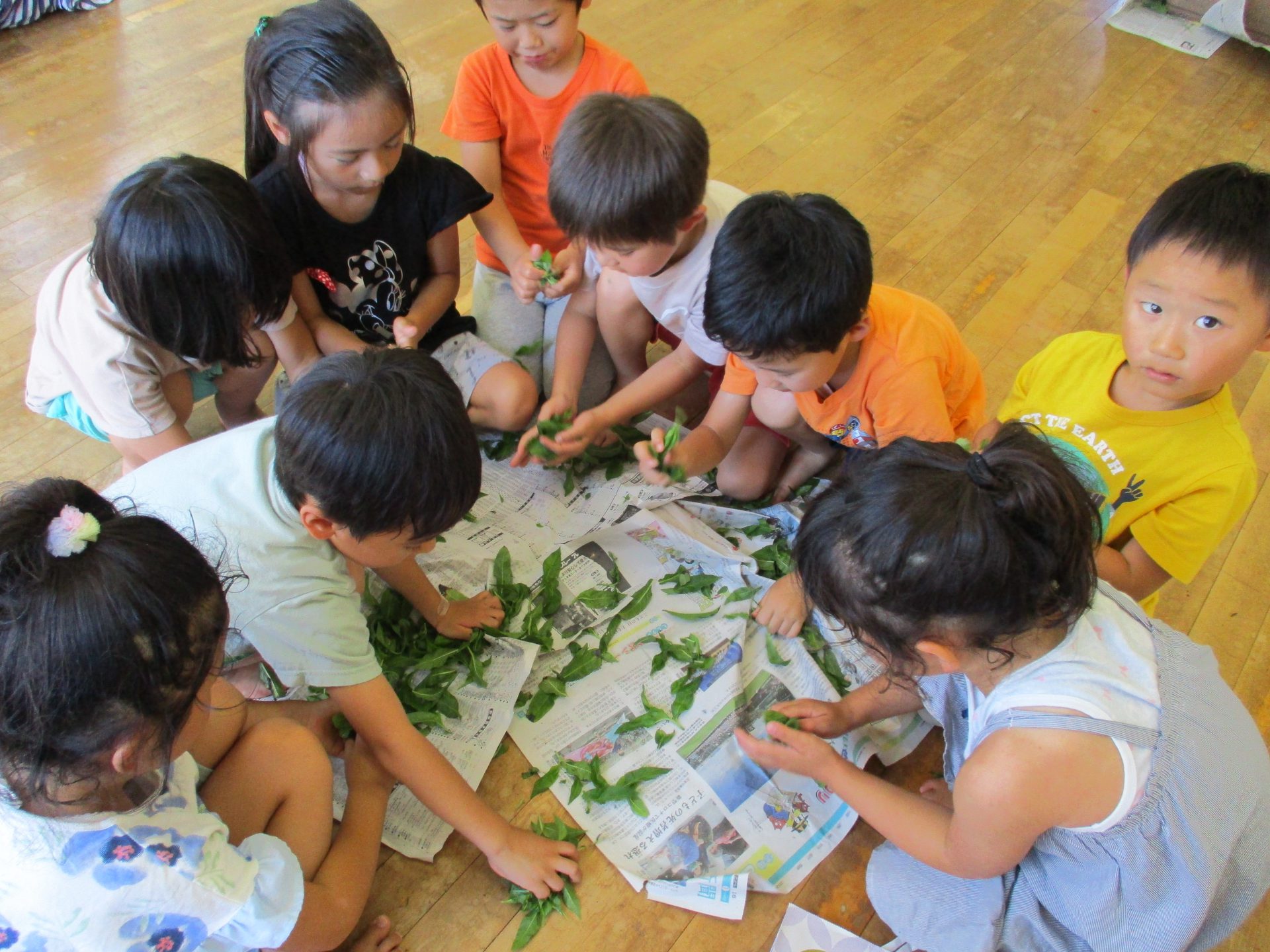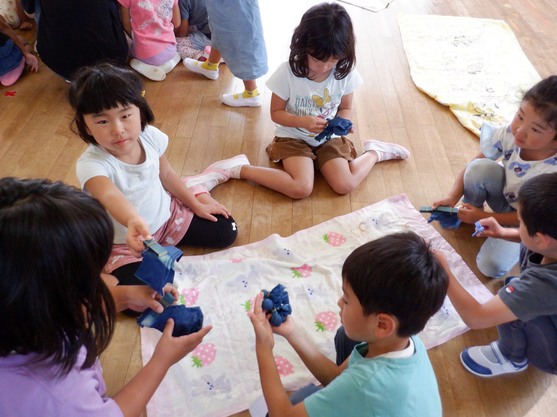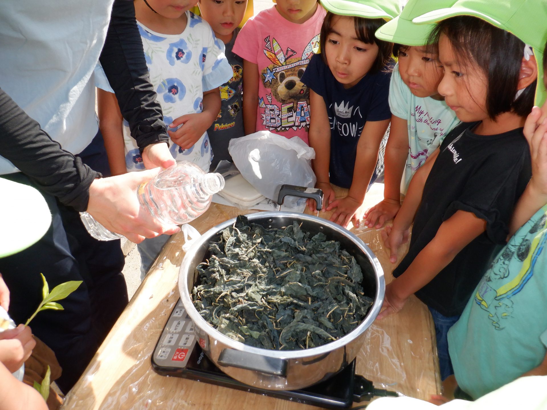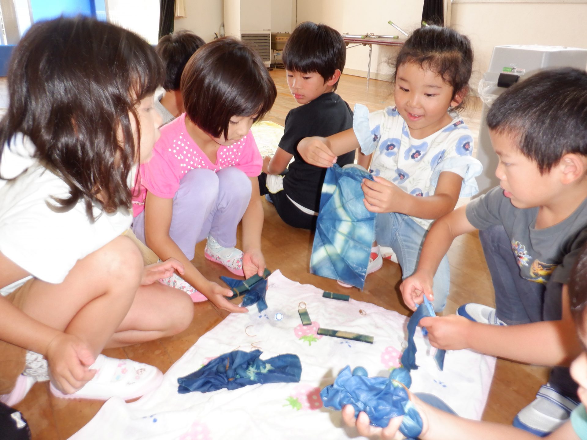 担任が好きで始めた染物の活動。春から、散歩で摘んだよもぎや小学校からいただいたつつじを使って染物をしてきました。藍染をやってみたいと思っていた担任は子どもたちと藍の種をまき、育ててみることにしました。藍染の過程で乾燥した藍の葉の匂いや染まった布が空気に触れて色が変化する様子を保育士も子どもたちと一緒に気づき、感動することができました。今回は自分たちが運動会で使うはちまきや育てた蚕の絹糸を染めたことでより興味を持てたのではないかと思います。春からの活動を通して子どもたちはさらに「ほかの植物でも染めてみたい」と染物に興味を持っています。今後も真島の自然や身近な植物を使って染物を行い、自然物の美しさや不思議さを感じていけたらと思います。
