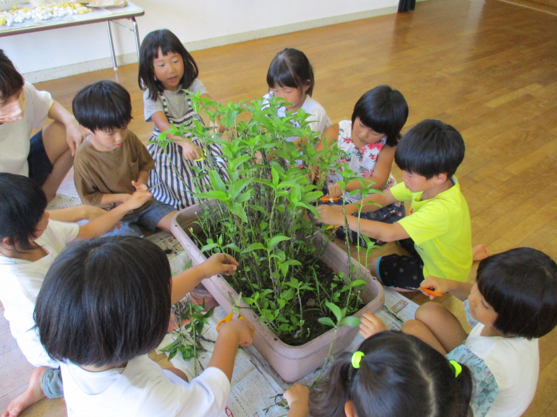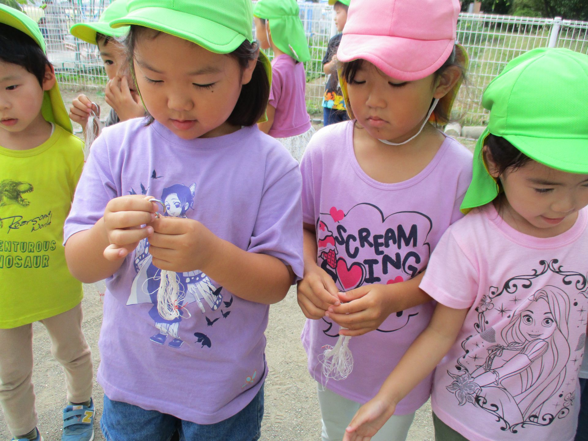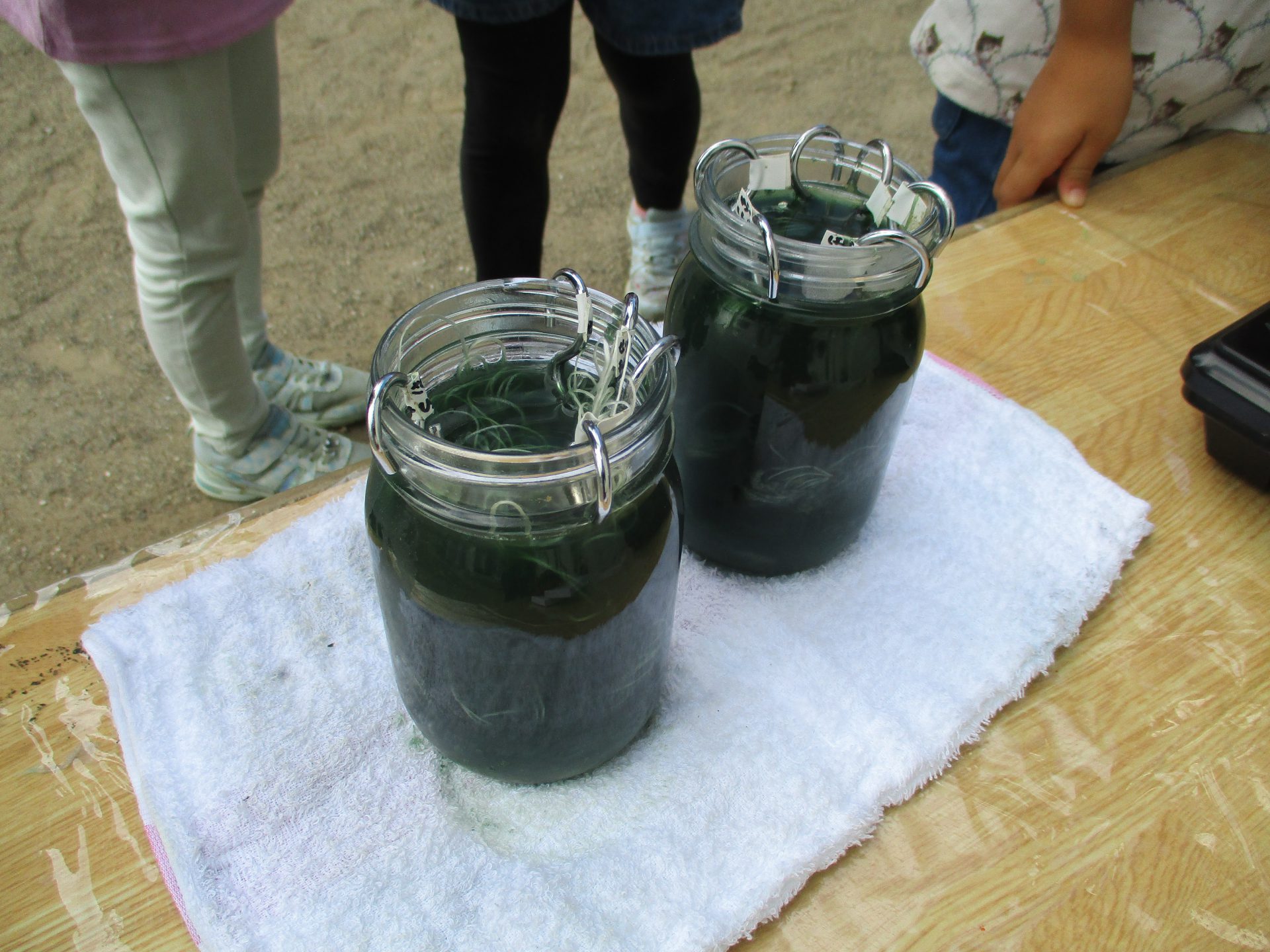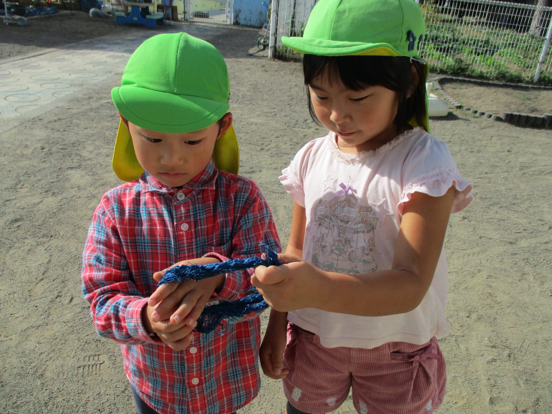 担任が好きで始めた染物の活動。春から、散歩で摘んだよもぎや小学校からいただいたつつじを使って染物をしてきました。藍染をやってみたいと思っていた担任は子どもたちと藍の種をまき、育ててみることにしました。藍染の過程で乾燥した藍の葉の匂いや染まった布が空気に触れて色が変化する様子を保育士も子どもたちと一緒に気づき、感動することができました。今回は自分たちが運動会で使うはちまきや育てた蚕の絹糸を染めたことでより興味を持てたのではないかと思います。春からの活動を通して子どもたちはさらに「ほかの植物でも染めてみたい」と染物に興味を持っています。今後も真島の自然や身近な植物を使って染物を行い、自然物の美しさや不思議さを感じていけたらと思います。