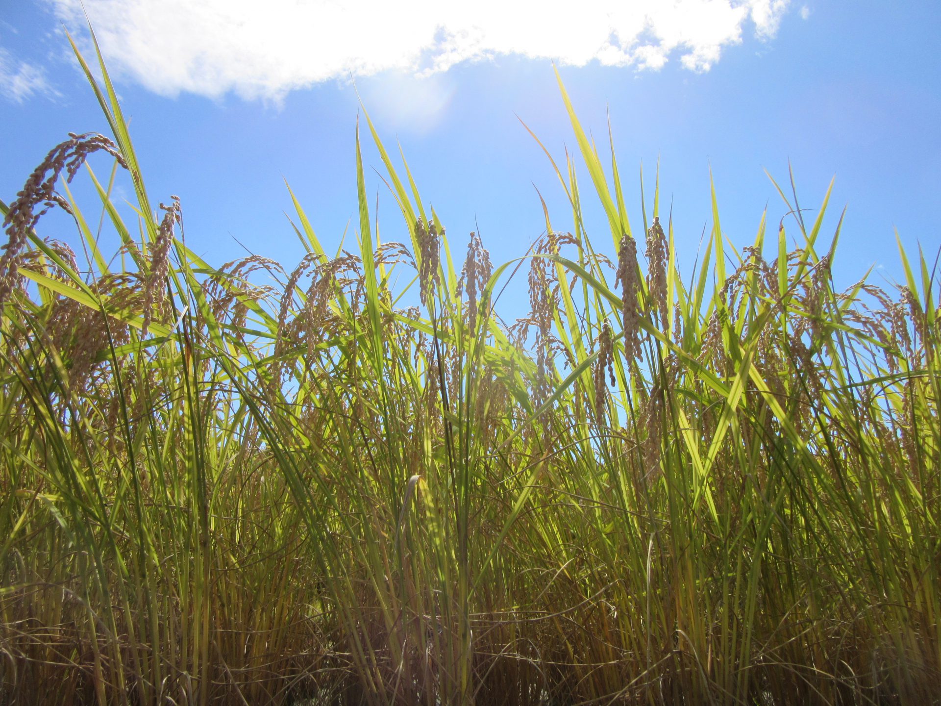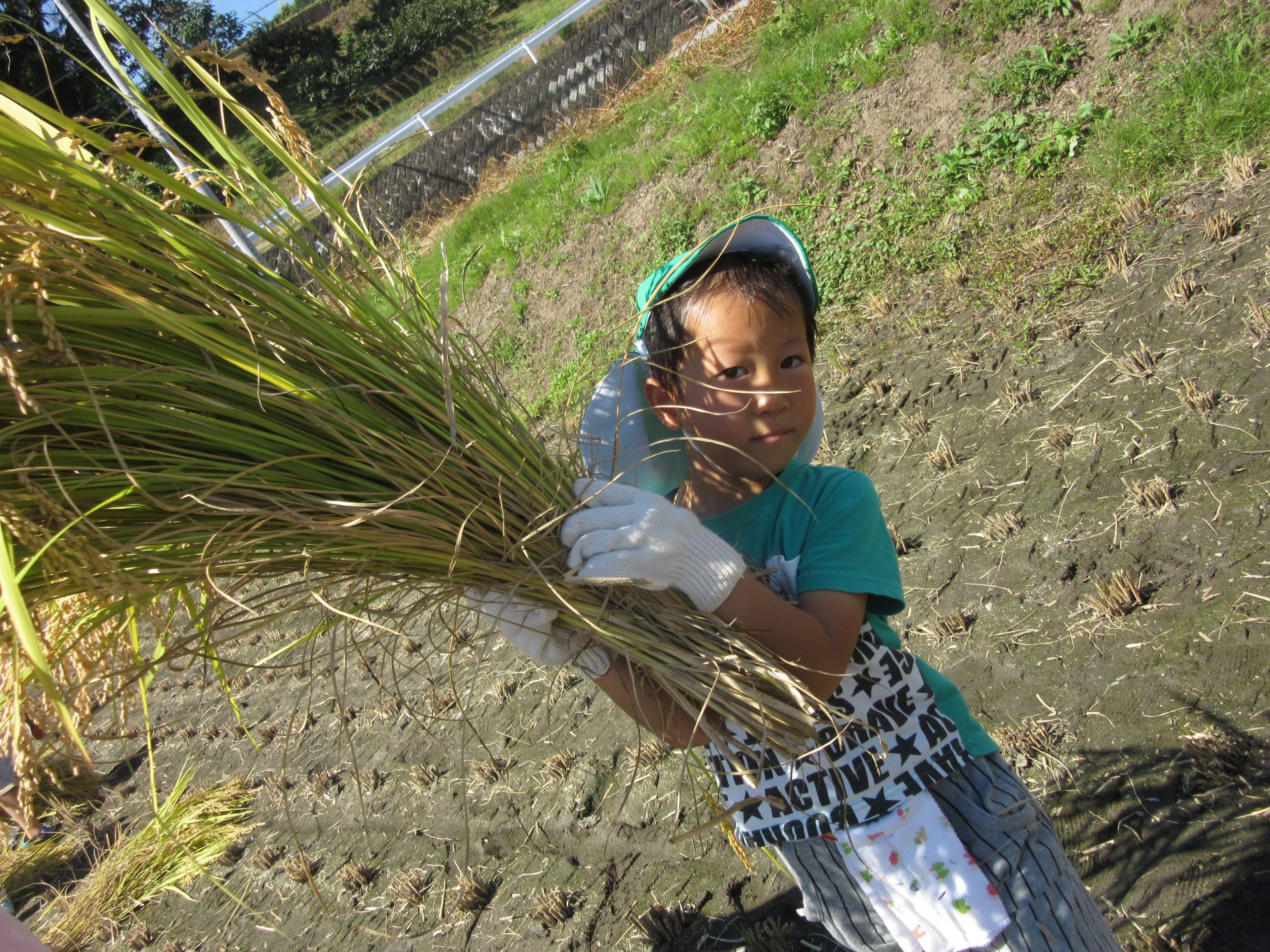 田植えをした5月の頃は25㎝の苗だったのが、1m近くまで生長した稲は頭を垂らし、黄金色に光り輝いていました。