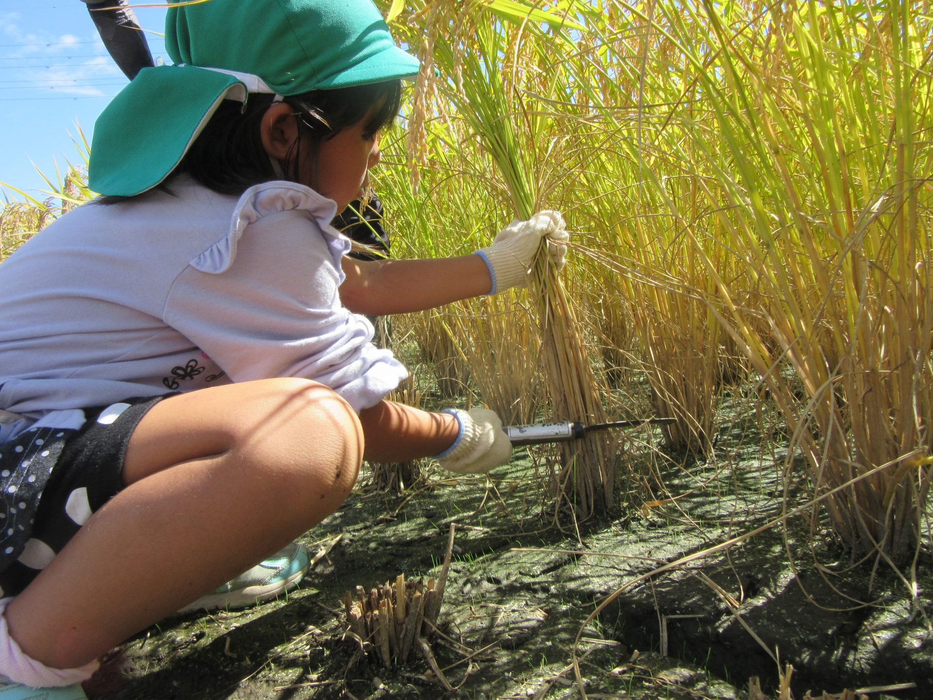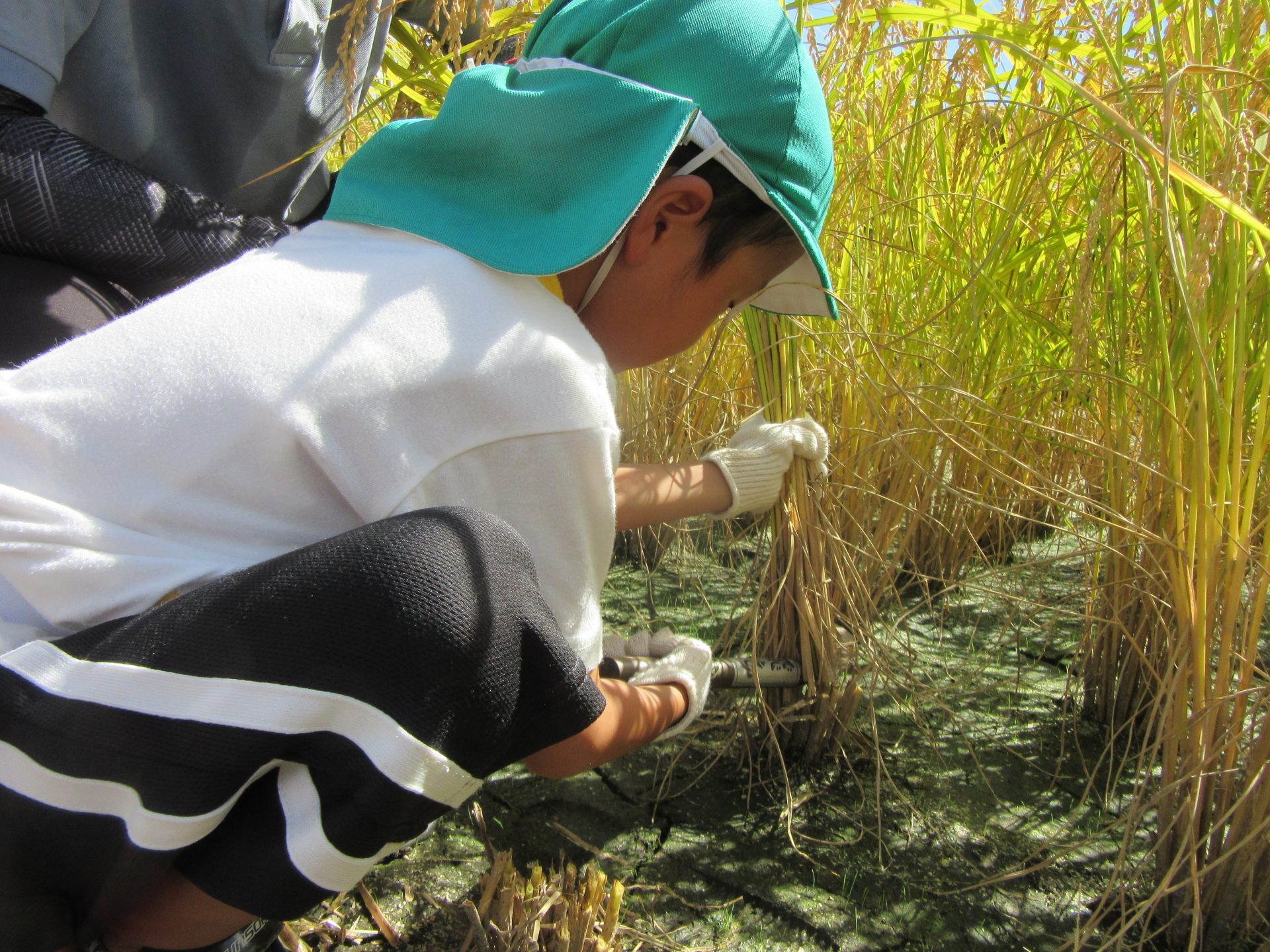 ・鎌を使い稲刈りを行う中で