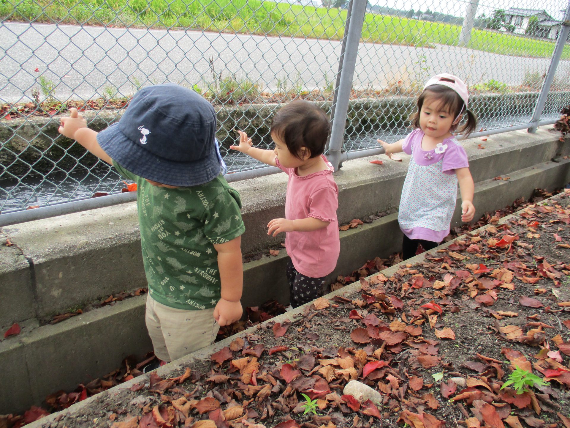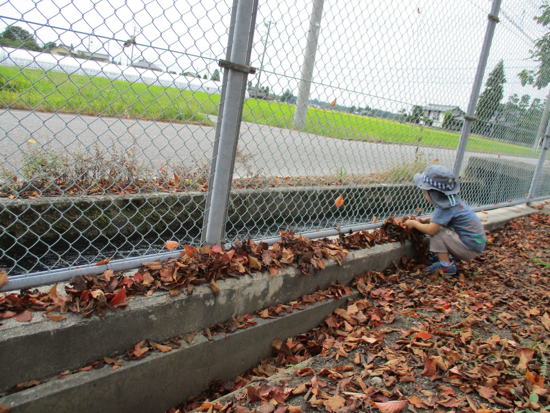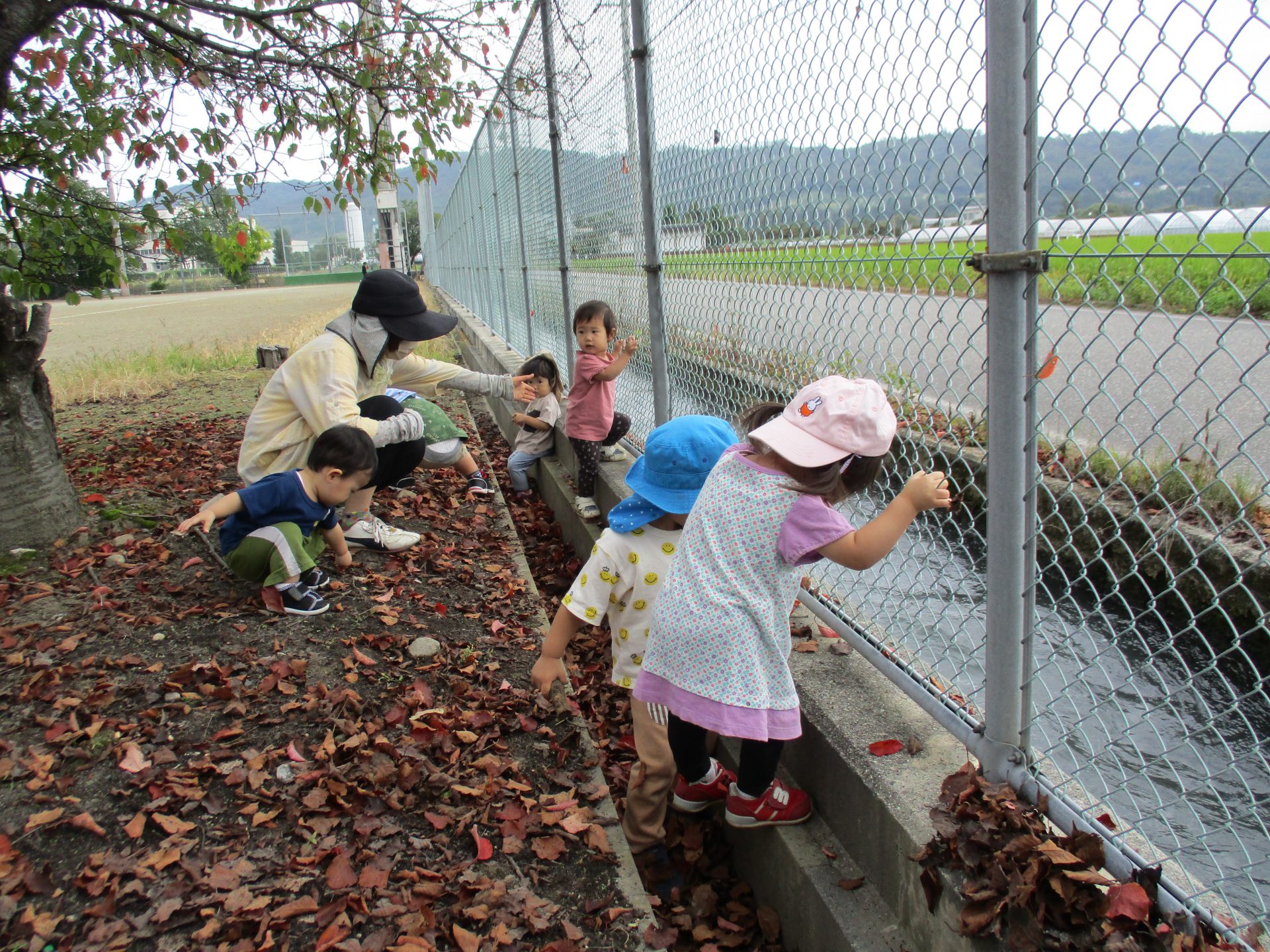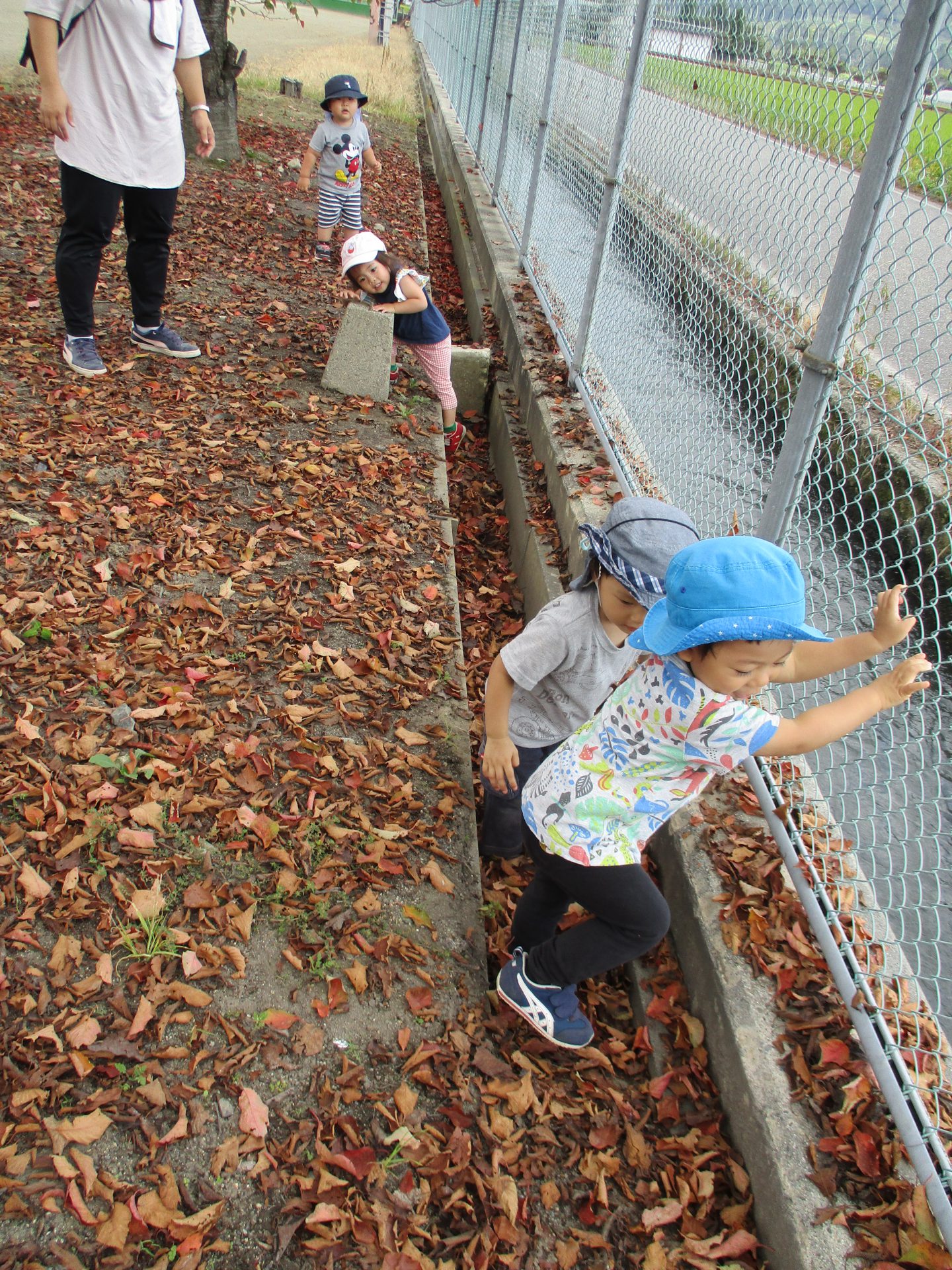 保育士の「サクサク音がするね」のひと言でみんなが溝に入って落ち葉の音を楽しんでいました。