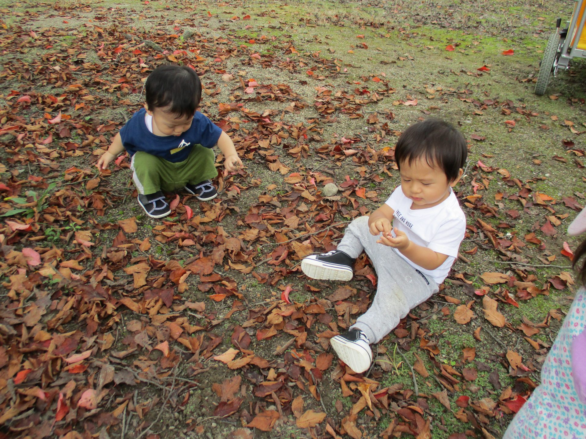 たくさん葉っぱからイメージが浮かんであそべる0・1歳児さんこれからもたくさんいろんな自然に触れて気づき友達や保育士と共感していきたいです。
