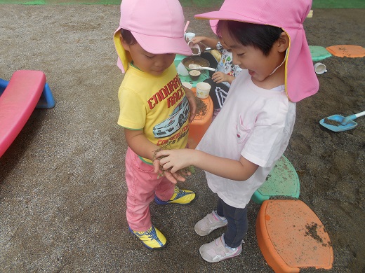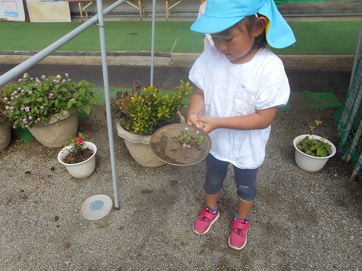 雨降りのお土産、バケツやお皿などに水がたまっているのを発見すると、子ども達の目はきらきら輝きます。