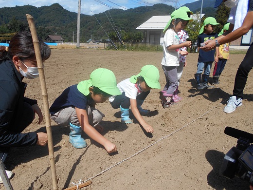 今回は、年長児が地域の方と一緒に野沢菜の種まきを行いました。