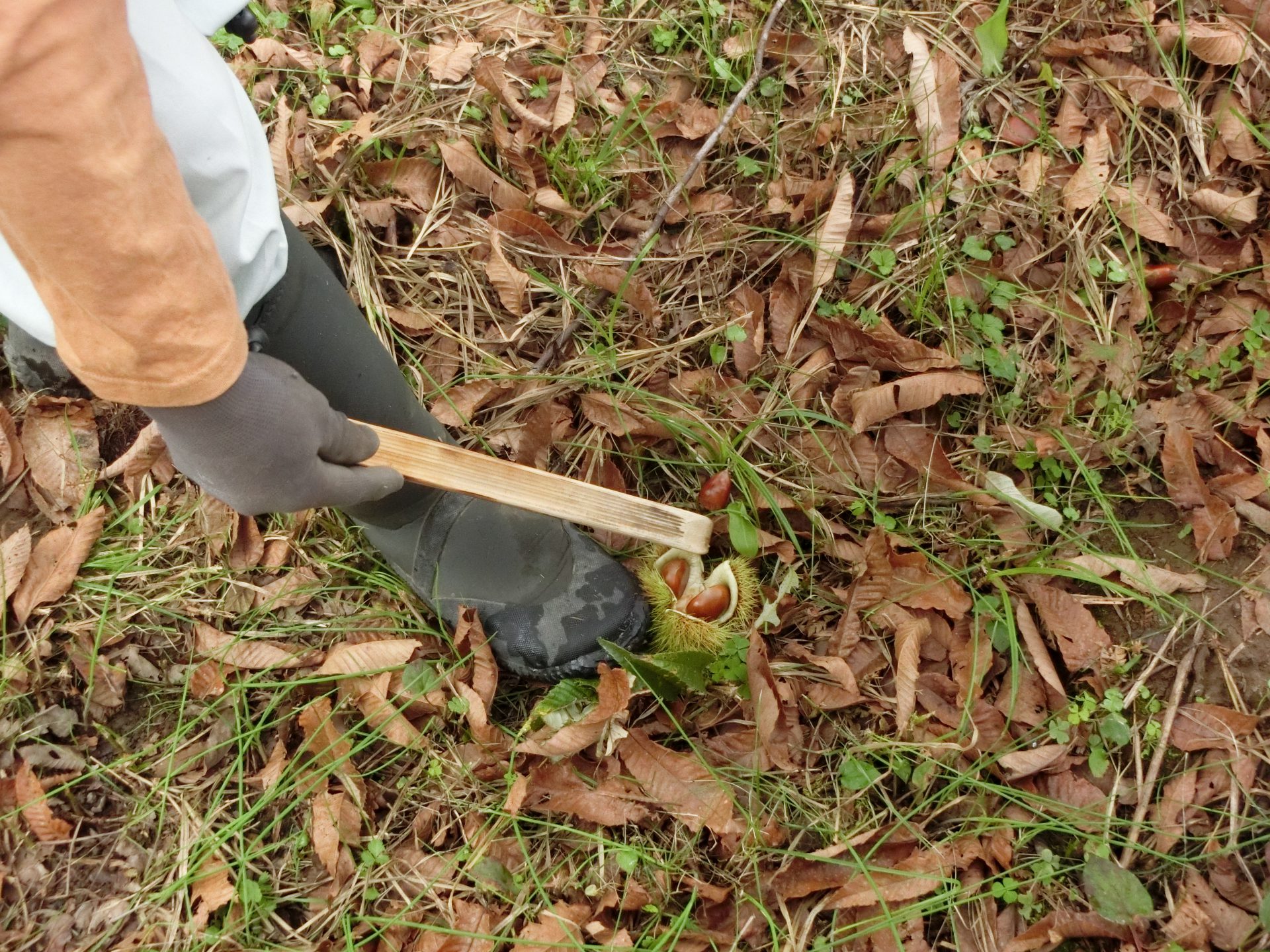 この棒を使えば、いがの中に入ってる栗をいがに触らずにとることができます。すごい!