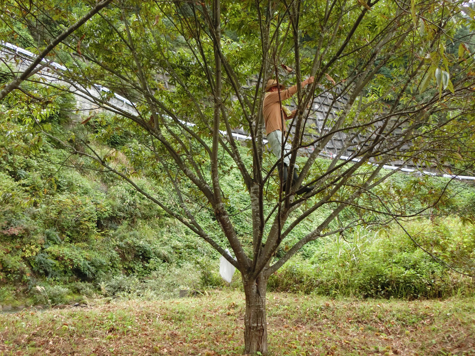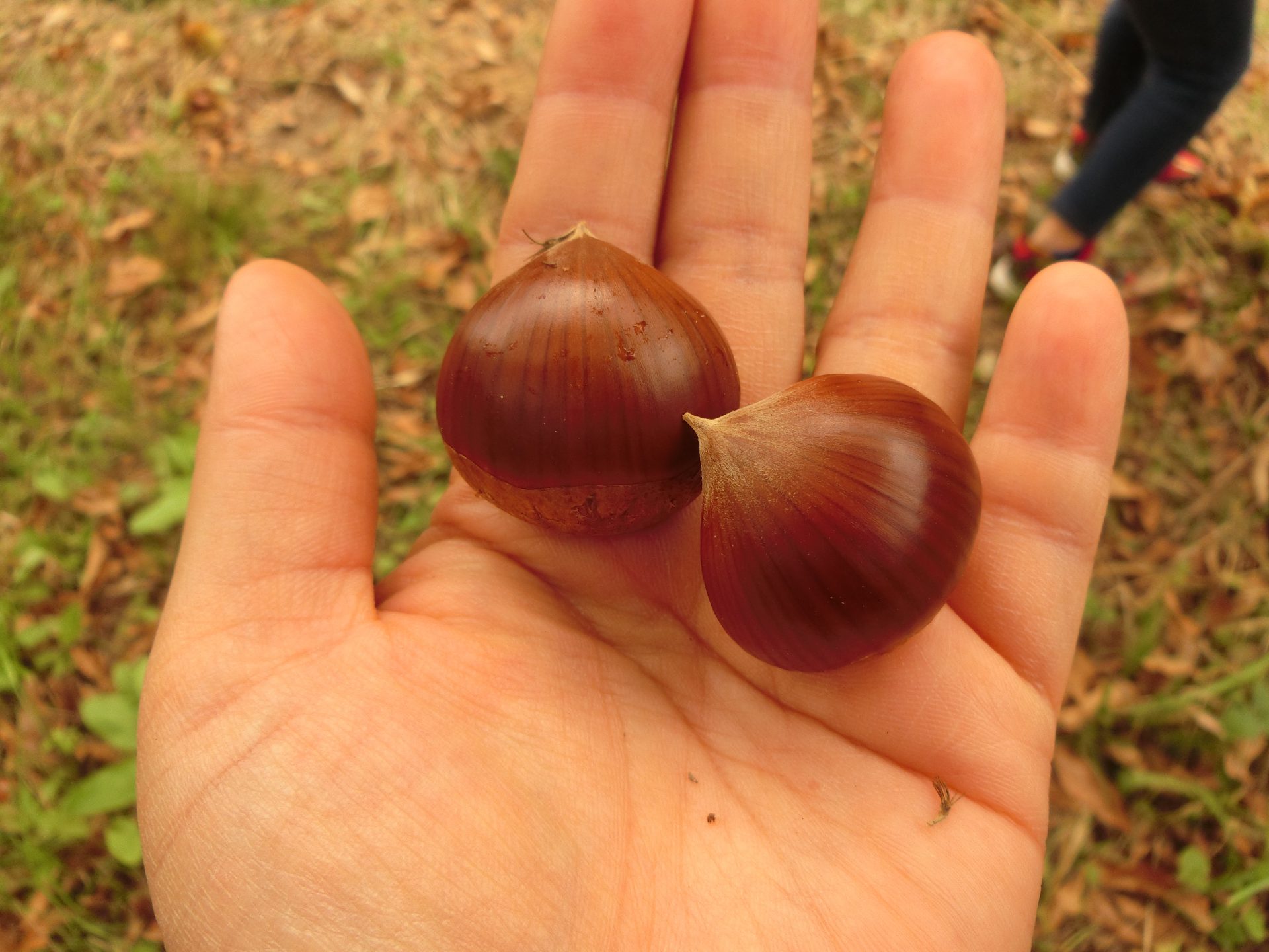 松本さんが、木をゆすって栗を落としてくれました。「すごい!たくさん落ちてきた!!」