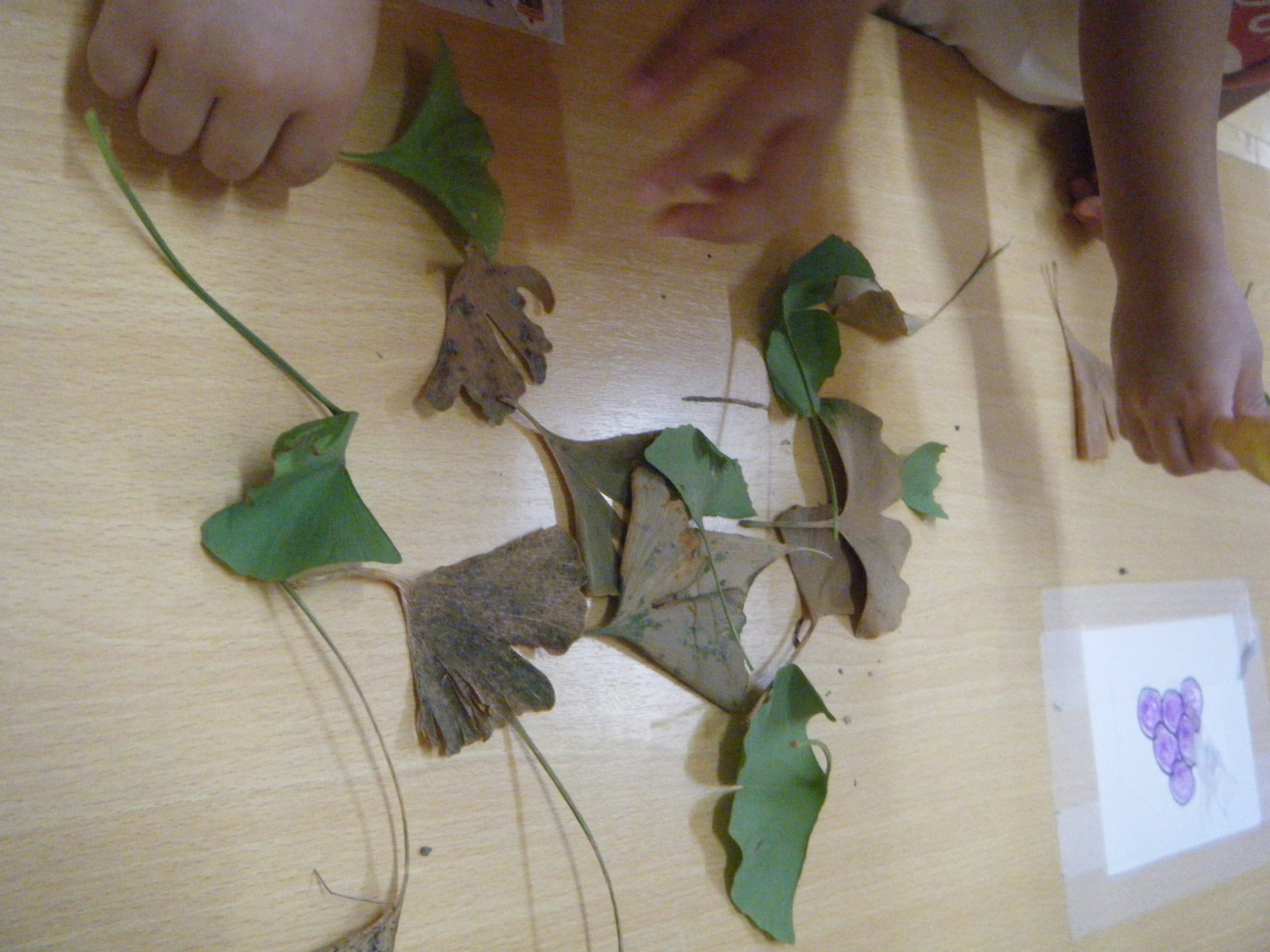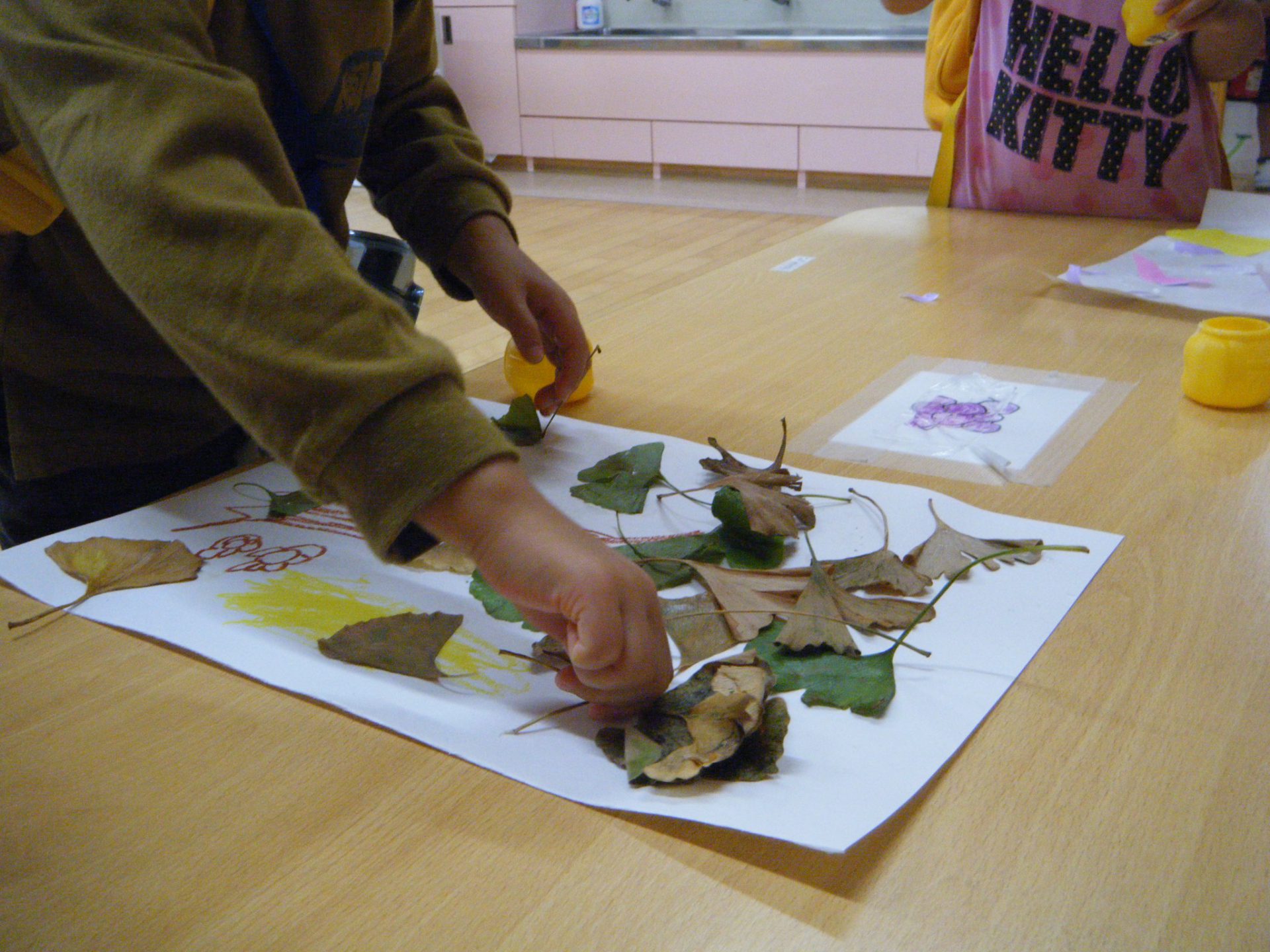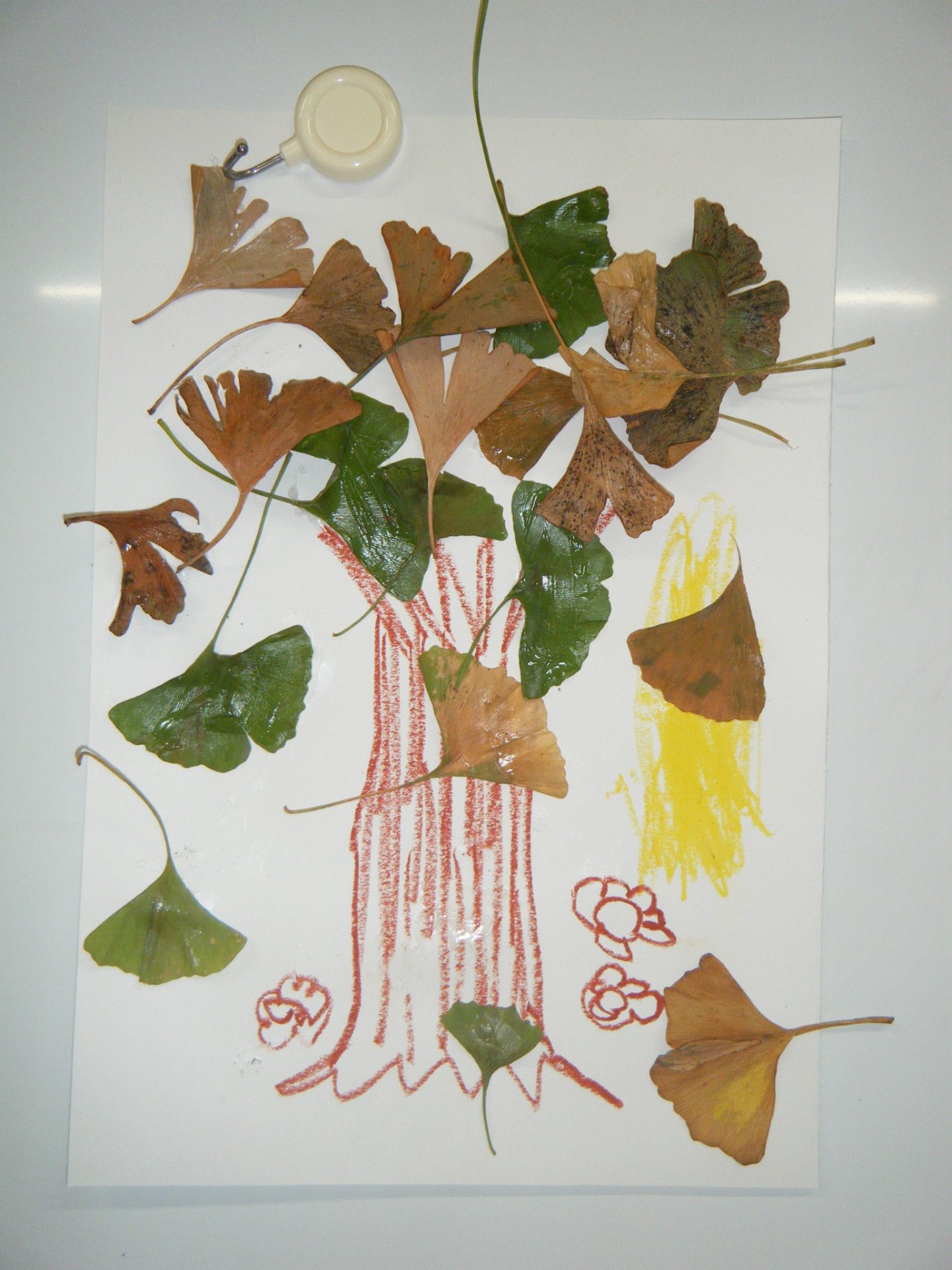 ちょうど、紙をちぎってのりで貼るあそびに凝っていたので、イチョウの葉も紙に貼ってみました。