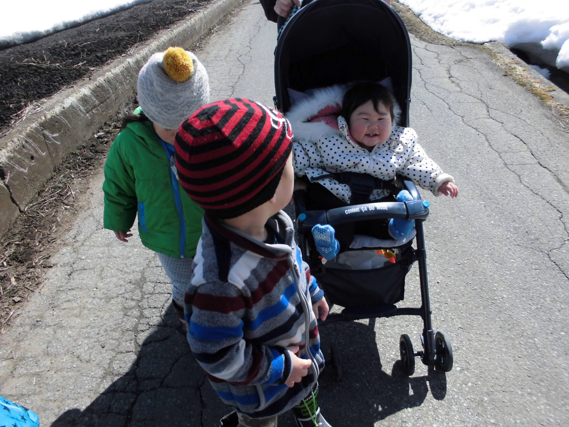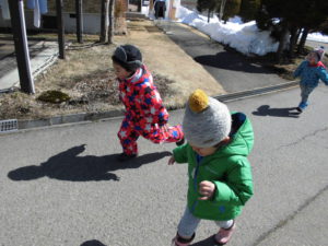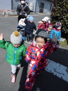 久しぶりの散歩でしたが、道路に出ると自然と端を歩き、お友だちを追い越さないように速さを調節したりして、歩き方がとても上手になりました!