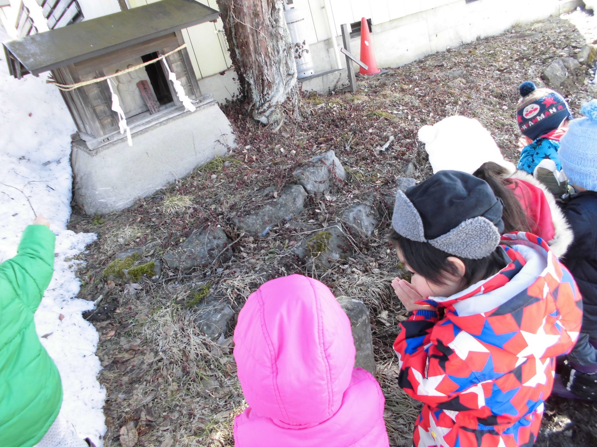 子どもたちが見つけたのは、小さな神社。神さまにお参りをしてきました!
