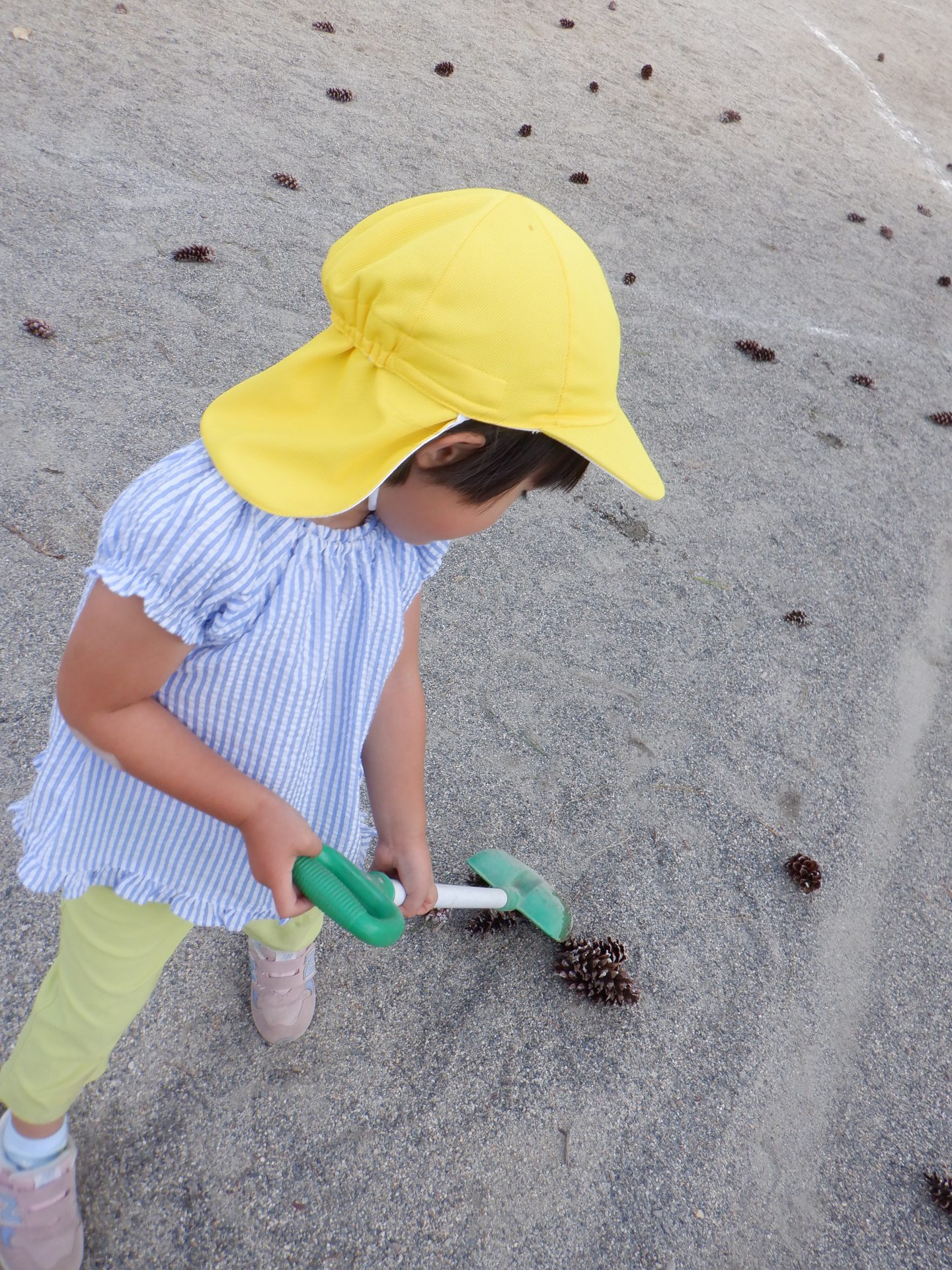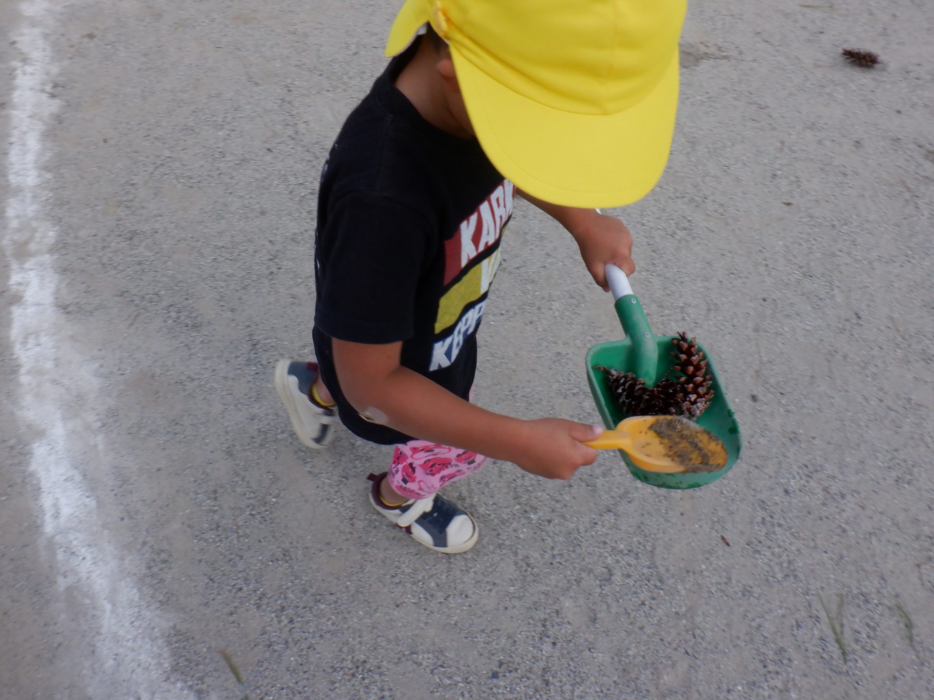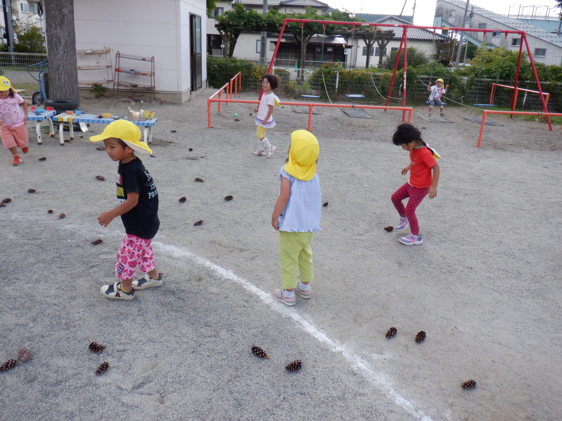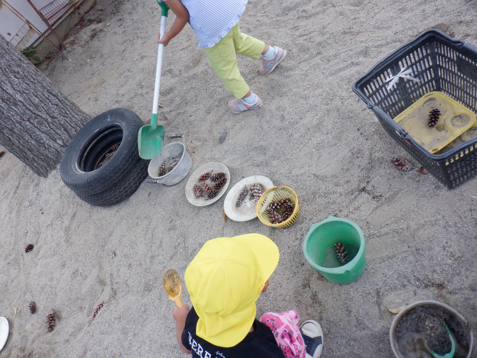 風のいたずらか思いがけないプレゼントを貰い、松ぼっくりを集めて感触を楽しみ、ごっこあそびへの材料へと遊びが膨らみました。