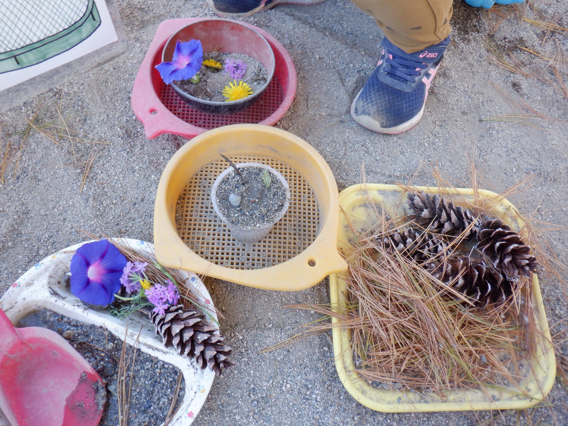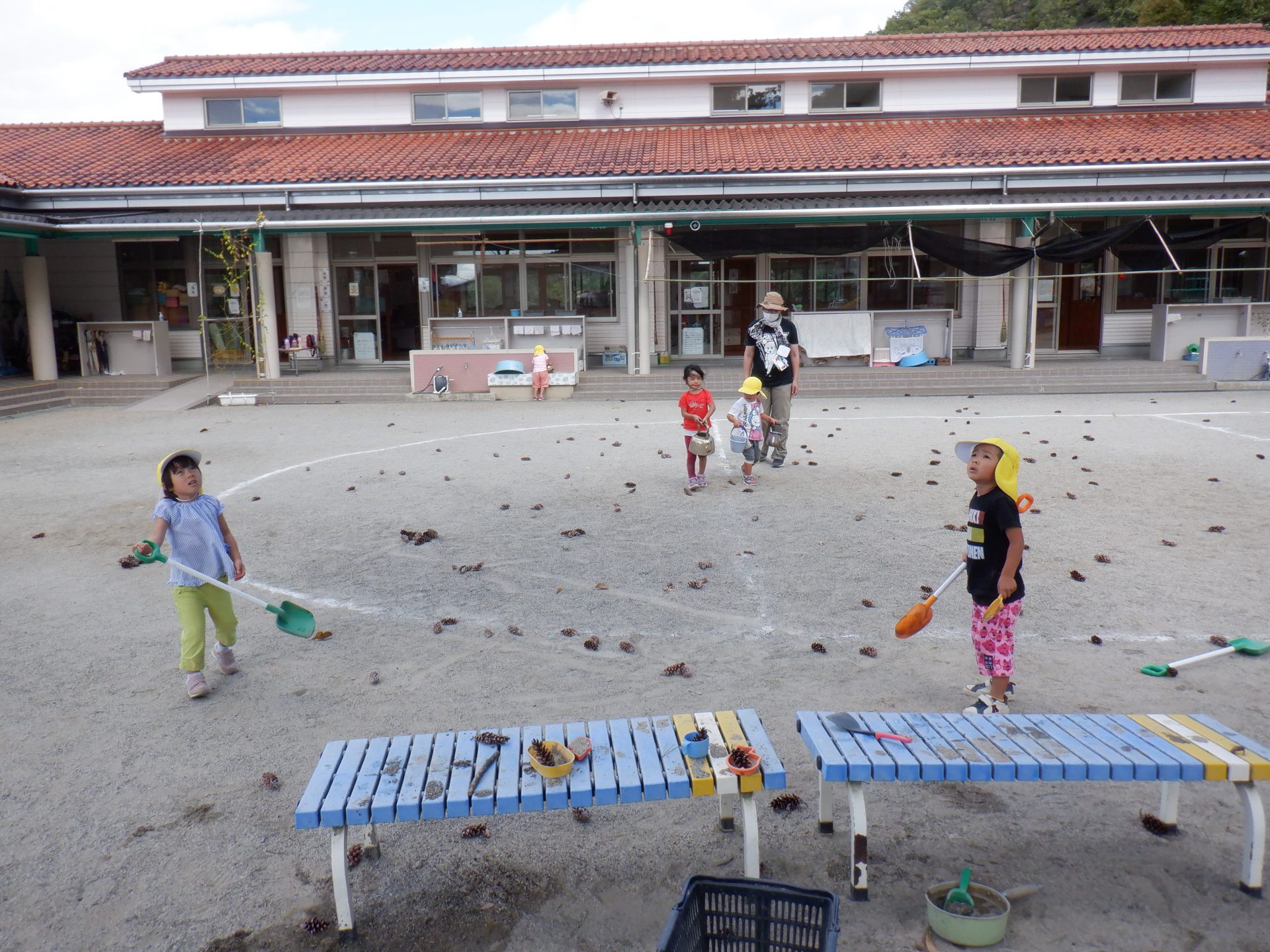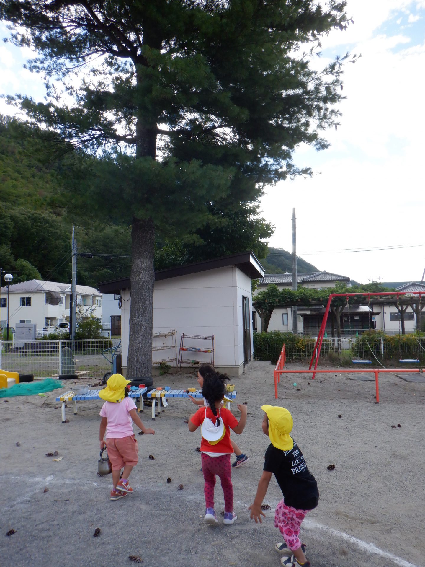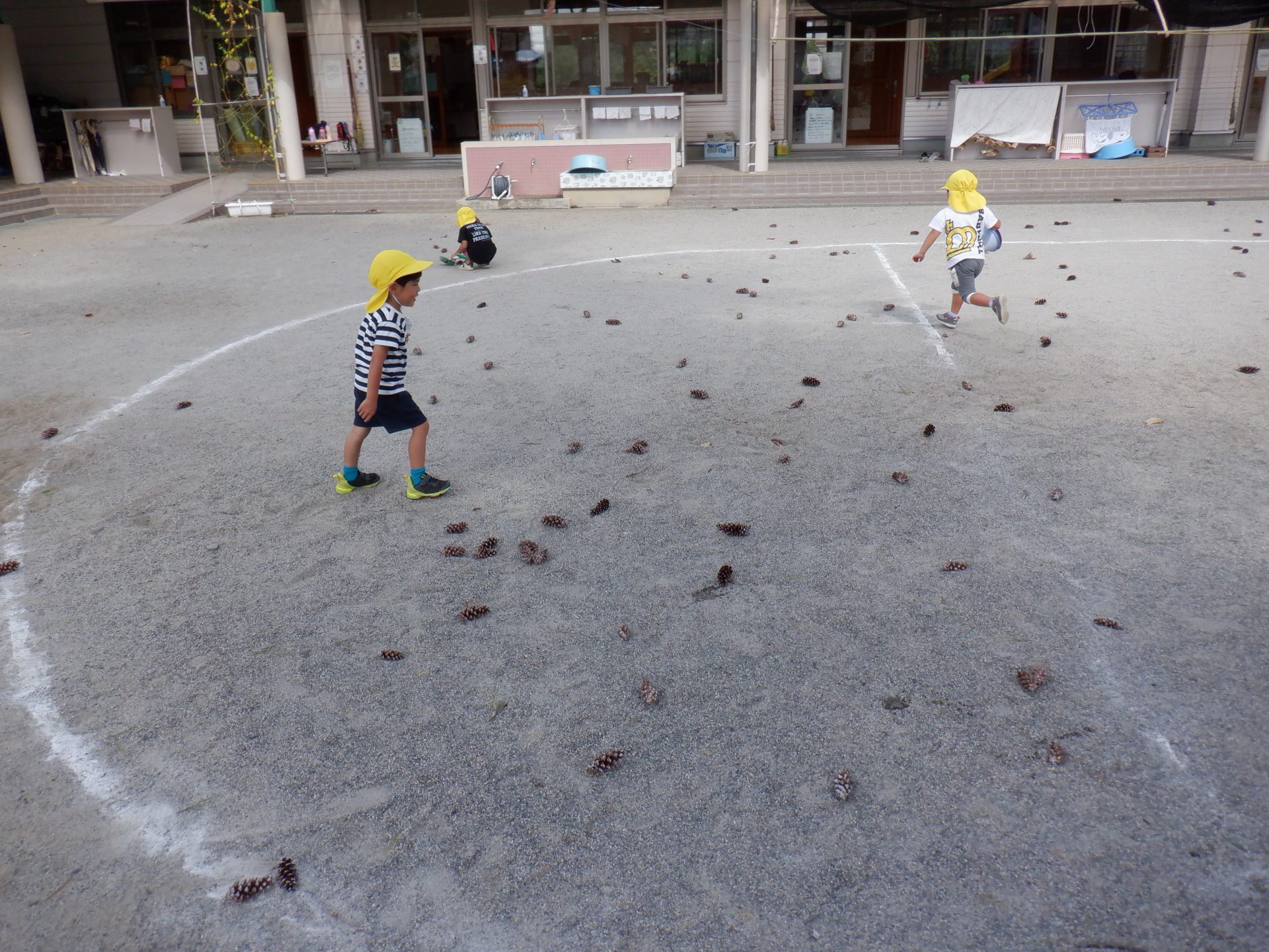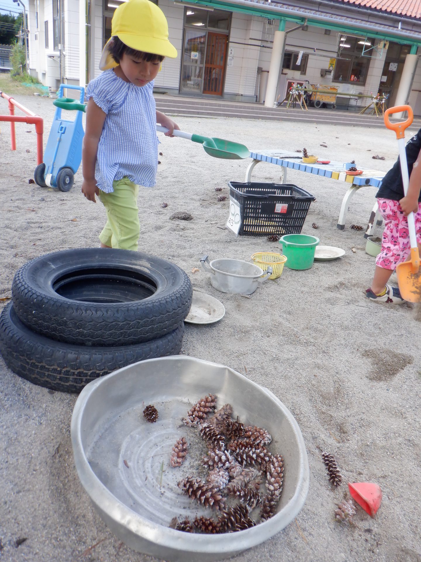 風のいたずらか思いがけないプレゼントを貰い、松ぼっくりを集めて感触を楽しみ、ごっこあそびへの材料へと遊びが膨らみました。