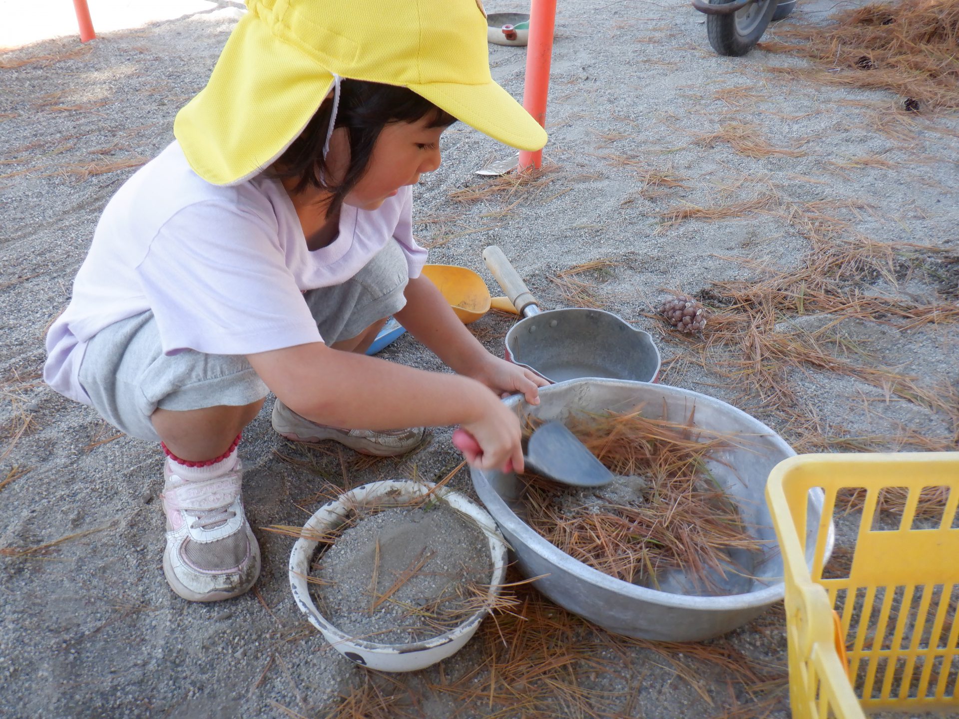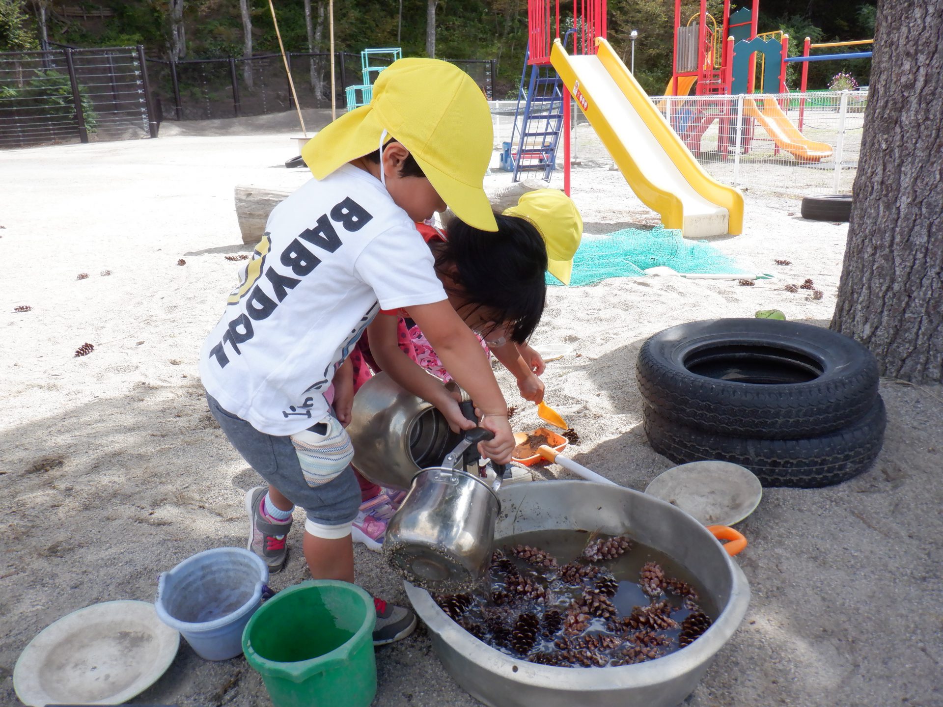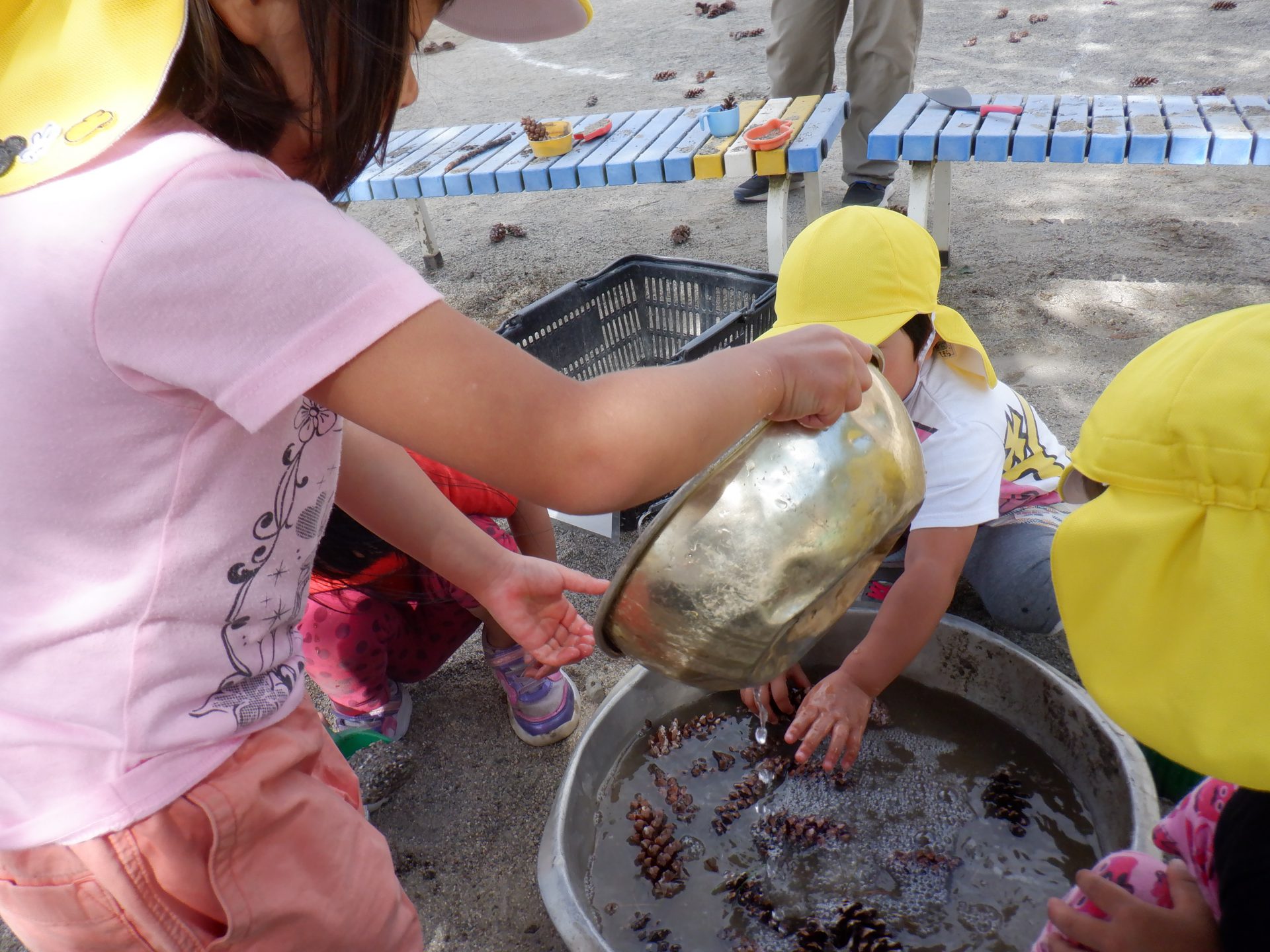 たくさん落ちて来た松ぼっくり、みんなで集めてお料理が始まりました。
