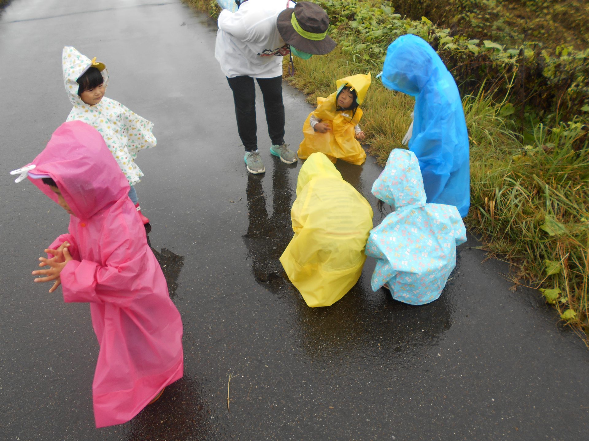 道路を歩くと水に泡ができたり、カッパに落ちる雨粒の音に気付いたり、水たまりに入ったり、雨の日ならではの生き物に出会えたりと普段とはまた違ったお散歩を楽しめました☆